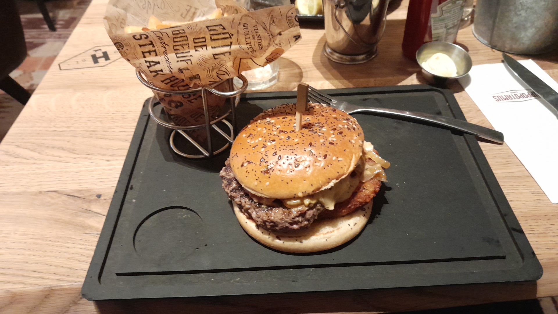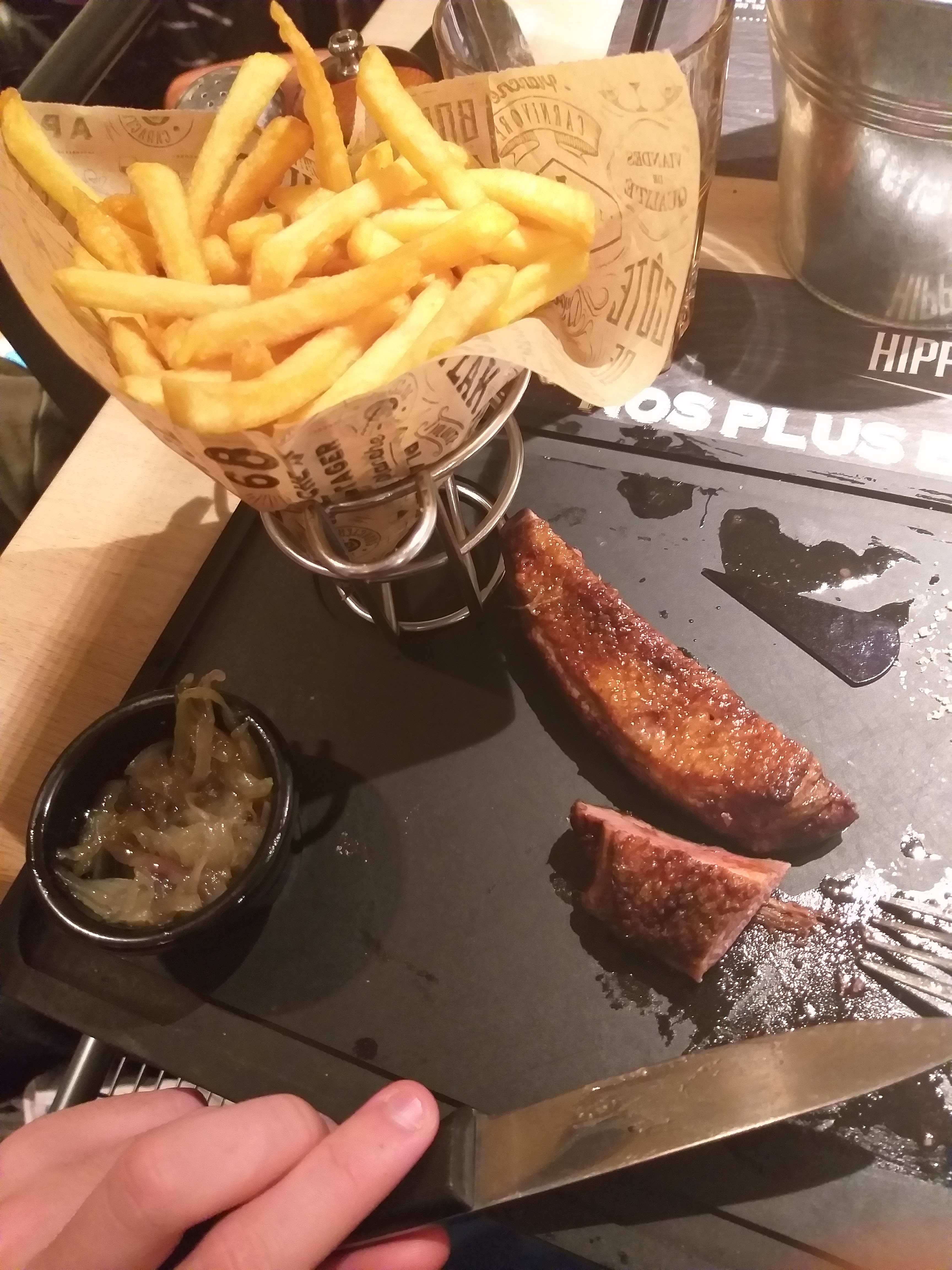 Faux filet de 200 Gr dont presque 50Gr de gras (tout le contour) donc ça ne fait finalement pas beaucoup à manger. Les frites sont moyennes mais ça va. La sauce béarnaise est beaucoup plus une sauce au poivre. Côté service j'ai eu l'impression qu'à un moment que le personnel était pressé que nous liberions la table, or nous étions là depuis 45 minutes et nous avons attendu 25 minutes qu'on nous serve nos plats. La serveuse a tenté de débarrasser mon assiette alors que je n'avais pas terminé mes frites. Sans demander si nous avions terminé.