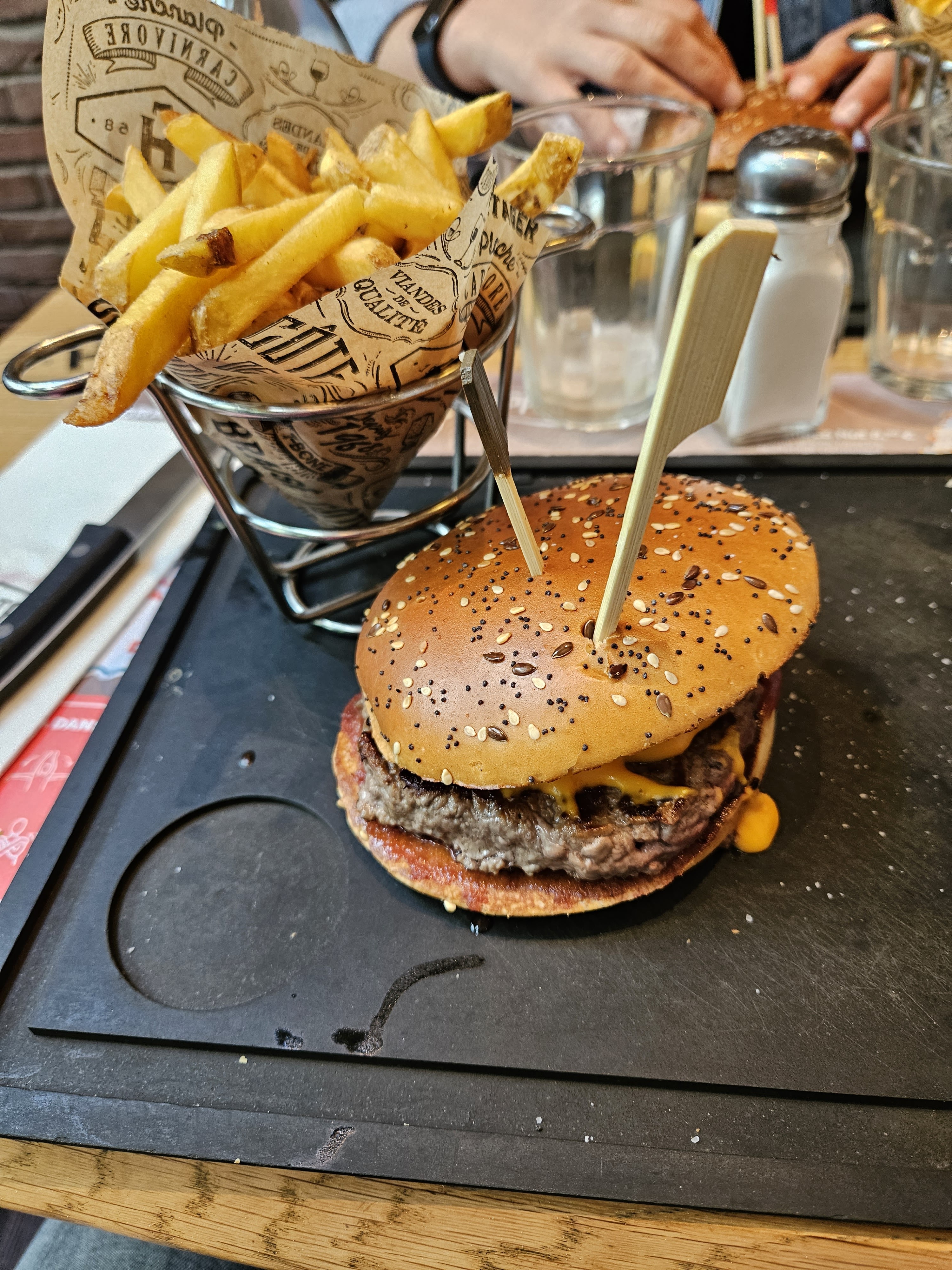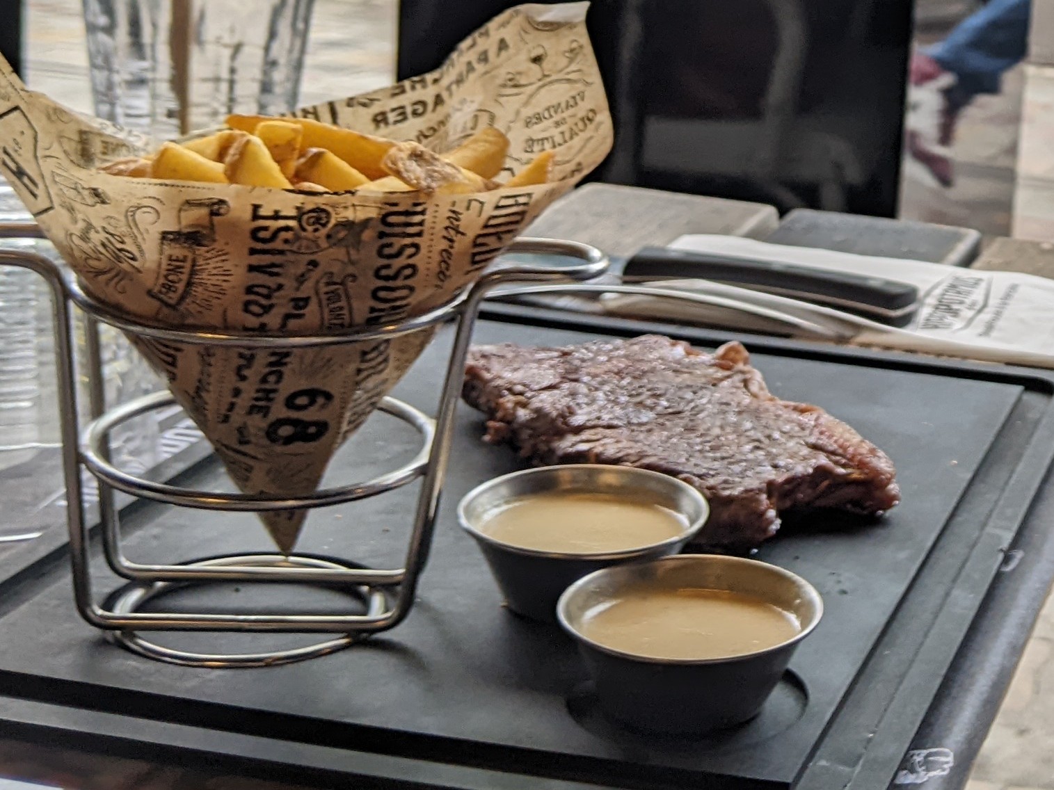 A notre arrivée nous avons été placé près du bar en face de la porte donnant sur les cuisines avec un bruit perpétuel de vaisselle, ra le bol de manque de considération du client. Pour la garniture (frite) un petit cornet de rien du tout, gros coup de gueule. Bonne qualité de la viande. Service correct. A mon prochain passage cela ne se passera pas de la même manière. Merci au manager !!!