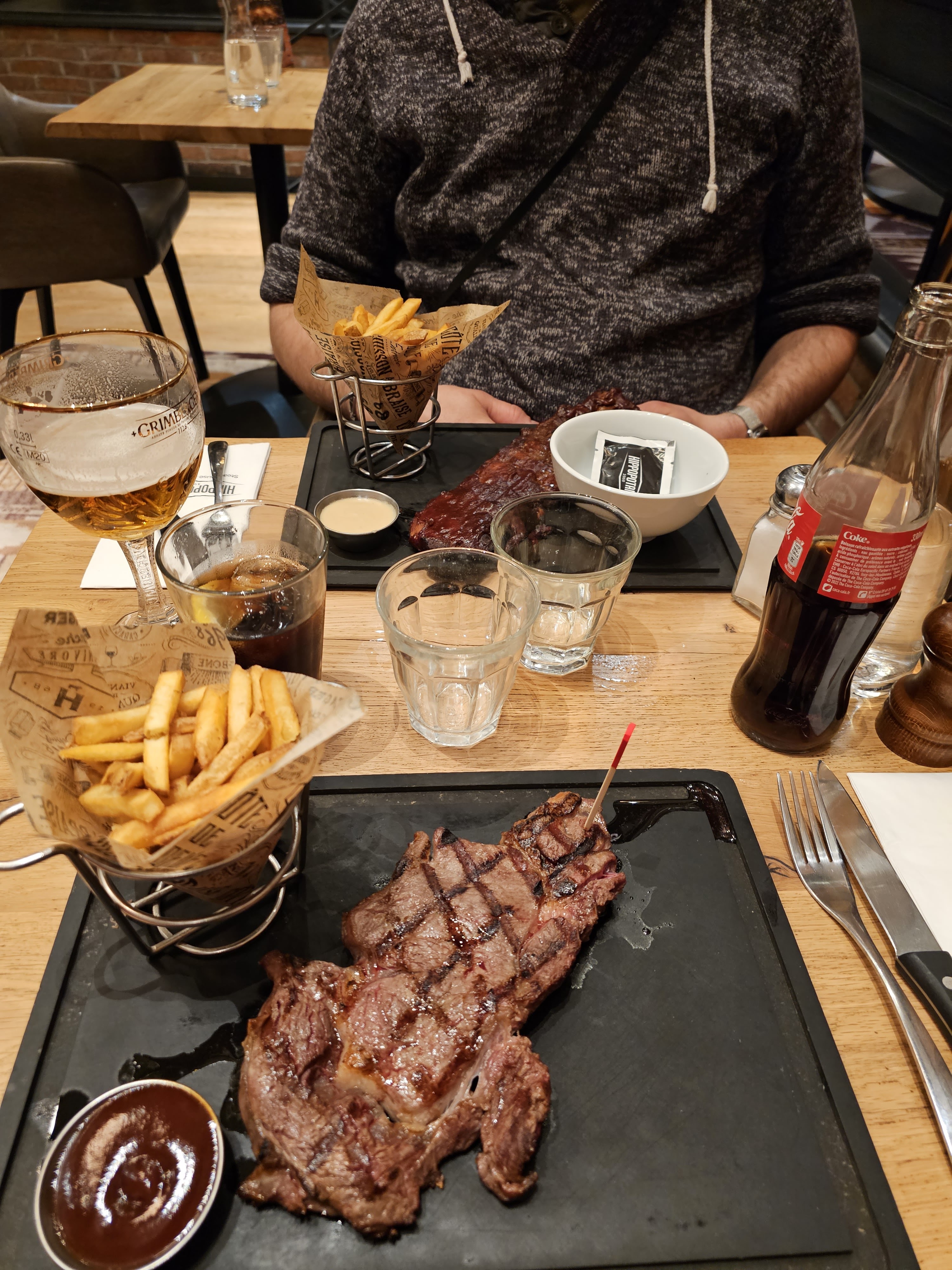 Restaurant agréable bien qu'assez bruyant et un peu sombre selon les emplacements. La viande est très bonne mais les portions petites, notamment concernant les accompagnements (frites et salade). Le dimanche midi est sans doute un jour avec beaucoup de clients mais le service était un peu léger : de la bonne volonté mais long et pas très professionnel et qui aurait pu passer pour être désagréable si on exclut le nombre de clients à servir.