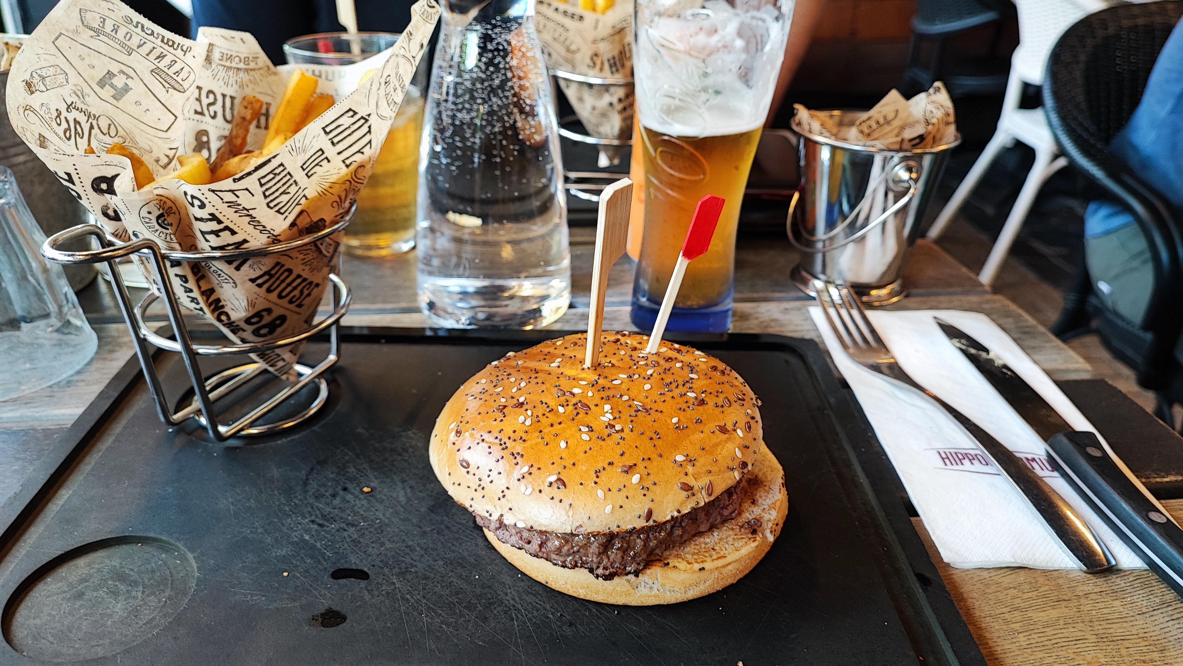 Le vin en carafe : une abomination ! Ça pique, ça manque de fraîcheur... L'eau c'est très bien ! Le plat : j'ai pris une pièce de boeuf. Cette dernière était très nerveuse et demandait énormément de mastication... Pas vraiment de saveurs, c'est dommage pour un steakhouse... Les frites étaient bonnes et les sauces également. Niveau service, je trouve impressionnant que quelque soit l'hippopotamus, le serveur ne retient jamais la commande et se trompe souvent dans les sauces... Si les accompagnements n'étaient pas en illimité, je dirais que ce n'est pas un bon rapport qualité-prix... Je suis donc déçue par la qualité des viandes et du vin. Ne proposez pas un vin qui ne met pas en valeur notre pays ! Ça fait honte !