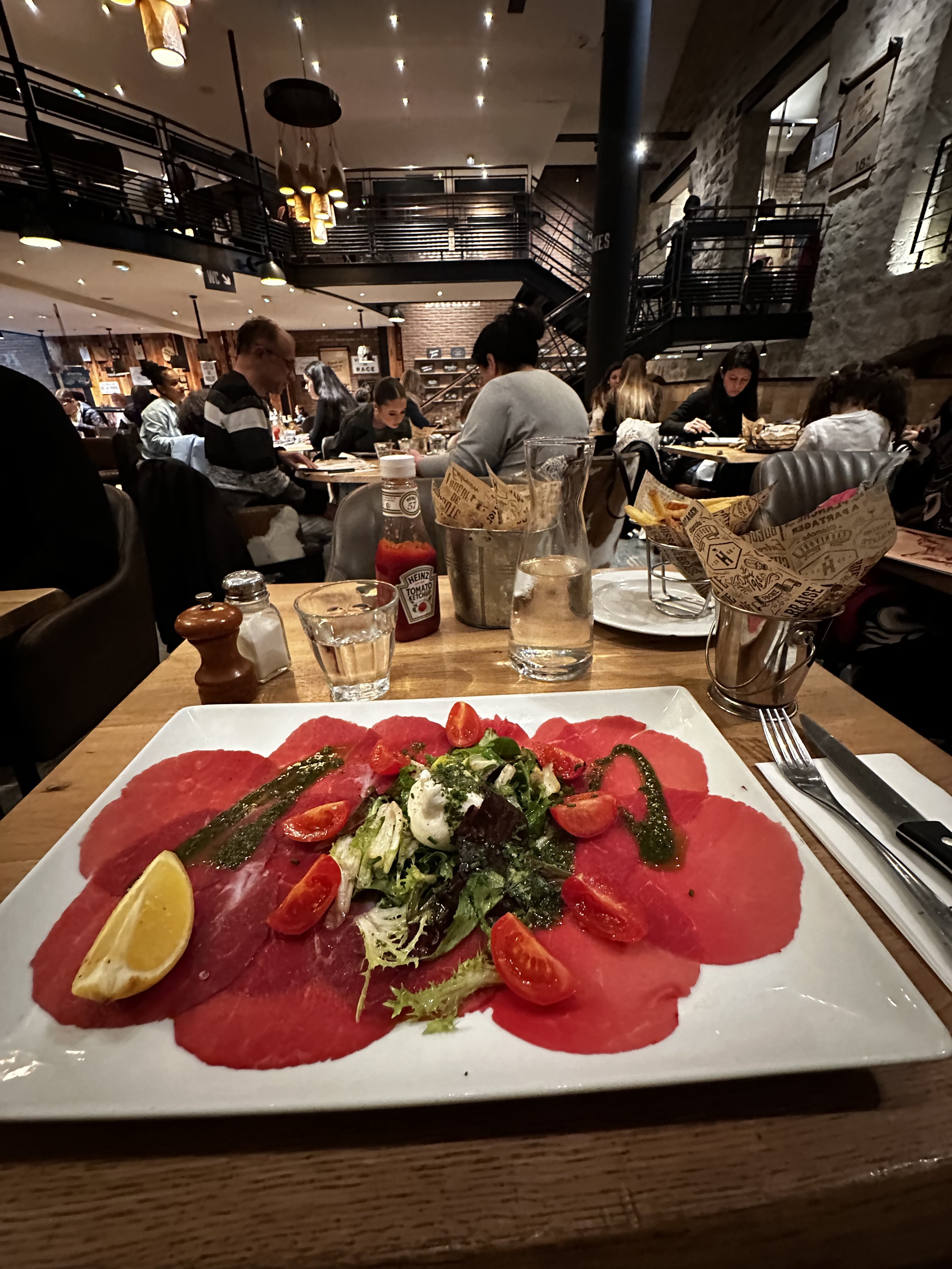 Mon tartare était bon , la viande de qualité , l'emplacement du restau avec sa terrasse est agréable. En revanche le service est complémentairement désorganisé , on ne sait pas qui s'occupe de notre table , il faut demander à plusieurs reprises le pain , l'addition et ce a différentes personnes du staff . En revanche mention spéciale pour une serveuse qui s'est occupée de nous a la fin du repas qui s'est avérée être un vrai rayon de soleil avec sa bonne humeur .