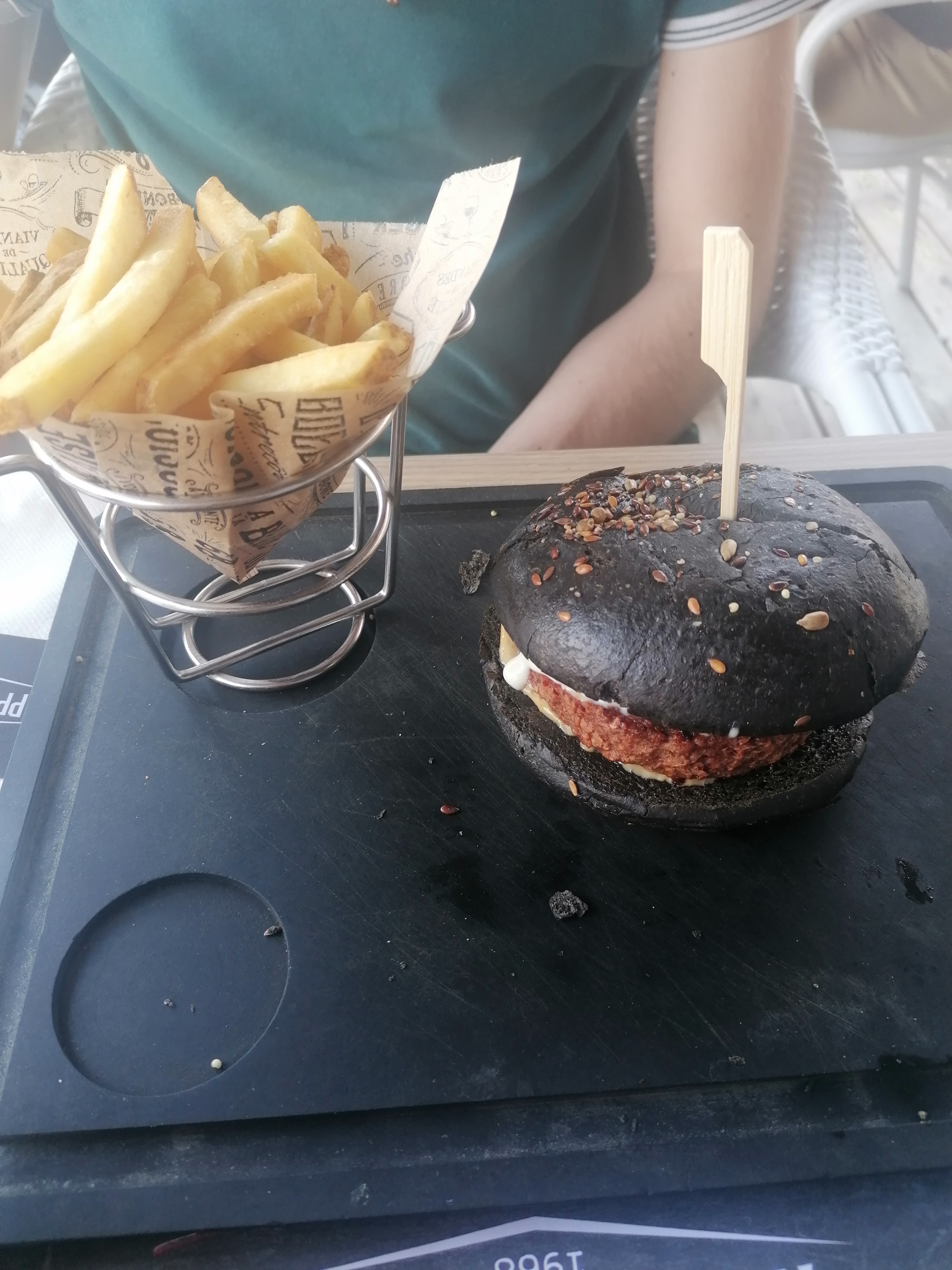 Le pire burger veggy jamais mangé pour 19€ ! Pour commencer il n'étais pas végétarien puisque le pain est à base d'encre de sèche (calamar qu'on doit forcément tué pour récupérer l'encre) en plus on paye une option supplémentaire pour avoir la version végétarienne. Depuis quand cultiver des féculents coûte plus cher que nourrir un bœuf ? ça aurait pu s'arrêter là mais franchement deux tranches de pain avec un steck j'appelle pas ça un burger. Les frites était fades et on n'avait même pas de sauce pour aller avec. Je m'attendais à rien en allant manger dans cette chaîne de restauration mais la c'est vraiment nous prendre pour des c**.