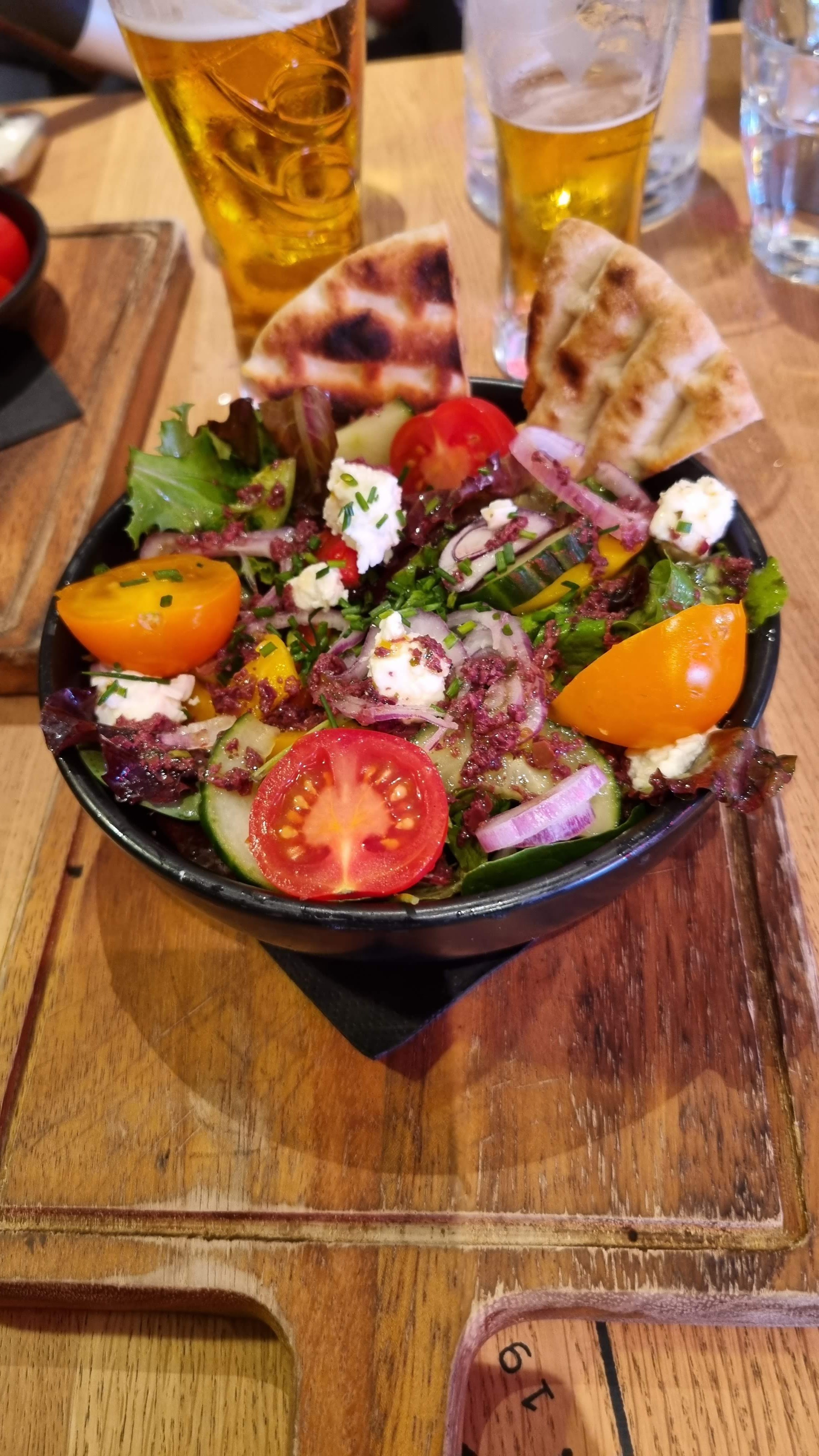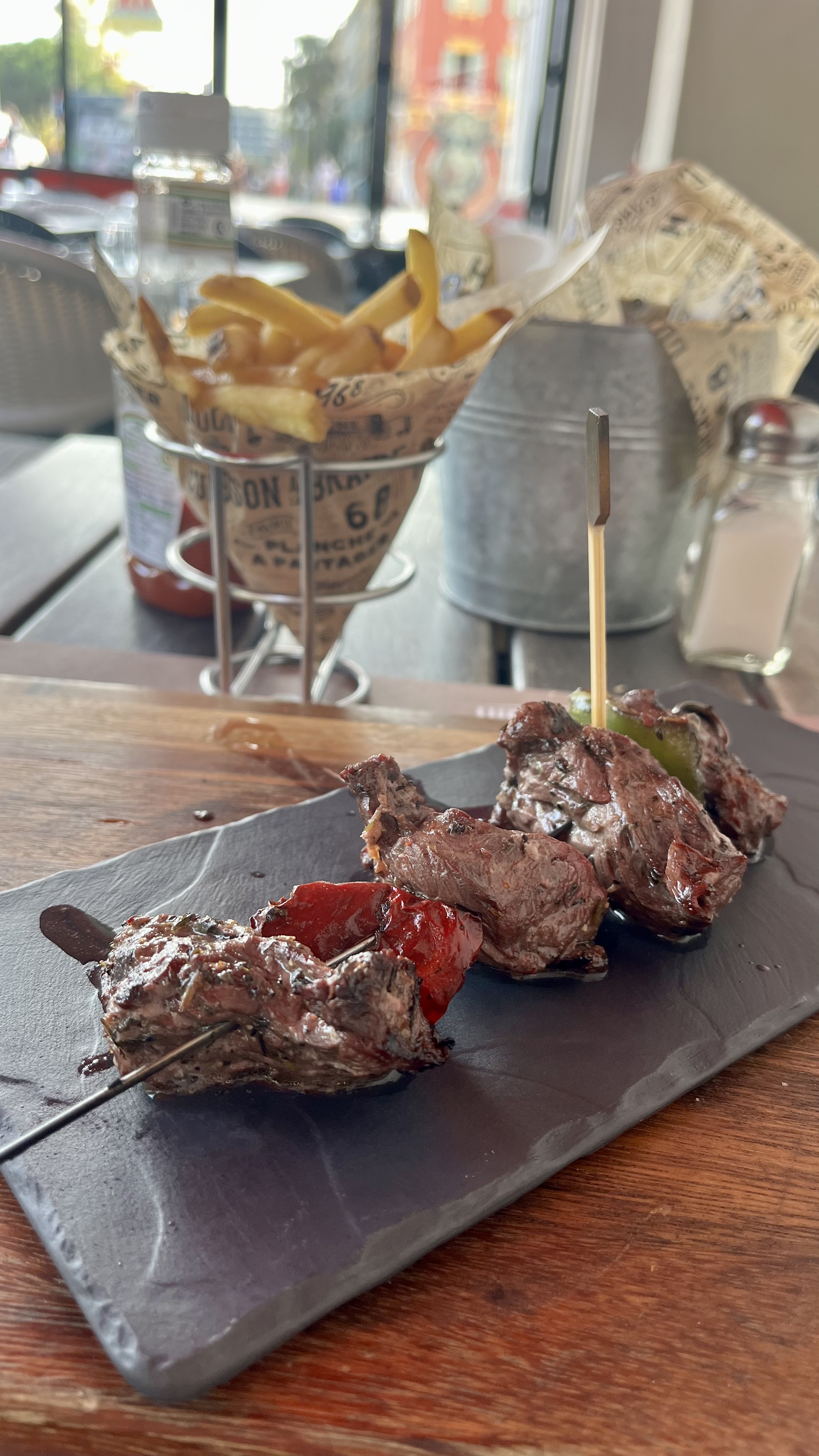 La nourriture était fantastique, tout comme le vin. Commandé la brochette de steak, pomme de terre au four. Le pot cuit au four était accompagné de crème sure - luxuriante! Et le vin était délicieux ! Ma seule critique constructive serait que le steak était un peu sous-cuit - même si je demandais un vin moyennement rare, il était plus cru. C'était toujours agréable et vraiment plein de saveurs. Mon seul autre commentaire serait de vous enregistrer plus fréquemment sur vos tables et de sortir les boissons plus rapidement - vous pouvez gagner très facilement de l'argent sur les tables si vous servez les boissons dès que possible et vérifiez quand elles sont vides s'ils en veulent une autre. 😉 Ne laissez pas le client vous chercher, car il ne se concentrera pas sur votre magnifique nourriture ! J'ai également adoré les petits extras de chips et de pain sur la table. Dans l'ensemble, c'est un bon repas !