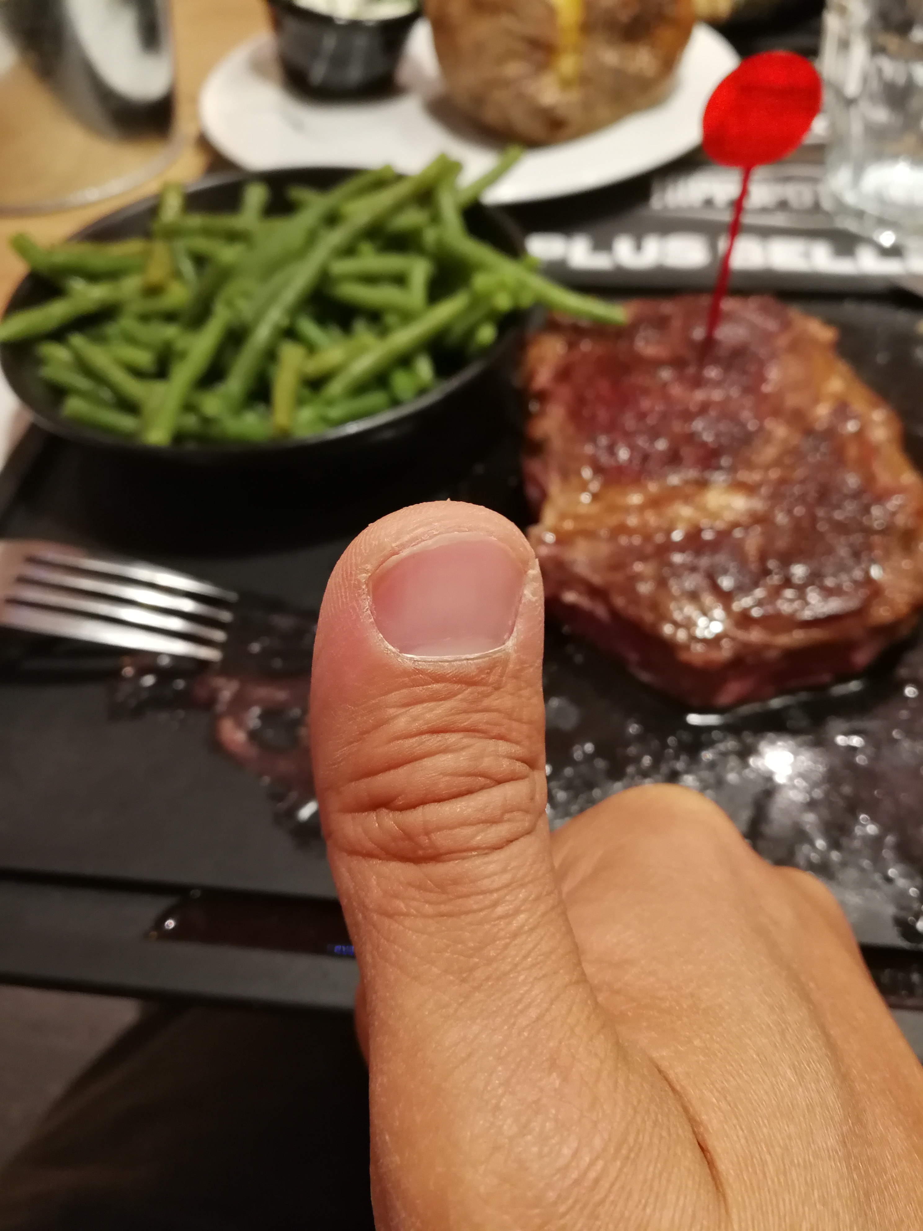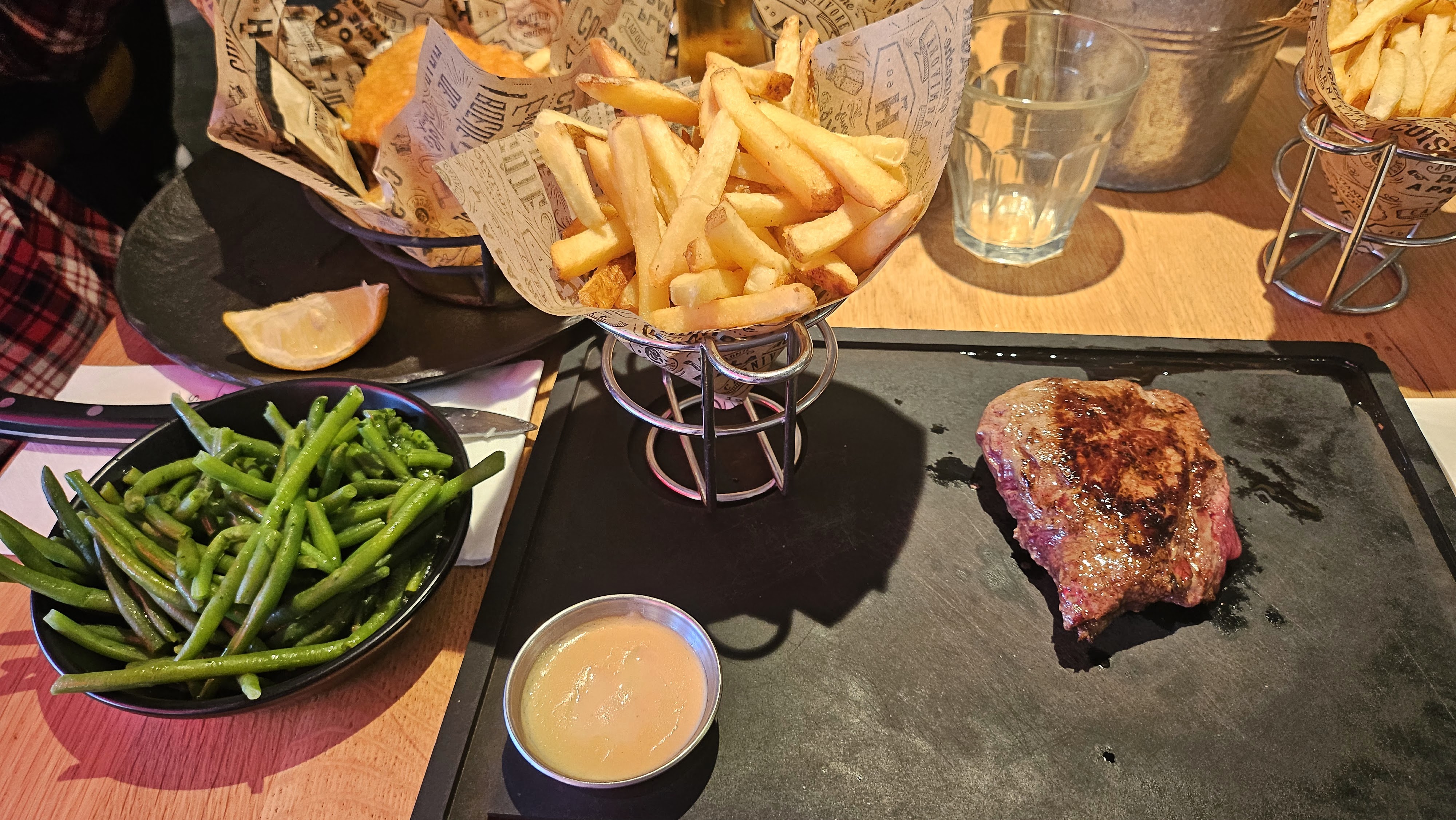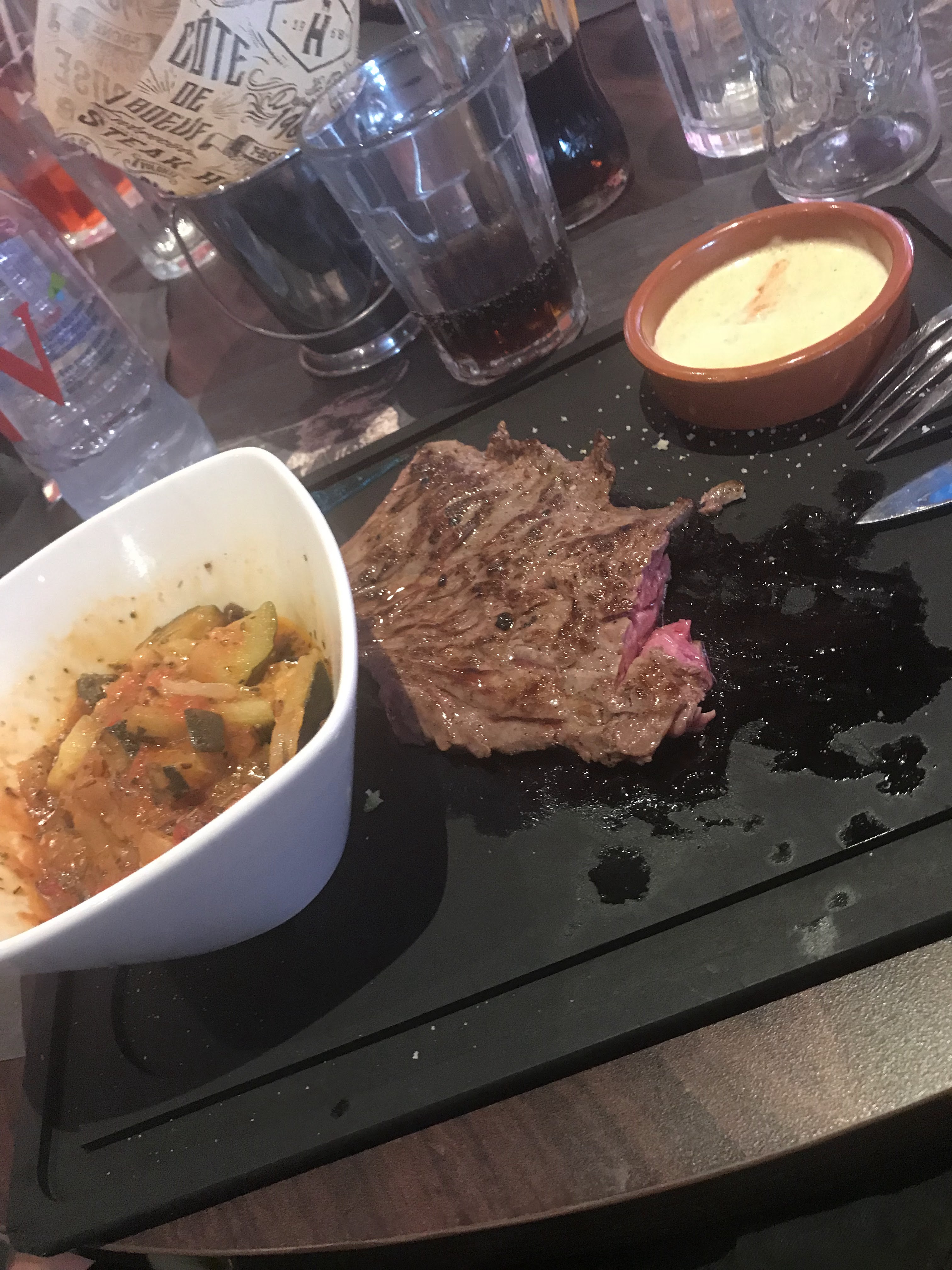 Les steaks ont-ils rétréci au lavage ? Accueil et service agréables même si le personnel manque un peu de professionnalisme, ambiance conviviale, viandes et desserts bons et goûteux mais… portions ridiculement petites bien loin des photos alléchantes et généreuses qui apparaissent sur le menu ! Un steak à la carte à 19.90 € qui doit peser au maximum 150 g, errant dans une grande assiette avec une mini cuillère à café de sauce au poivre et un mini ramequin de légumes ou de purée, ce n’est pas admissible. Certes, il y a l’inflation mais quand même, c’est exagéré… ce sont des portions pour kids pas pour des adultes. Dommage
