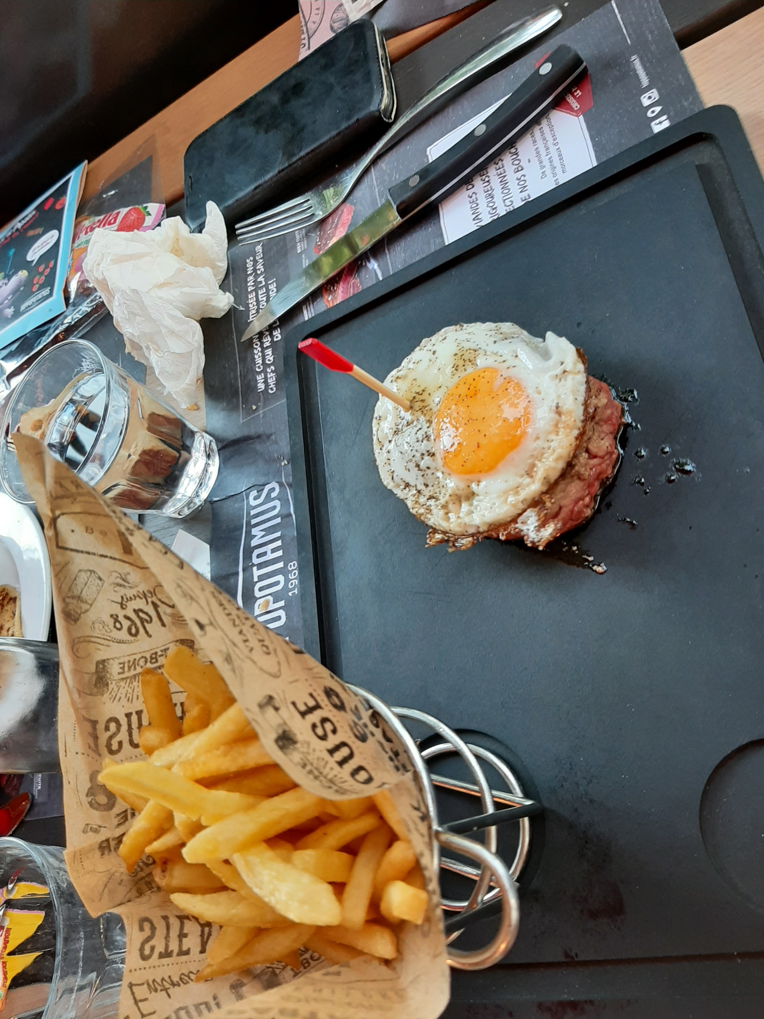 Nous sommes allés dîner hier soir et avons une fois de plus été très bien accueillis par le personnel du Hippopotamus. Nous avons choisi un haché italien et un steak au poivre, et la cuisson était parfaite. Les accompagnements de purée et de légumes grillés étaient délicieux. Je vous recommande vivement la profiterole en dessert, c’est une énorme gourmandise. Martine s’est occupée de nous avec beaucoup d’attention. Merci à toute l’équipe pour leur accueil. Le restaurant est bien décoré, les tables sont espacées, mais il peut être un peu bruyant lorsqu’il y a du monde.