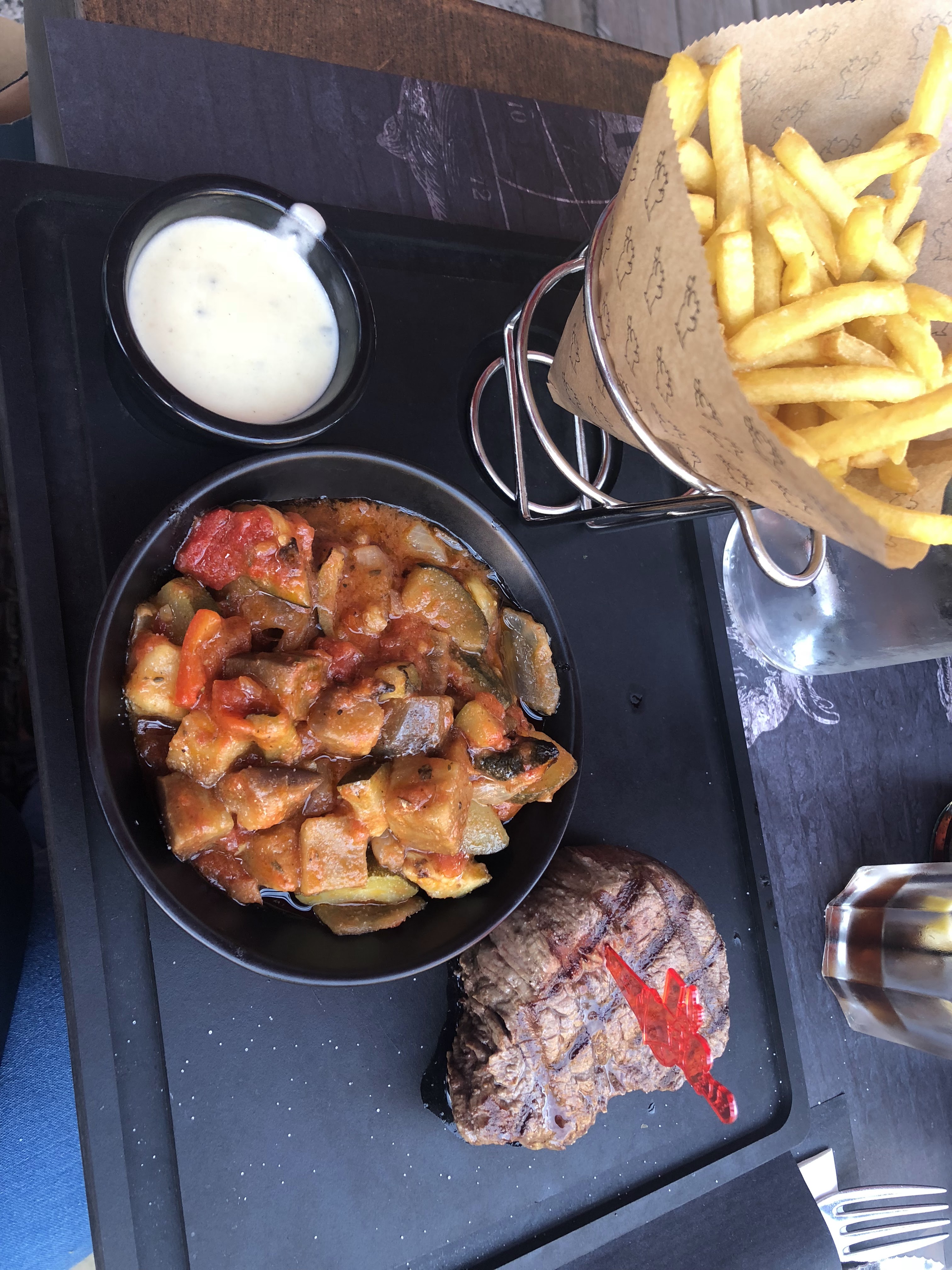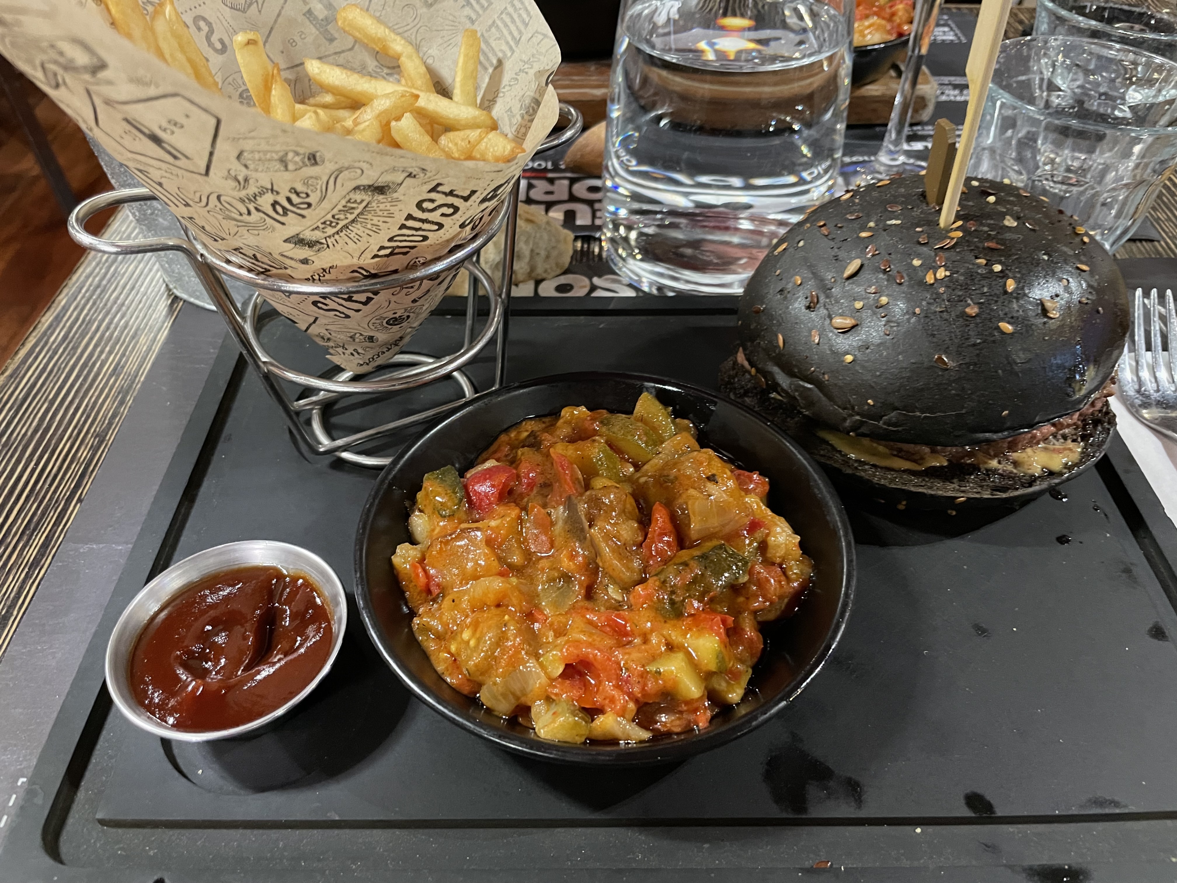 J’avais goûté le burger steakhouse dans un autre restaurant et j’avais adoré ; Bizarrement là je ne suis pas régalé, les frites décongelées sans intérêt et très bonne ratatouille : 17€ Très cher par rapport au délicieux Burger King d’à côté ! Le personnel est parfait et le restaurant aussi