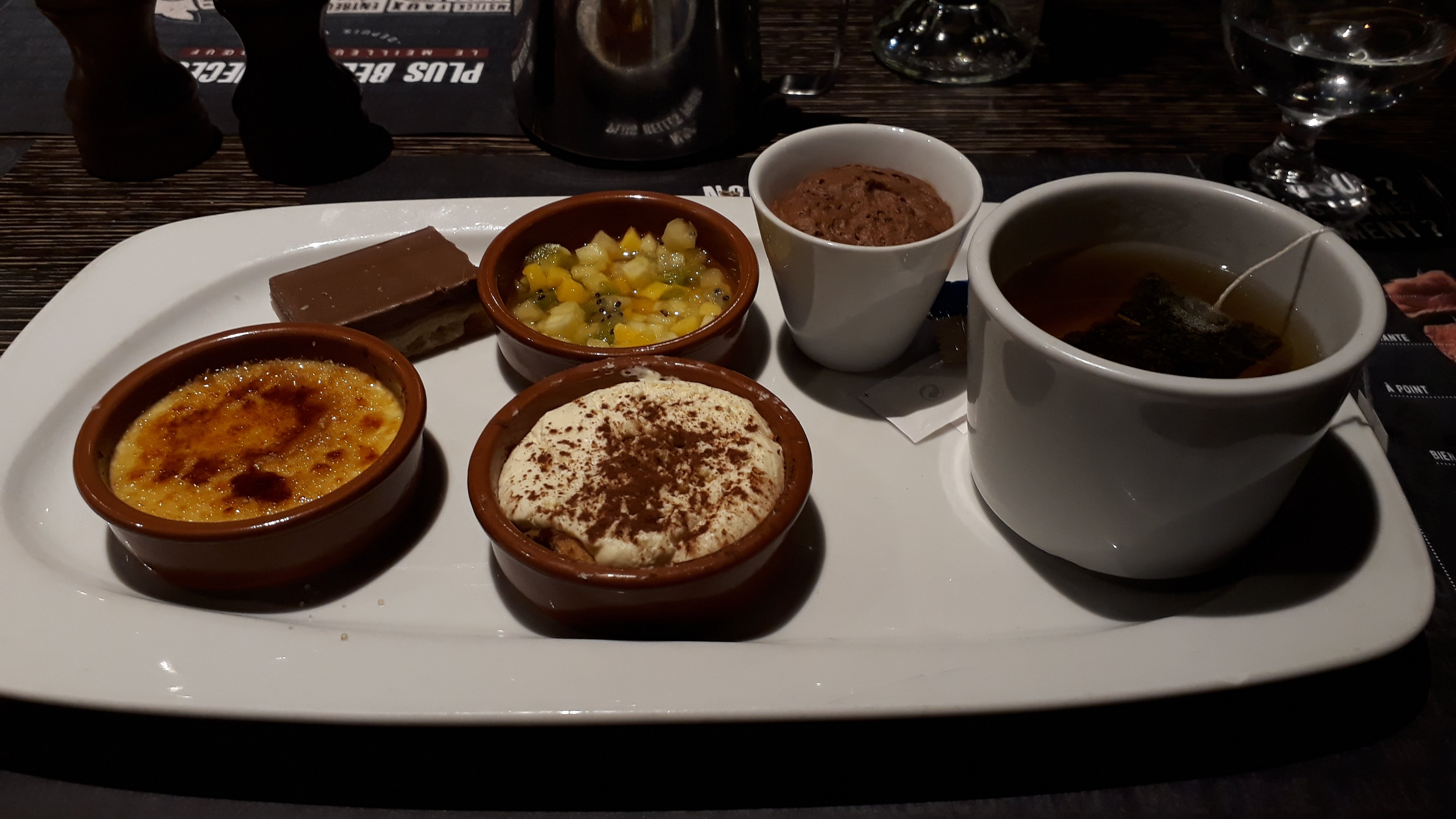 The food here is simply really good. However, the café gourmand is absolutely fabulous: crème brûlée, soupe de fraise, brownie à la crème, mousse au chocolat, 😋😋 😋