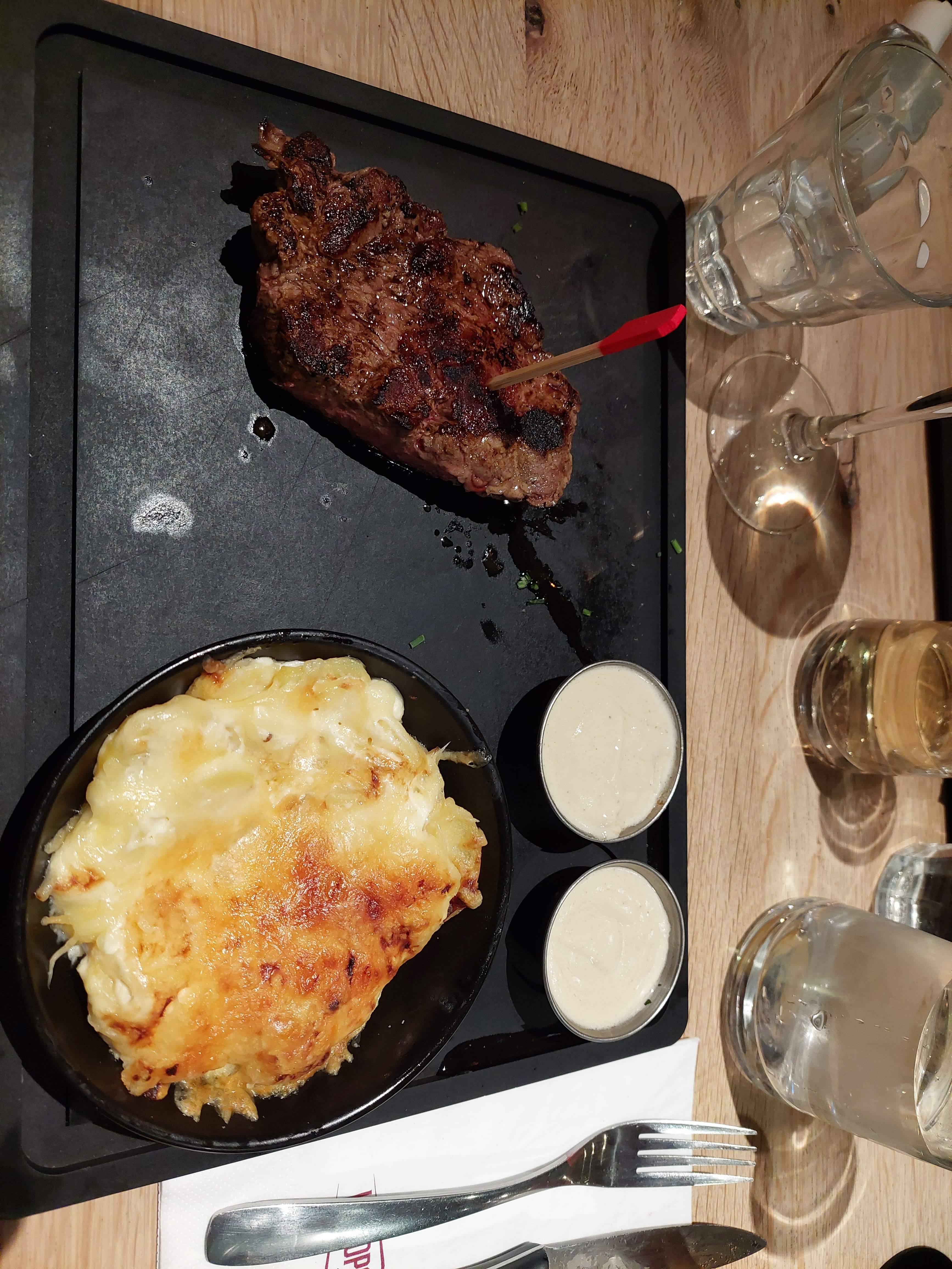Pour 25 euros j'ai eu une entrecôte parsemé de gras. Un vrai slalom géant pour trouver de la viande pas bonne. La béarnaise hyper grasse n'était pas bonne non plus. Seul le gratin dauphinois était mangeable. La serveuse a vu le problème et m'a envoyé le responsable qui a proposé de m'offrir un café ou un thé ce que je ne bois jamais. Cela c'est arrêté là. Je ne reviendrais pas.