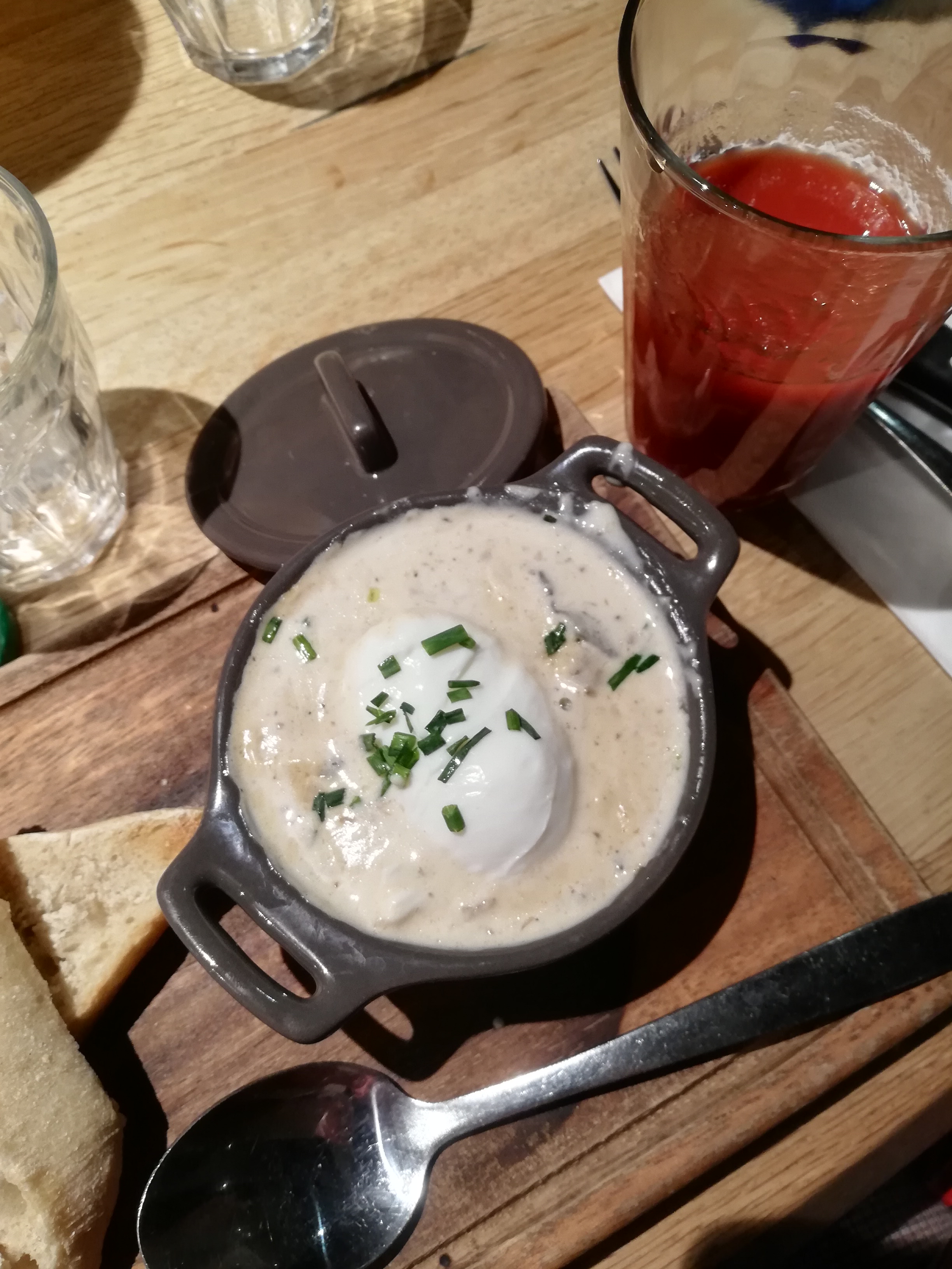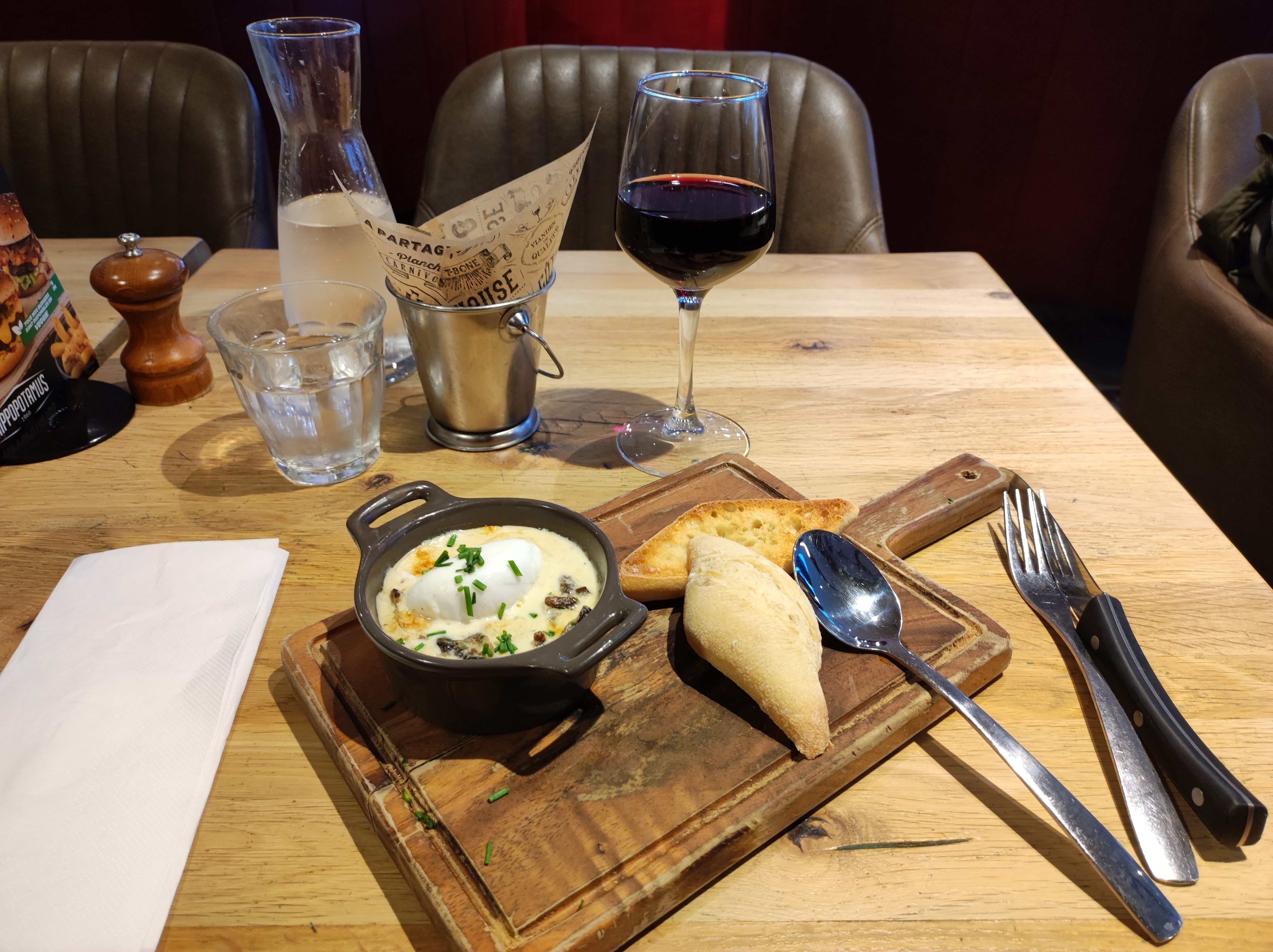 Je suis venue avec les 3 collègues le soir après une grosse journée de travail. Nous étions accueillis par Bonsoir Messieurs 😂 !. L'ambiance était chaleureuse, sur la table à côté, une jeune fille fêtait son anniversaire. Le feu de Bengale 🎆est sur son dessert🎉🍰. Les serveurs chantaient joyeux anniversaire ! Les bières🍻 pour mes collègues et le jus de tomate pour moi pour commencer. Mes collègues étaient enchantés de manger la viande grillée 🥩. Il manquait de persil sur une viande persillée. J'ai commandé un menu avec l'œuf parfait et fish&chips. 🍟 Toutes les frites qui accompagnent sont servies dans une cône de papier façon journal. Le dessert de mon collègue était de grande taille, les morceaux de viande sont grands. Cela fait plaisir pour mes collègues 🔝. De la cibulette était apportée en guise de persil manquant. Nous avons bien mangé. Le serveur avait de la bonne humeur 🙂. Ce qui est superbe, il y des pruniers fleuris devant le restaurant 🌸💯.