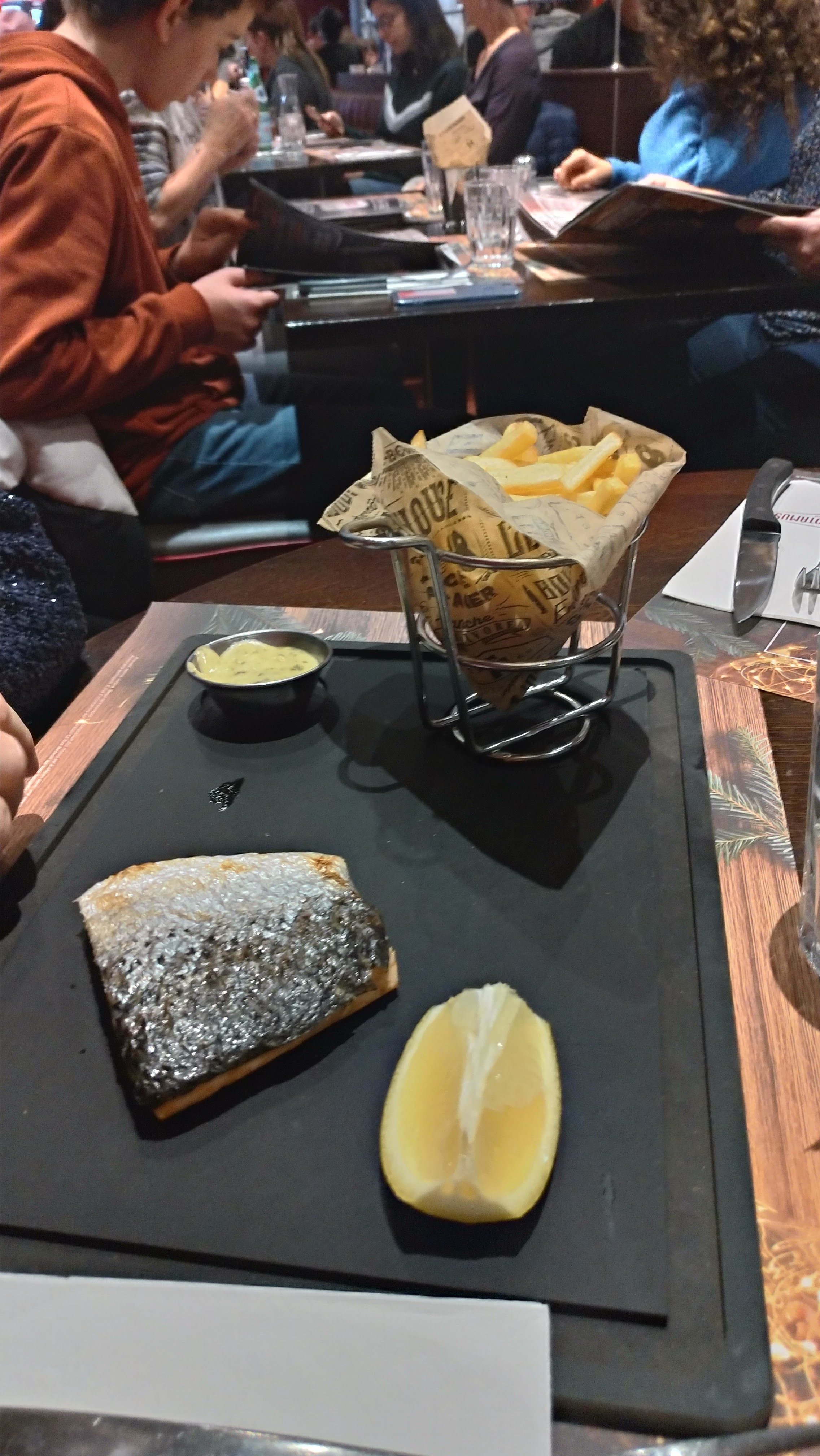 J ai commandé un fish and chips... tout est servi dans du papier... je me suis crûe dans un fast food... j avais un cocktail offert avec l application, c est la serveuse elle même qui a fait la manipulation sur mon téléphone, et au final je n ai pas vérifié l addition avant de payer..et bien trop tard , le cocktail était payé et non remboursable.... On ne m y reprendra pas deux fois....