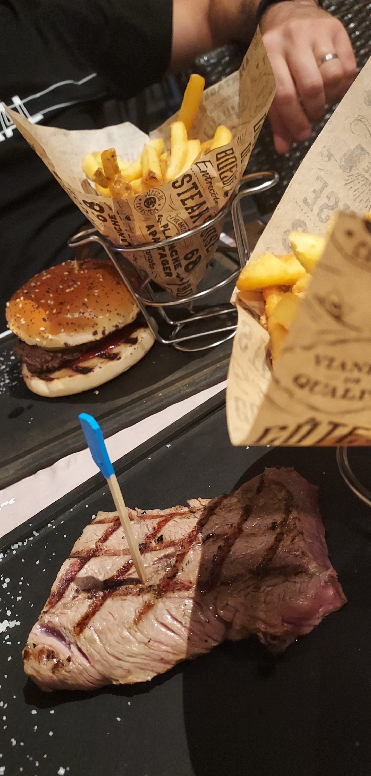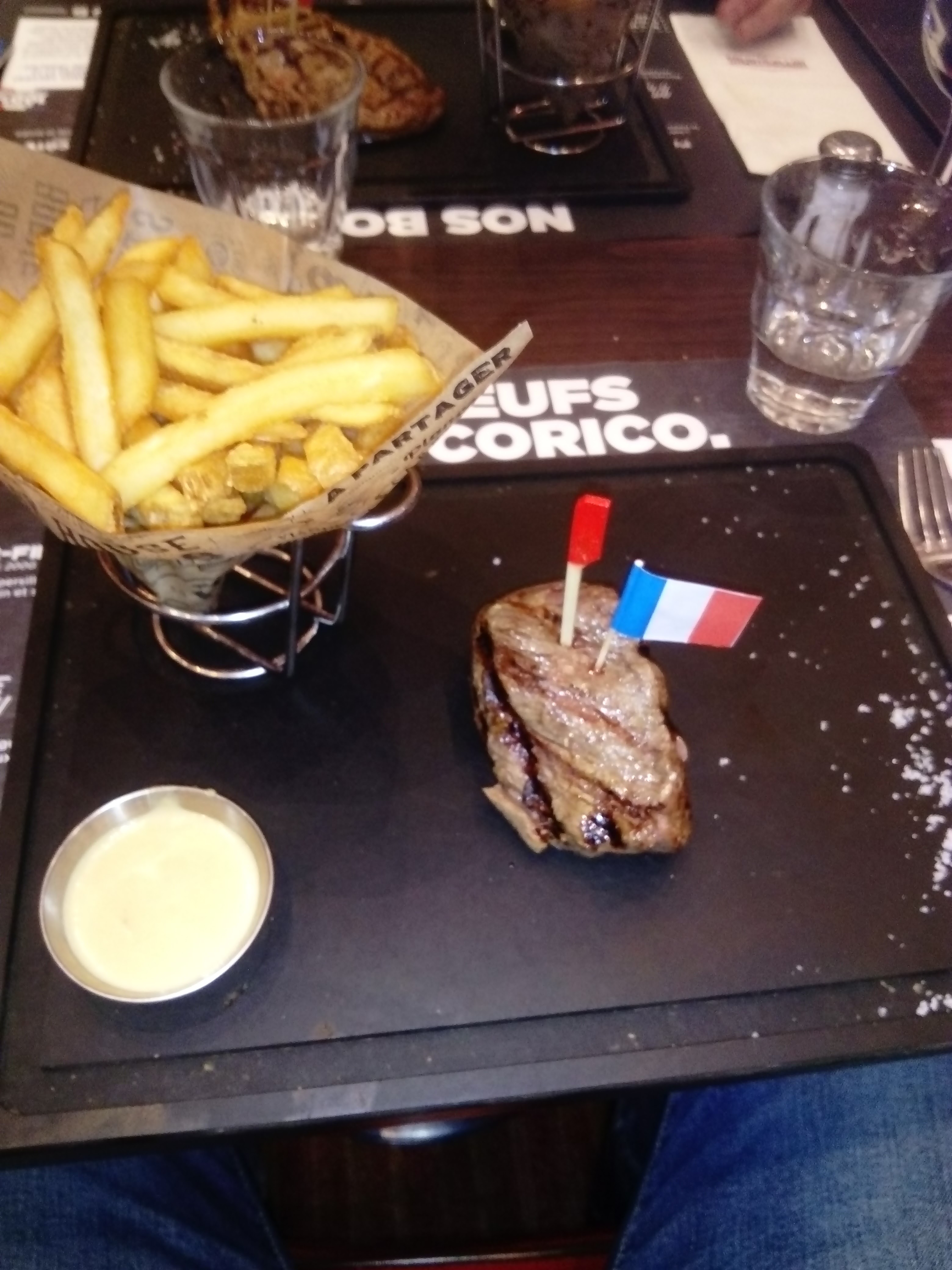 Nous avons mangé à 4 : burger saignant trop cuit, frites surgelées (inadmissible a ce prix là), sauce poivre liquide, riz (pour les animaux), faux filet froid. Il n'y a que l'onglet qui était très bien. Attention, c'était pas mauvais, mais à ce prix là on attend beaucoup plus. Service plutôt lent, mais il y avait du monde. Je pense que le problème se trouve au niveau du concept et pas au niveau du personnel : ce n'est pas un restaurant, mais plutôt un MacDo amélioré ... Eric le responsable est a l'écoute et c'est tout à son honneur
