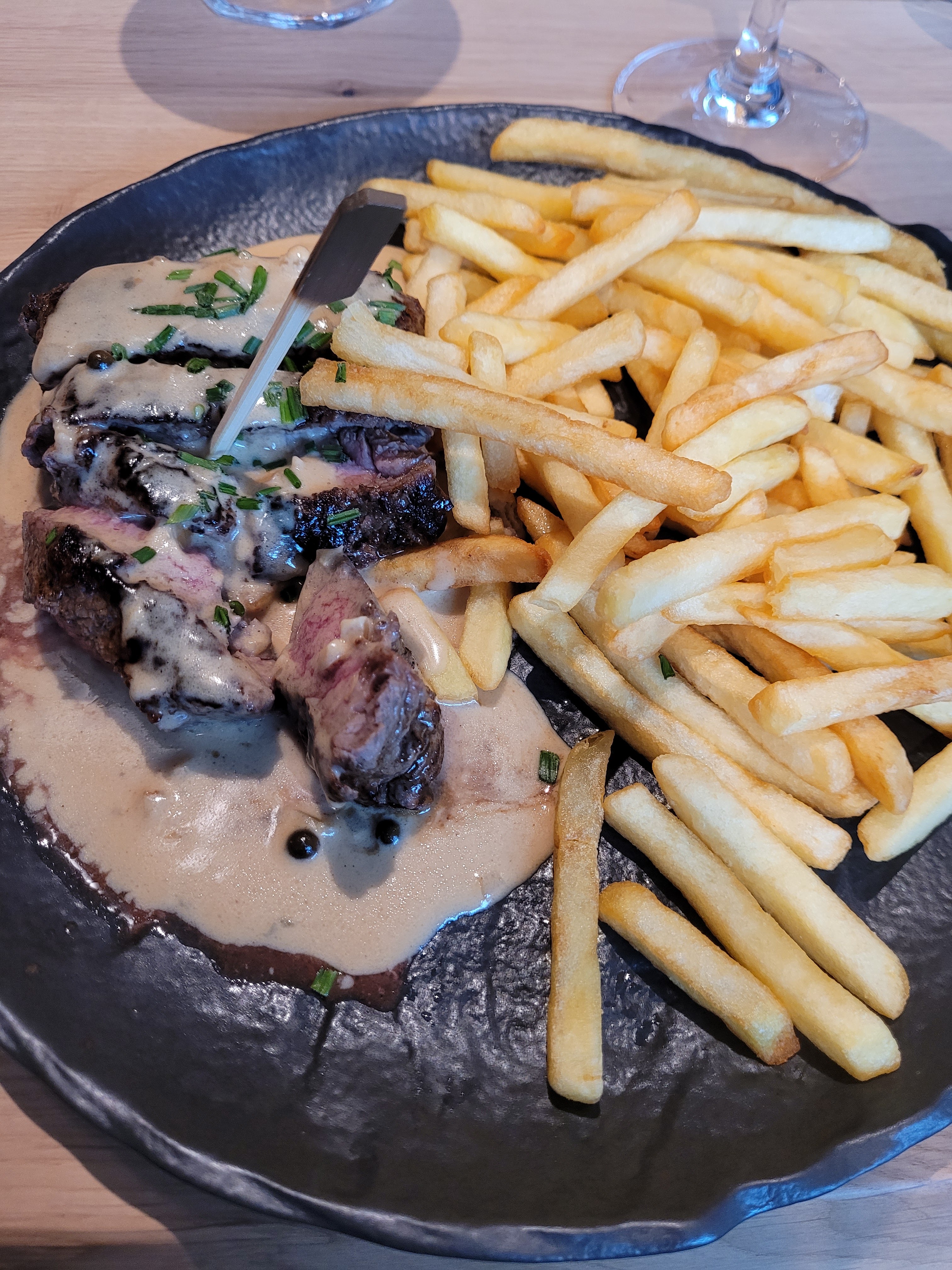 Steak au poivre extra mega pas moelleux, élastique. Pas facile à mâcher. On peut s’étouffer avec la pièce de boeuf. Heureusement la serveuse Léa et le responsable sont très professionnels, gentils et compréhensifs. Ils nous changent de plats sans problème. Pour finir, la brioche pain perdu est extrêmement sèche. Pour le prix de 8,90€, c’est du vol : une petite tranche de brioche avec une dose de Nutella, une boule de glace. C’est honteux de faire payer ce prix!!!! La présentation des assiettes à revoir très urgemment. Dans l’ensemble, l’équipe est très professionnelle. Les plats en questions ont été annulés sur l’addition.