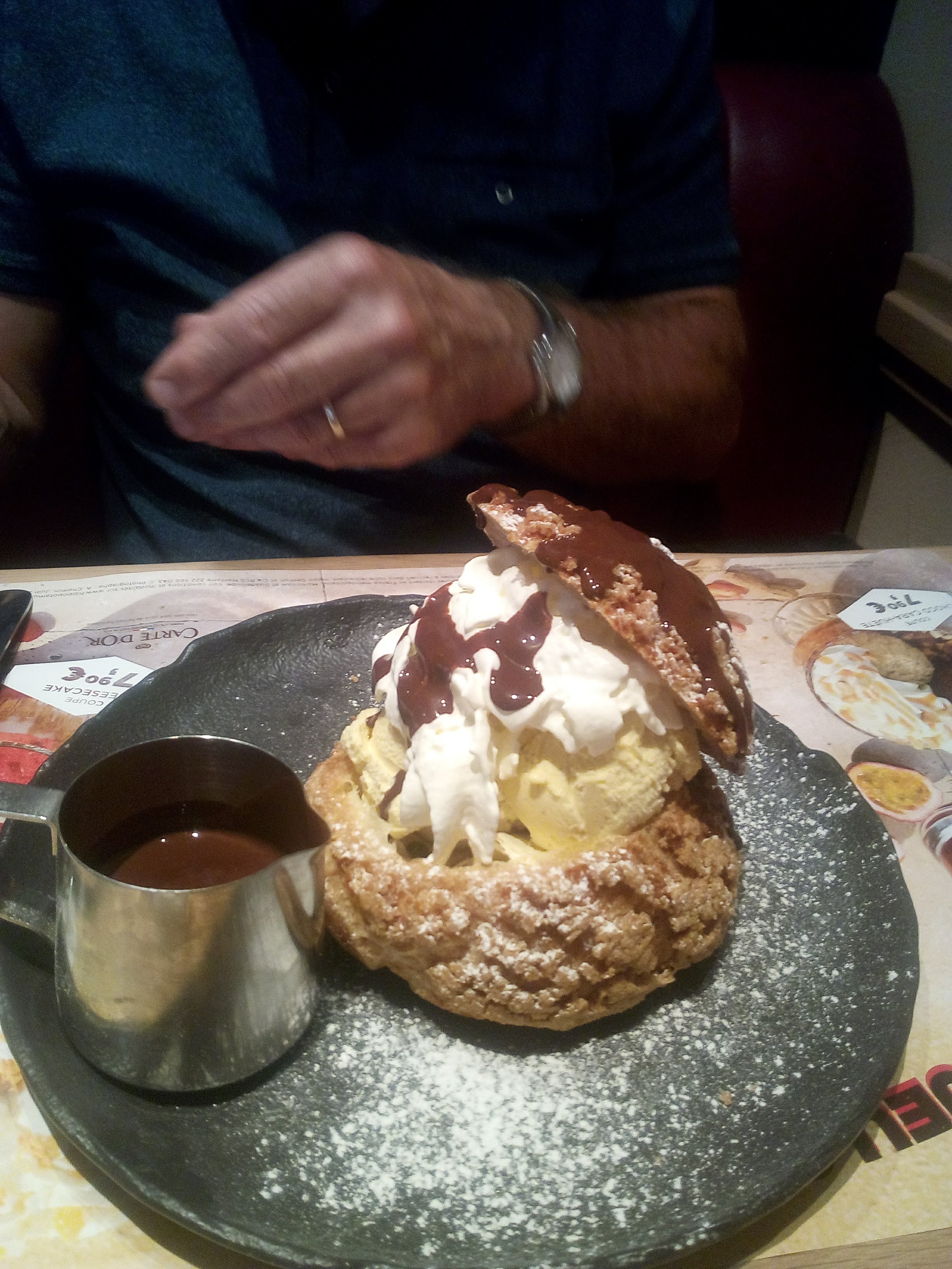 Placer a l entrée en plein courant d air horrible on nous a placé très vite pas d attente Plats servis chaud et très bon, le choux xxl est trop sucré la pâte à choux trop caramélisé Par contre j ai moin aimé que la personne qui nous a servi ne nous est pas encaissé LE POINT SUPER NÉGATIF C EST QUE LA PERSONNE QUI NOUS A ENCAISSÉ A PRIS MON Et que les chiens soient autorisés dans le restaurant et que tout les salariés aillent le caressé et qu il soit sur un fauteuil pas hygiénique dans un restaurant sauf si personne mal voyante Vraiment dommage 2 ème visite encore pire que la première Bout de plastique dans ma glace même pas une remise ou la glace offerte hallucinant !!!!