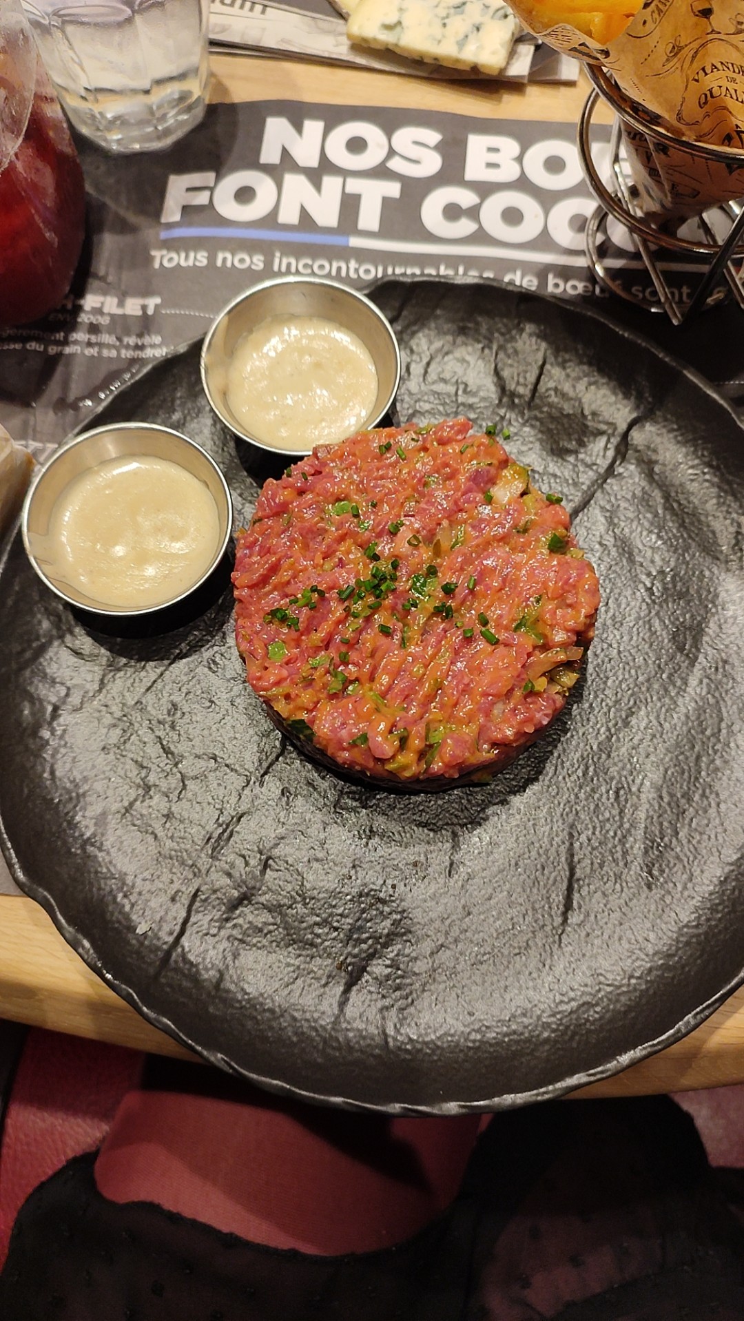 {mis à jour septembre 2023} (1 étoile en moins) Nous avons commandé une côte de bœuf pour 2 de 1 kilos, on m'avait dit au téléphone 55€, arrivées sur place nous avons été très déçus. Énormément de gras et cartilages...très peu de viande maigre, nous sommes restés sur notre faim, et un goût très amer quand finalement on nous dit que c'était 65€ la côte pour n'avoir quasiment rien mangé ! Nous avons fait part de notre mécontentement ! 65€ pour ça? Nous avons fait voir le résultat de fin avec toute la quantité de gras, cartilages franchement!? ça fait mal. On aurait mieux été dans un gastronomique à ce prix là. On nous a fait un geste commercial de 10% sur l'addition...mais c'était clairement pas suffisant sur une note de 119€... à deux qui s'est fini à 107€ ça reste relativement cher! 10% c'est ce qu'on a mangé sur ce qu'on nous a servi en viande! Rapport/qualité prix n'y ai pas du tout. Autrement le service a été au top. Nous ne reviendrons plus, à déconseiller. {mis à jour 09/2021} Première découverte de ce restaurant, Je vais commencer par les points négatifs et finir sur les positifs. -Ce que nous avons trouvé dommage c'était que le panier à partager n'avait pas été servis en même temps que l'apéritif, nous avions dû demander 10 min après ne le voyant pas arriver. -Le serveur nous a débarrassé les frites à grande vitesse alors que nous n'avions pas fini, sans nous demander si il pouvait débarrasser alors que nous comptions les manger. - Sur la note, un supplément de 1€ pour le sirop dans votre verre en plus du prix de votre boisson, nous trouvons ceci excessif quand on voit le prix des bouteilles de sirop dans le commerce. Pour les points positifs, le service a été agréable, les plats et desserts très bon, bien présenté et chaud, une terrasse à disposition. Nous reviendrons, en vous souhaitant une bonne continuation.