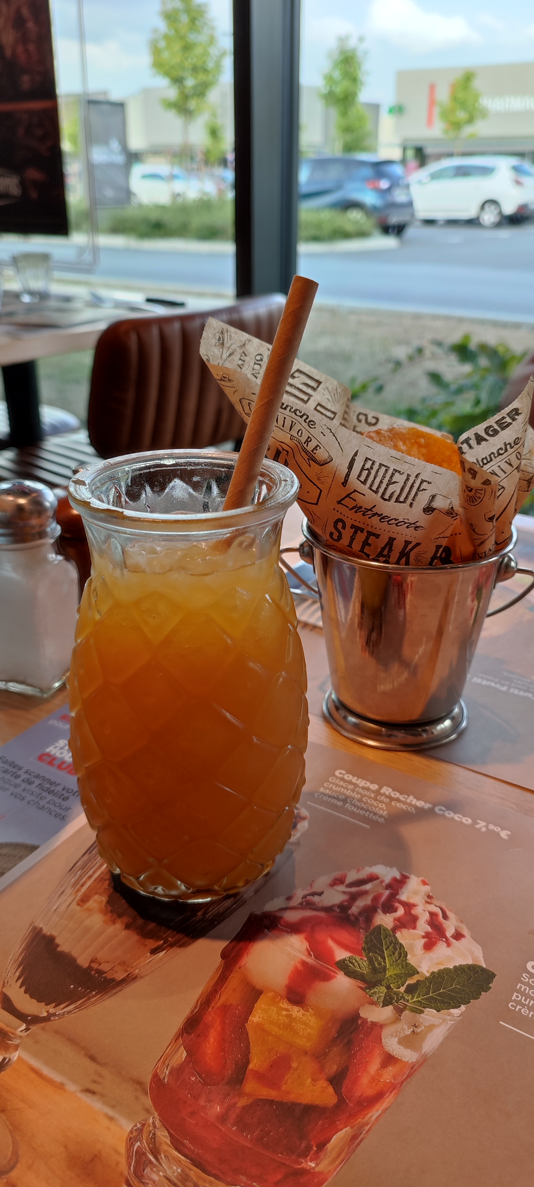 La viande, bavette d aloyau était goûteuse à souhait . Frites (surgelées, bien sûr), et une coupe glacée délicieuse ( boule coco, morceaux de mangue, coulis, crème chantilly). Le personnel adorable. Pour une chaine de restauration, correct