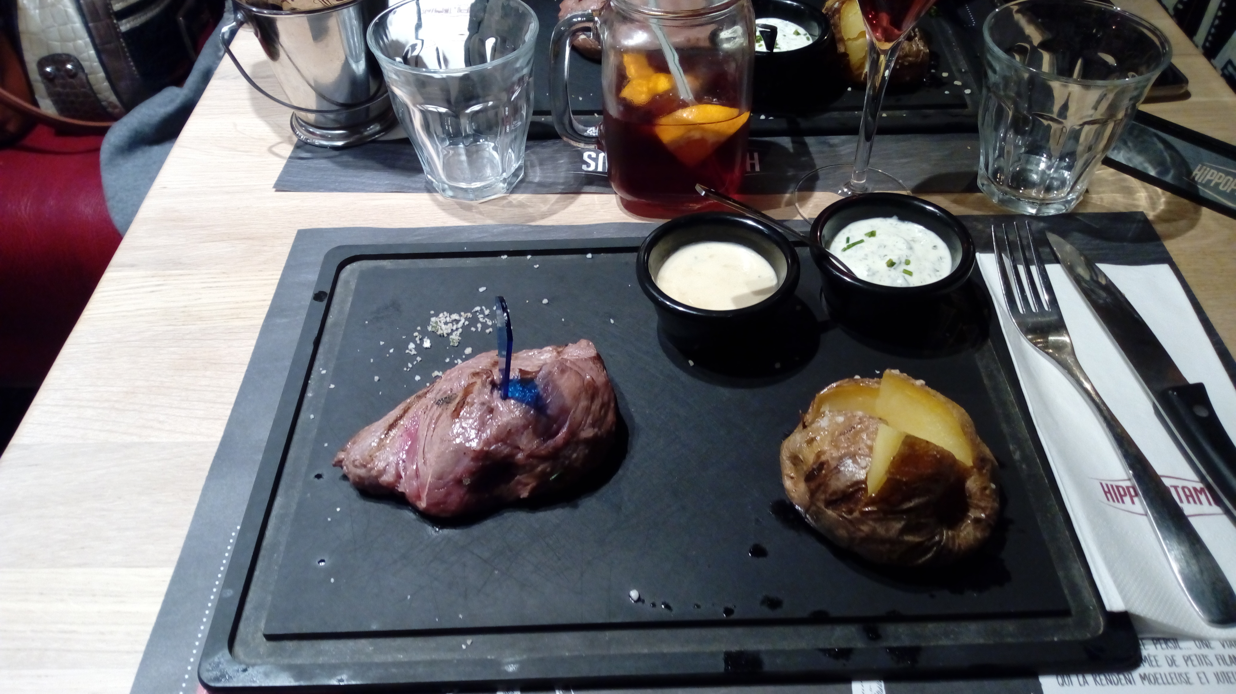 Il y avait de nombreuses années que nous n’étions pas venu chez Hippo, hier soir en sortant du cinéma, nous avons tenté. Très déçu, nous sommes très très loin des prestations que nous avons connu par le passé. Long à la prise de commande, long pour être servi, un jeune serveur ne maîtrisant pas son sujet (mais peut-on lui en vouloir ? Sa formation semblant juste) Les plats arrivent, un steak et un sachet de frites perdus au milieu d’une planche, aucune déco, aucune mise en valeur du plat !!! On mange d’abord avec les yeux n’est ce pas ? La sauce poivre commandée, oubliée, il faut la réclamer, certes c’est un détail et ça peut arriver. Mais plus tard, on prend notre commande dessert, et on attend, on attend..le personnel s’affaire à gérer la fin de service, nettoyer les tables, remettre le restaurant en place . Je réclame les glaces: réponse, on ne vous a pas encore servi ??, effectivement… Les glaces arrivent, à moitié fondues, elles ont du passer quelques minutes après leurs préparations avant de nous être servies. Certes, la responsable nous fait un geste commercial de 10 pour cent, c’est gentil, mais ce n’est pas ce que nous sommes venus chercher. On voulait juste bien finir notre soirée dans un bon petit restaurant, ce n’a pas été le cas. Nous ne reviendrons pas