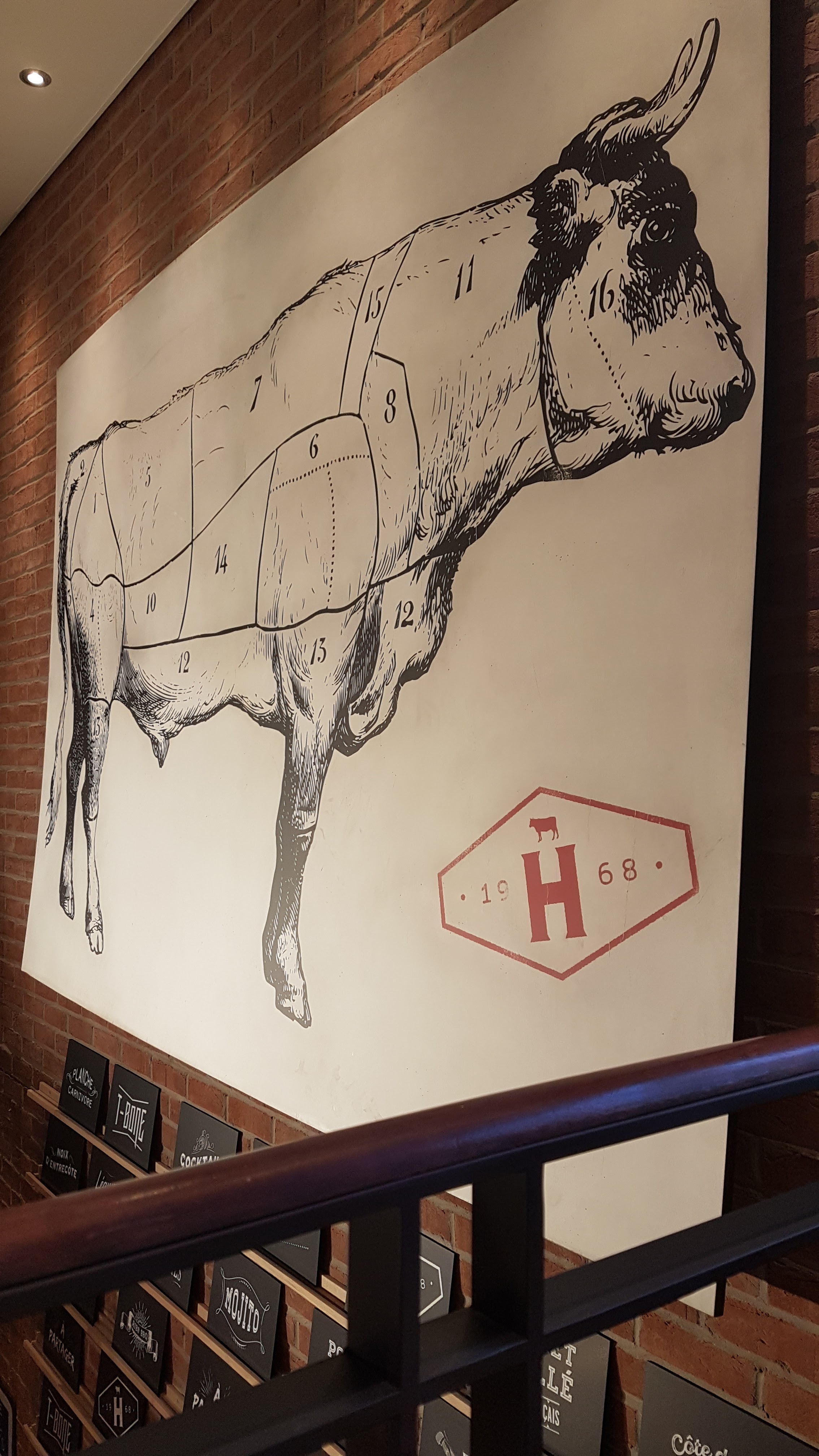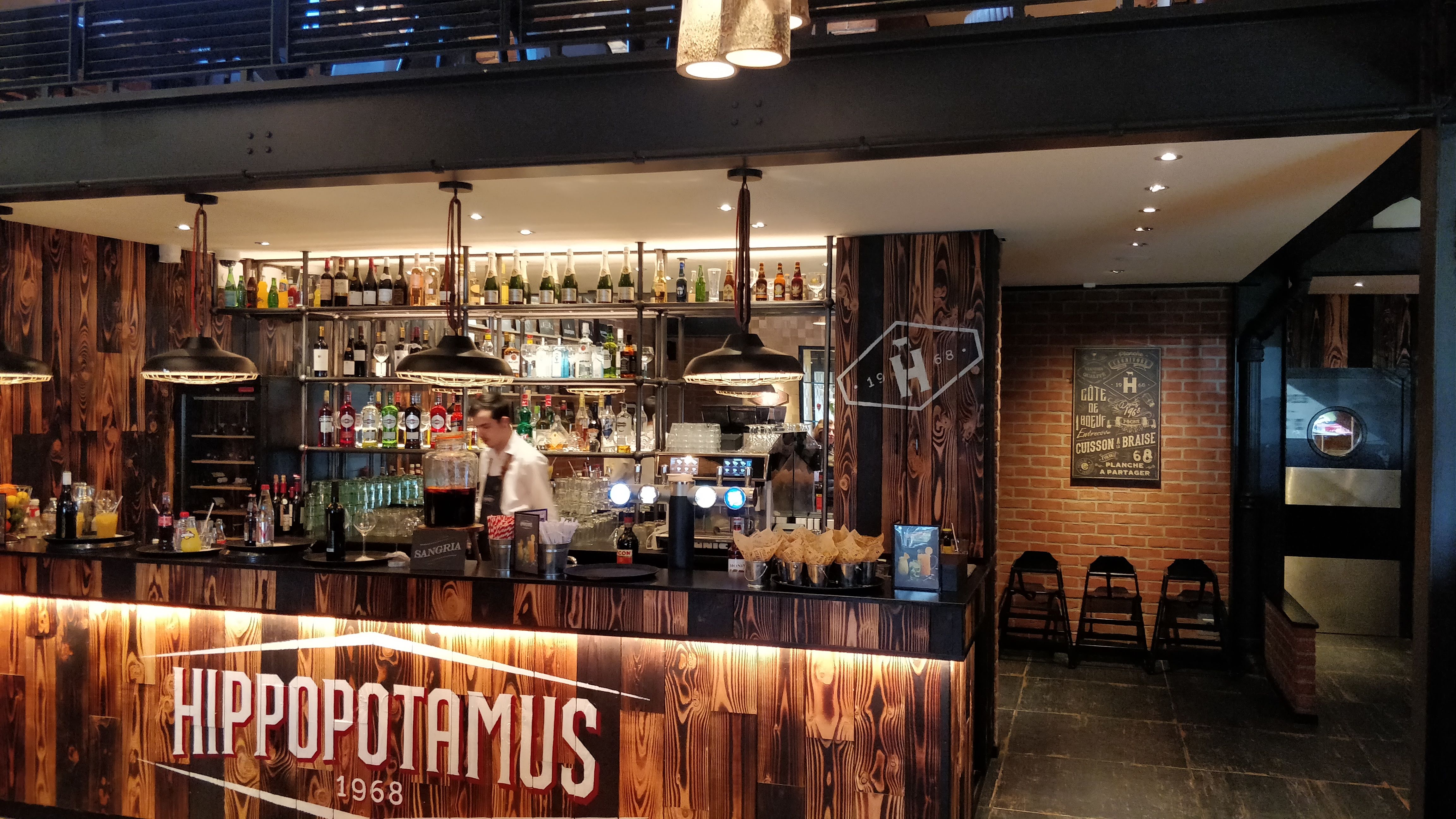 Une fois la porte du restaurant poussée et le couloir d'entrée traversé, il est clair que Hippopotamus se distingue par une chose très claire : la décoration du restaurant. Situé dans une zone commerciale, l'établissement nous accueille avec un design très sobre et vintage aux airs très prononcés de brasserie classique. Du bois, du cuir, des effets vieillis, c'est beau, c'est accueillant et réconfortant. Nous sommes venus un dimanche midi et avons été très vite placés puisque nous avions réservé au préalable. Arrivé à table, un petit cornet de chips artisanales vous attend afin de commencer l'apéro avant l'apéro. Pour l'apéro, des boissons avec et sans alcool sont disponibles (cocktails, bières, ...) et le restaurant propose de petites assiettes à partager sur différents thèmes : produits de la mer, charcuterie, produits frits, ... En termes d'entrée, la carte se veut diversifiée mais pas abondante allant de la simple salade au petit plat de ravioles. On passe au plat avec une carte centrée autour de la viande grillée principalement. D'autres plats sont bien sûr à disposition (saumon par exemple), mais il est compliqué de choisir autre chose que de la viande tant la carte en déborde (ce qui n'est pas un mal quand on en est amateur!) : bavettes, entrecôtes, ribs, ... le tout servi avec un accompagnement et une sauce de votre choix. Enfin, pour le dessert, on a droit aux basiques de la brasserie (sans pour autant que cela soit négatif) : tartes, glaces, cafés gourmands, fruits, ... En somme, classique est ce qui décrit le mieux ce restaurant. En y allant, il ne faut pas s'attendre à des plats originaux mais des basiques bien cuisinés qui vous feront passer un bon moment en famille ou entre amis à des prix raisonnables. Petits bémols cependant durant notre visite : pour information, nous y sommes allés 2 jours avant Noël (ce qui peut expliquer certains de ces petits défauts au vu de la fréquentation) : - une de nos fourchettes était encore sale (un reste de nourriture collé) : très rapidement solutionné et remplacé par un serveur passant à ce moment-là. - la coupe contenant une glace laissait à désirer en terme de lavage : des traces de calcaires étaient disposés ça-et-là sur le pied et le corps. - les assiettes ne sont pas très garnies et font vides à la présentation. Il est cependant à noter que l'on ressort tout de même repus. Malgré cela, ce fut une expérience avec un excellent rapport qualité/prix (121 euros pour 3 personnes avec apéro/entrée/plat/dessert), une cuisine de bonne qualité, un cadre agréable et des fauteuils confortables.