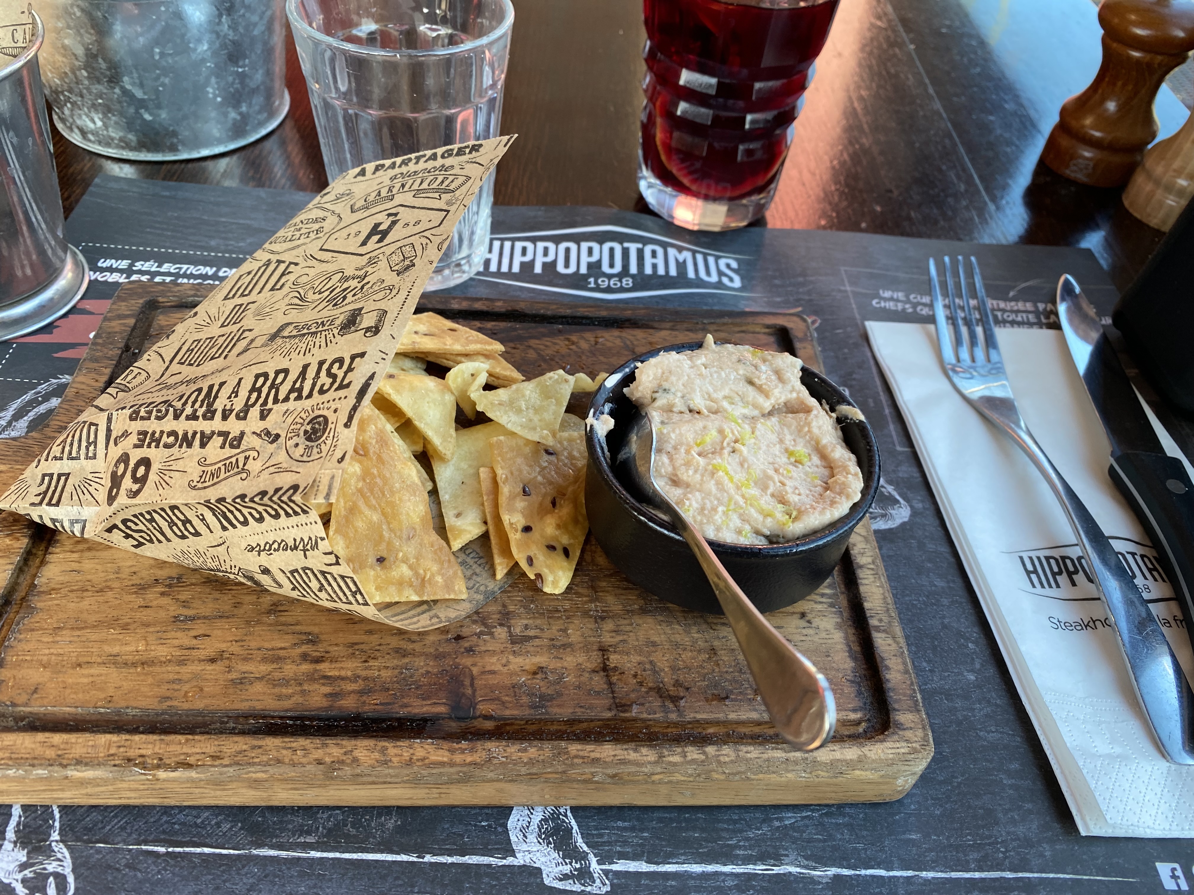 chips au poils en entrée, carafe, pain et salade oubliée. et la quantité est ridicule pour le prix, frites sèches et j’en passe. la vaisselle est super sale.