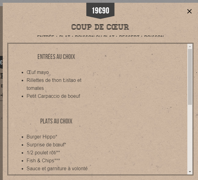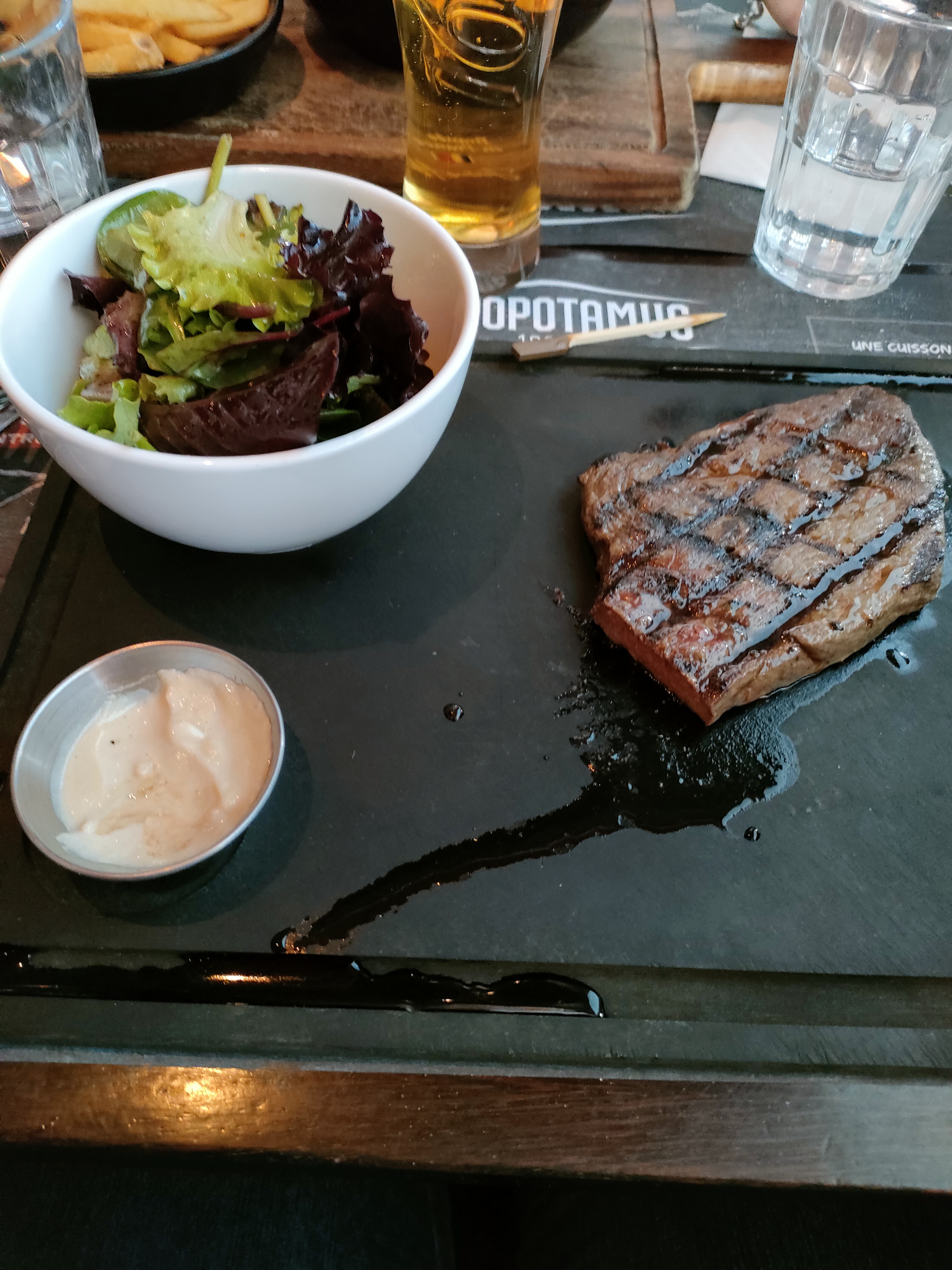 Très déçue. Oeuf mollet trop cuit à deux reprises. Je commande une bavette à 22€ on m'apporte celle à 14€.. le temps d'attente était très long surtout que lorsqu'il y a un problème de plat on le fait passer en priorité en cuisine : c'est la base ( le restaurant était presque vide ). Je travaille aussi en restauration et ce restaurant manque réellement d'encadrement. Une serveuse n'a pas à être en crop top sur un lieu de travail.. la responsable qui reste au bar alors qu'elle devrait surveiller la salle.. Bref, j'ai travaillé à Hippopotamus et ce n'est plus du tout ce que c'était.