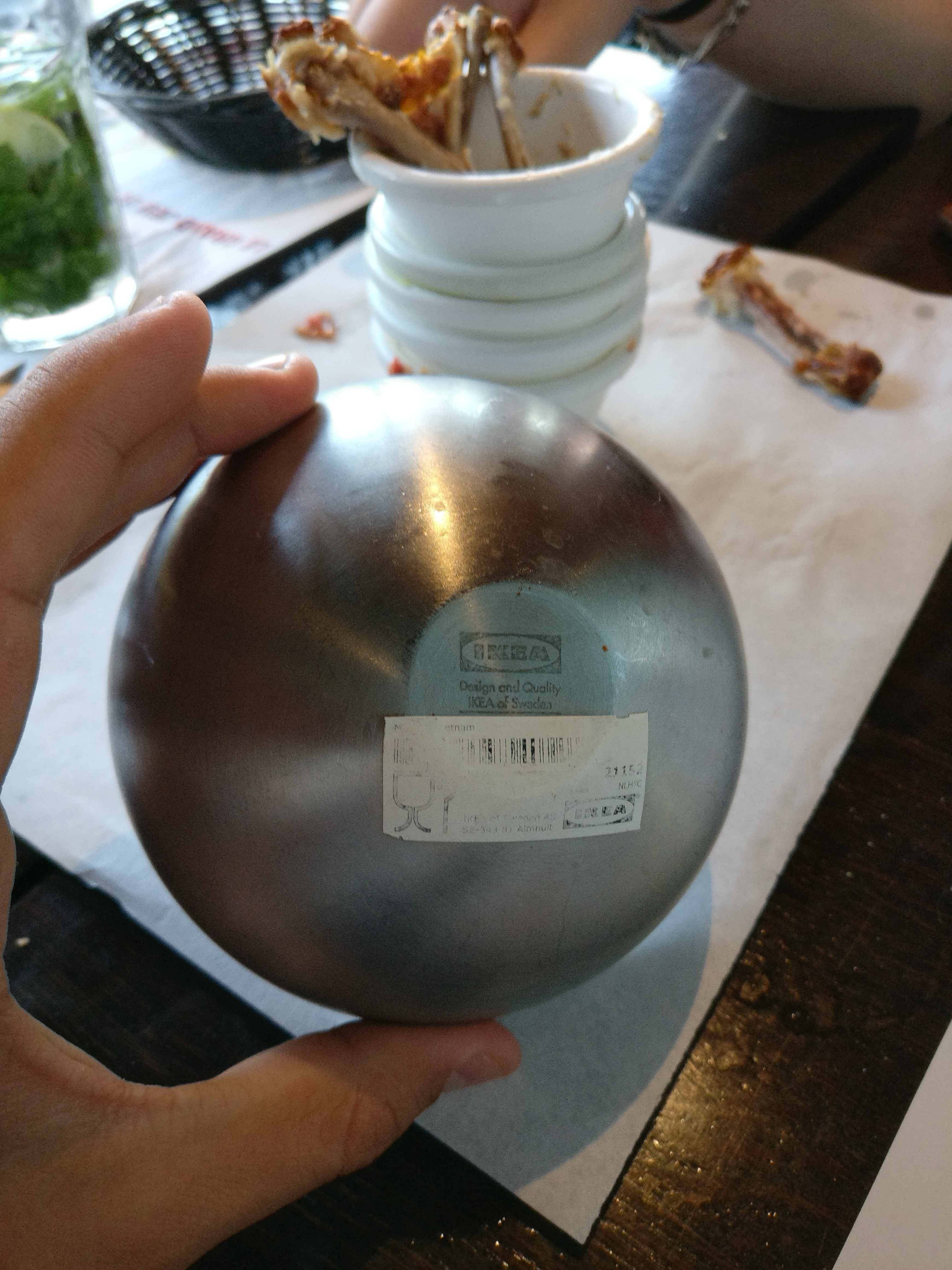Lorsque je vois ça (étiquette ikea usé sous un bol), c'est à se demander si les bols d'apéritif sont lavés !? Le temps d'attente pour servir nos plats principaux à été plutôt long par rapport au nombre de clients dans la salle (environ 5 tables). De plus, la serveuse nous à apporter des plats d'une autre table dans un premier temps (ce qui n'est pas grave en soi) et est restée complètement bloquée devant nous lorsqu'on lui a dit que ce n'était pas les nôtres (comme si nous avions fait une erreur). Il est aussi arrivé que l'un de nos verres d'eau disparaissent par l'une des serveuses, comme pour la panière à pain. Enfin, l'addition à pris une éternité à nous être apportée et sans avoir eu de café proposé. Côté nourriture, il n'y a rien à redire, les cuissons sont respectées, la qualité est là (même si la brochette était un peut légère dans l'assiette). Les desserts sont eux aussi corrects. L'environnement est plutôt sympathique, dommage que le temps n'était pas au rendez-vous pour manger dehors, la terrasse avait l'air sympa. Globalement, c'est un peu cher pour ce que c'est, surtout lorsque que le service n'est pas au rendez-vous mais au moins la qualité est là.