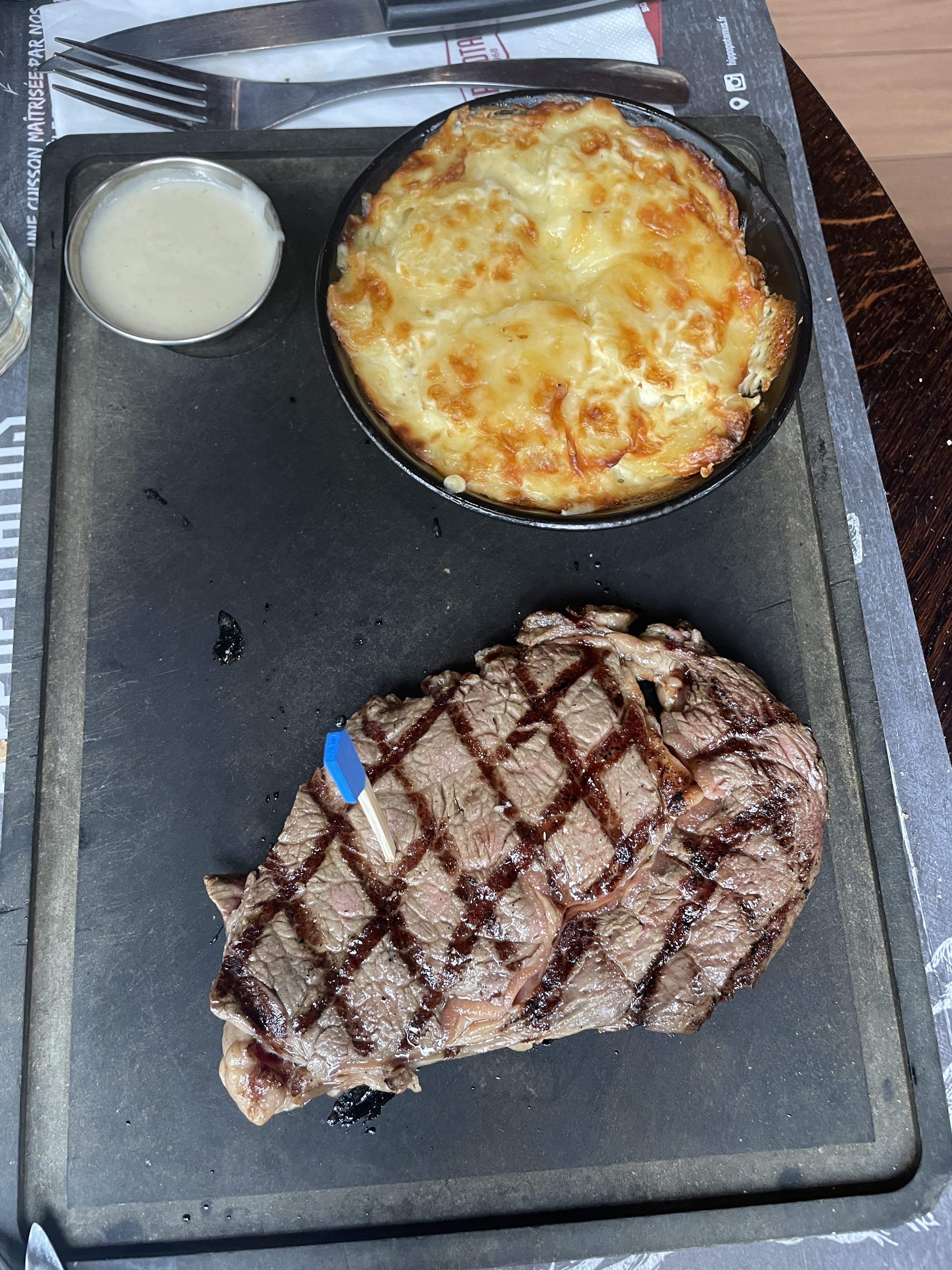 Entrecôte correcte, à peine tiède. Vu le prix je m'attendais à mieux. Minuscule petit pot de sauce d'accompagnement pour la viande. Serveur dympathique et souriant mais le service a été bien lent. Terrasse agréable bien que donnant directement sur un grand parking.