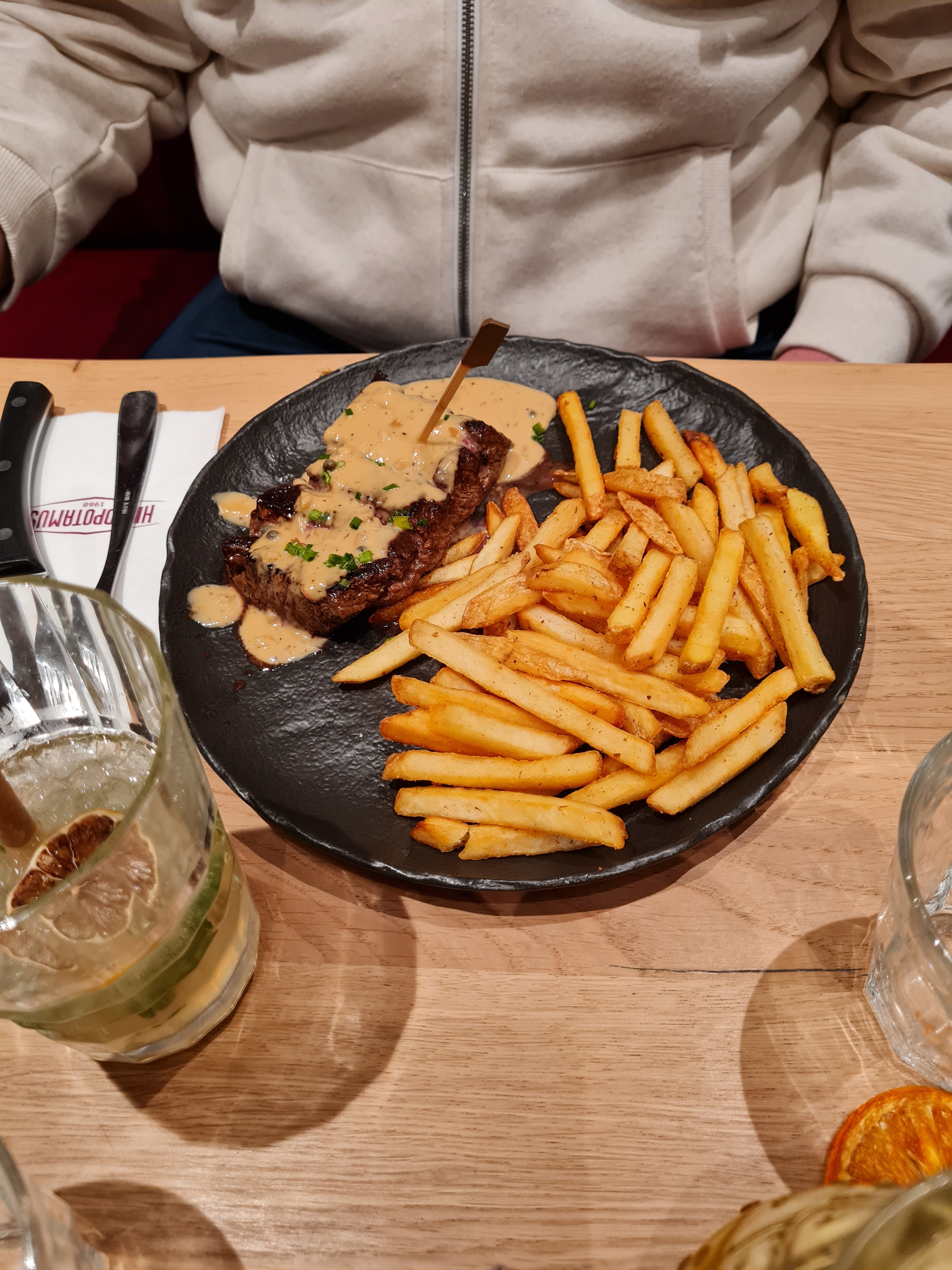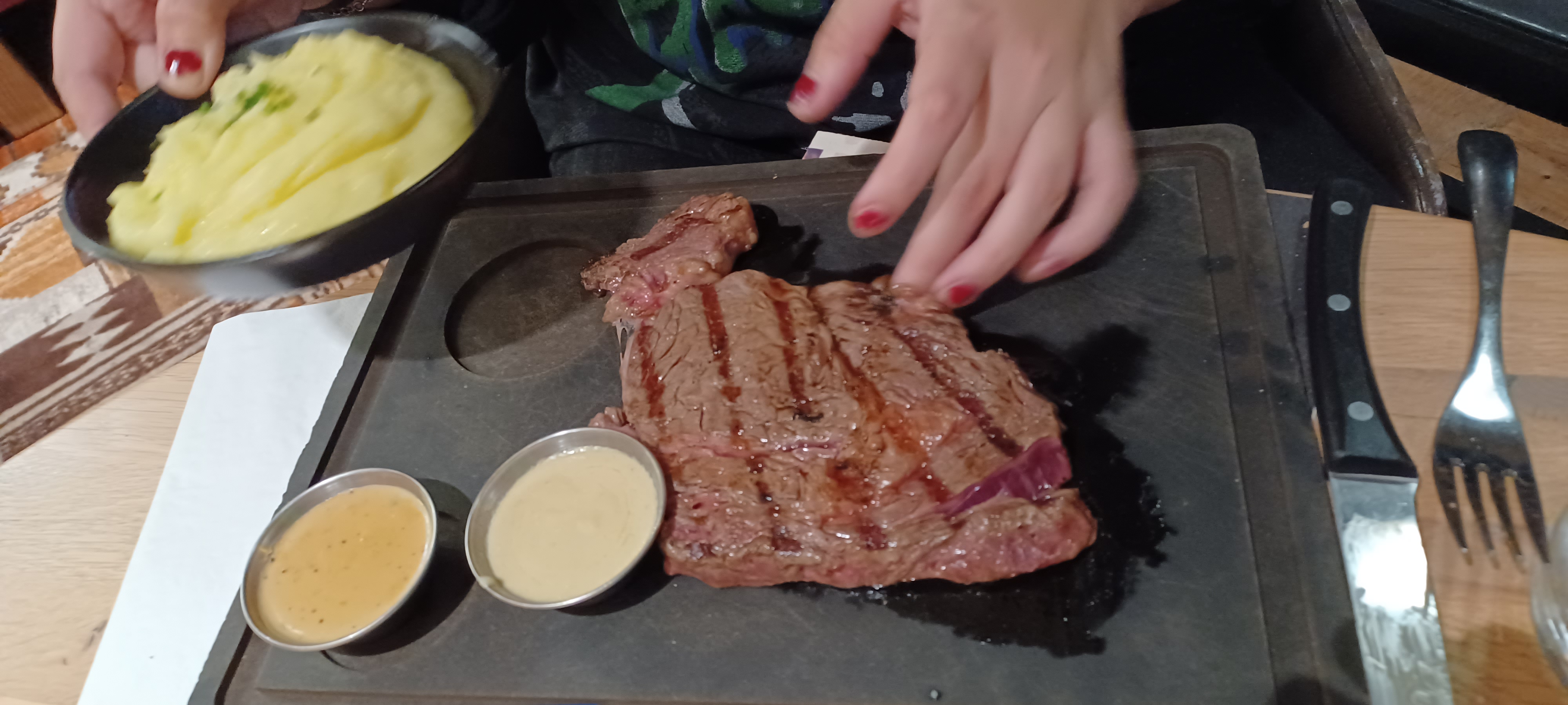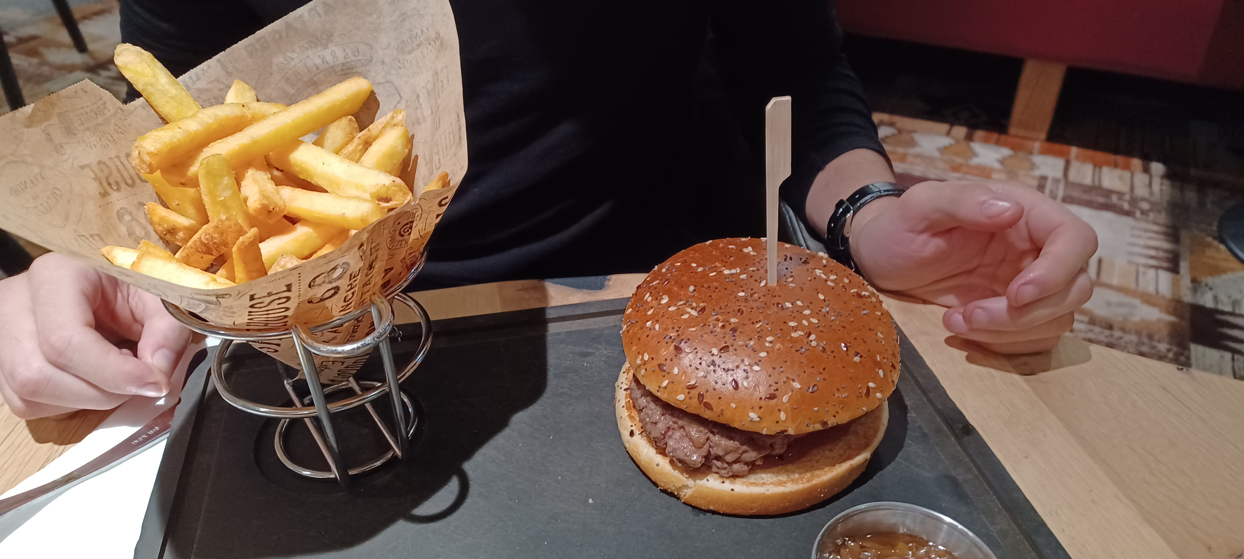 Personnel sympathique . Cadre agréable. Gros gros bémol concernant le tarif de la viande de la catégorie belle pièce sur la carte . Les morceaux servis sont vraiment pas gros et n’ont rien d’exceptionnel. Les frites surgelées ne me dérangent pas en soit mais n’étaient pas à mon goût et la présentation des assiettes assez minimaliste.