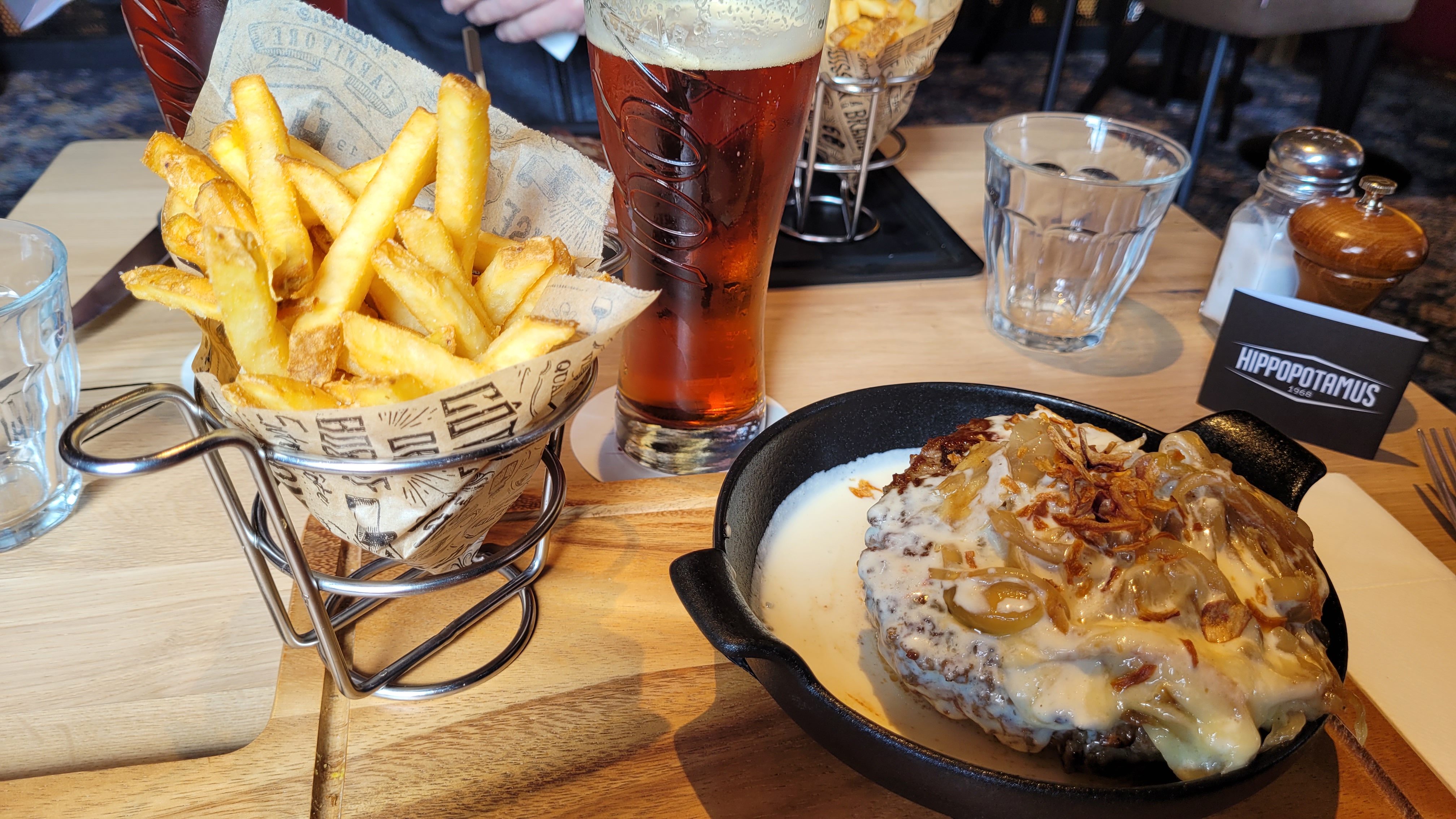 Cafouillages… La serveuse ne nous a jamais amené la moutarde, le ketchup et la carafe d’eau. Je suis allé les chercher moi même. Pour les desserts, cela a été tres tres long. Encore une fois, il’a fallut que j’aille voire moî même. En revanche, l’addition (complète malgré tout ca), nous a été proposé et amenée très rapidement avec l’appareil a CB. Et oui, le 2eme service…