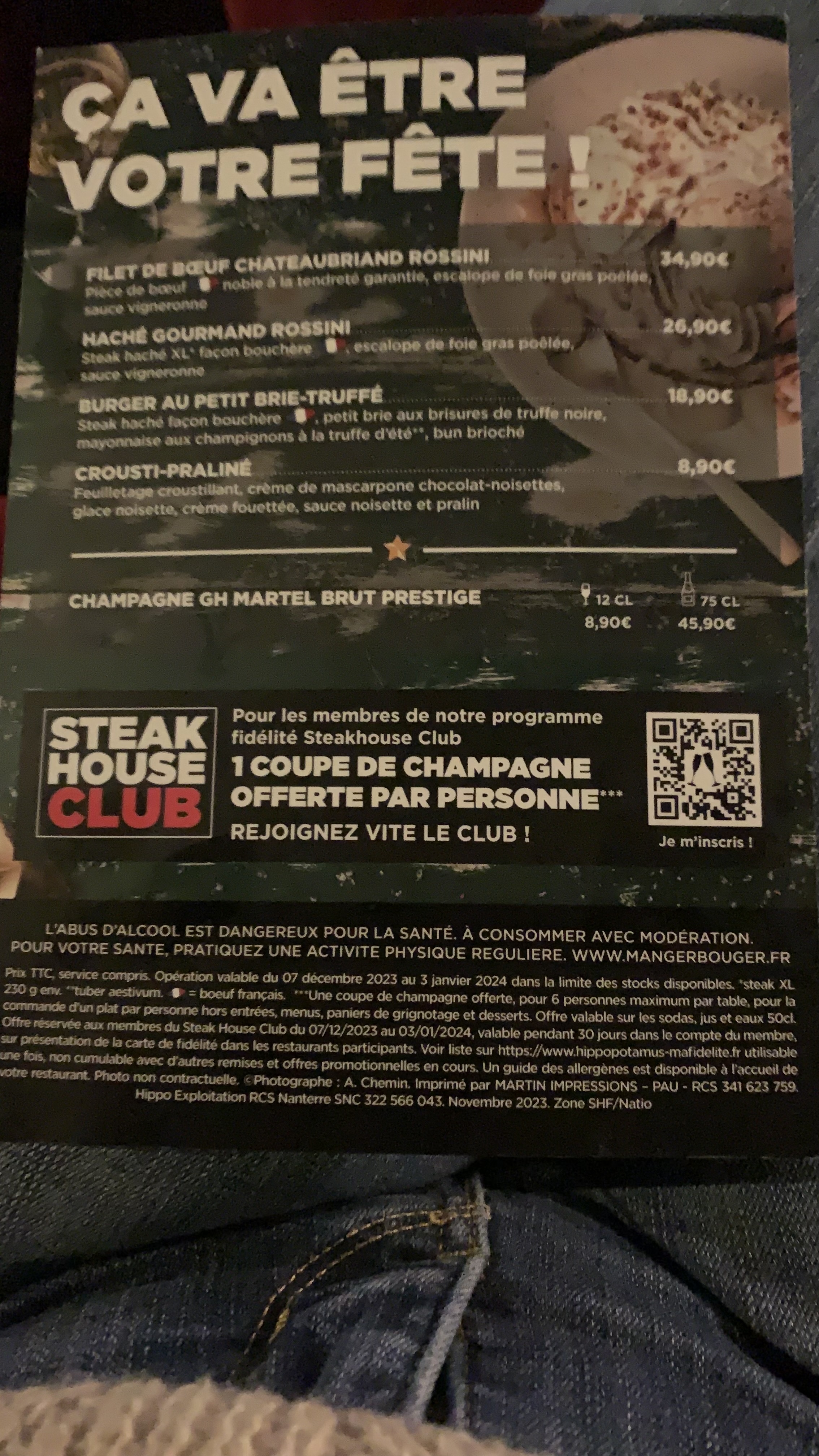 Nous savons que l’hippopotamus n’est plus ce qu’il était mais pratique avant une séance de cinéma. Pendant les fêtes de noël ils affichent une coupe de champagne offerte pour les personnes ayant la carte de fidélité, la serveuse Isabelle nous confirme après vérification que oui . Au moment de payer l’addition, nos coupes nous sont facturées et le manager du soir « Cisco »ne veut rien entendre et Isabelle a fini son service. Je ne retournerai jamais dans un hippopotamus