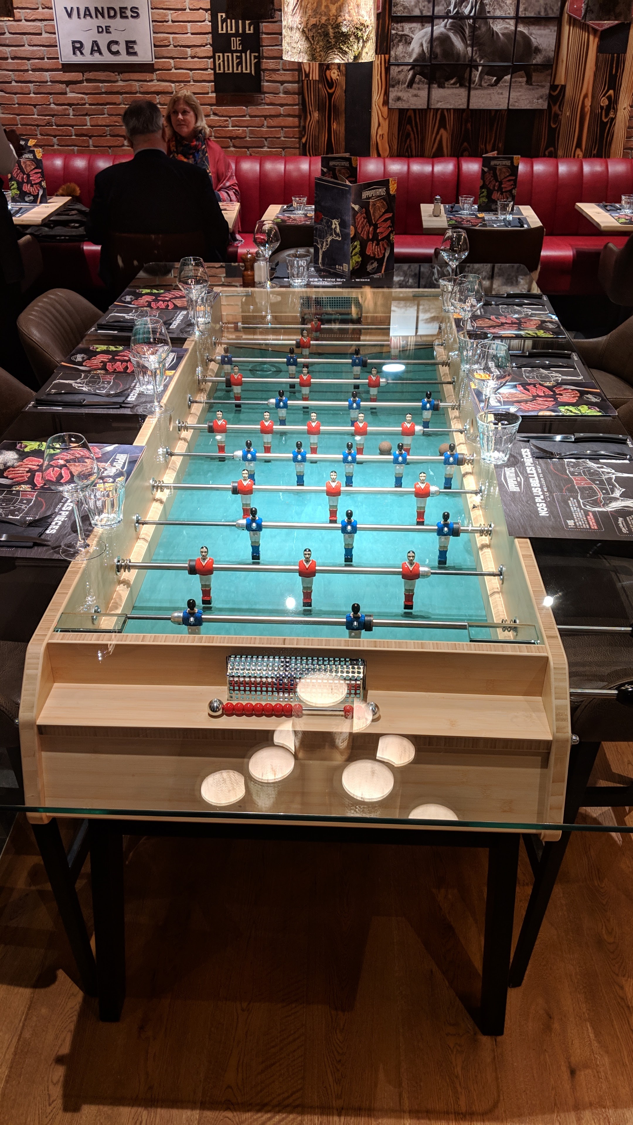 Bonjour Nous avons la table baby foot pour dix personnes mais sans savoir que nous devions manger avec nos manteaux. Une ventilation au maximum en air froid. Dans cette établissement les accompagnants supplémentaires n’arrivent jamais. Sauf après multiples demandes ils nous ont proposé de ramener le gratin alors que nous venions de commander les desserts. Ne demandez pas d’infusion ou de the il vous ramène un verre d’eau chaude 🤣🤣🤣sans les sachets qui accompagnent en temps normal. Bref en clair il faut éviter ce restaurant qui se moque des clients. Bonne appétit bien sûr et bon courage a toute volontaire de subir ce genre de service.
