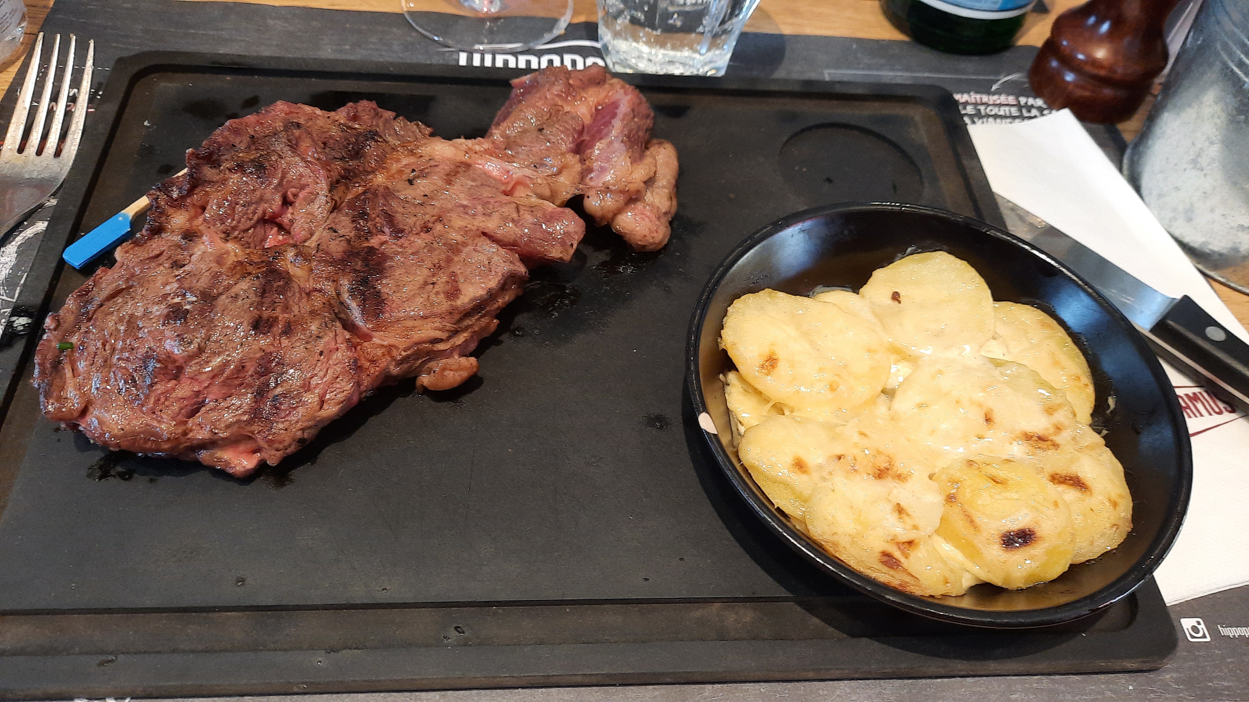 Une petite course à faire dans la zone commerciale juste à côté du Parc des Chantereines à l'heure du déjeuner, voilà une bonne raison d'aller à l'hippopotamus qui s'y trouve. On est sur du classique avec la carte habituelle propre à cette chaîne de restauration. Le concept ne vieillit pas trop, toujours beaucoup de plats de viandes dans un cadre propre aux familles. C'était d'ailleurs la clientèle qui était présente lors de ce déjeuner. Côté service, on est majoritairement sur du junior. Du coup, certains codes sont en cours d'acquisition ou manquants. Donc, peut mieux faire. Côté assiette, mon burger savoyard était pas mal du tout : steak haché, fromage à raclette, galette de pomme de terre et oignons confits. Suffisamment copieux et généreux pour que je passe à l'étape du dessert. Si vous en doutez, jetez donc un oeil aux clichés que j'ai pris 😃.