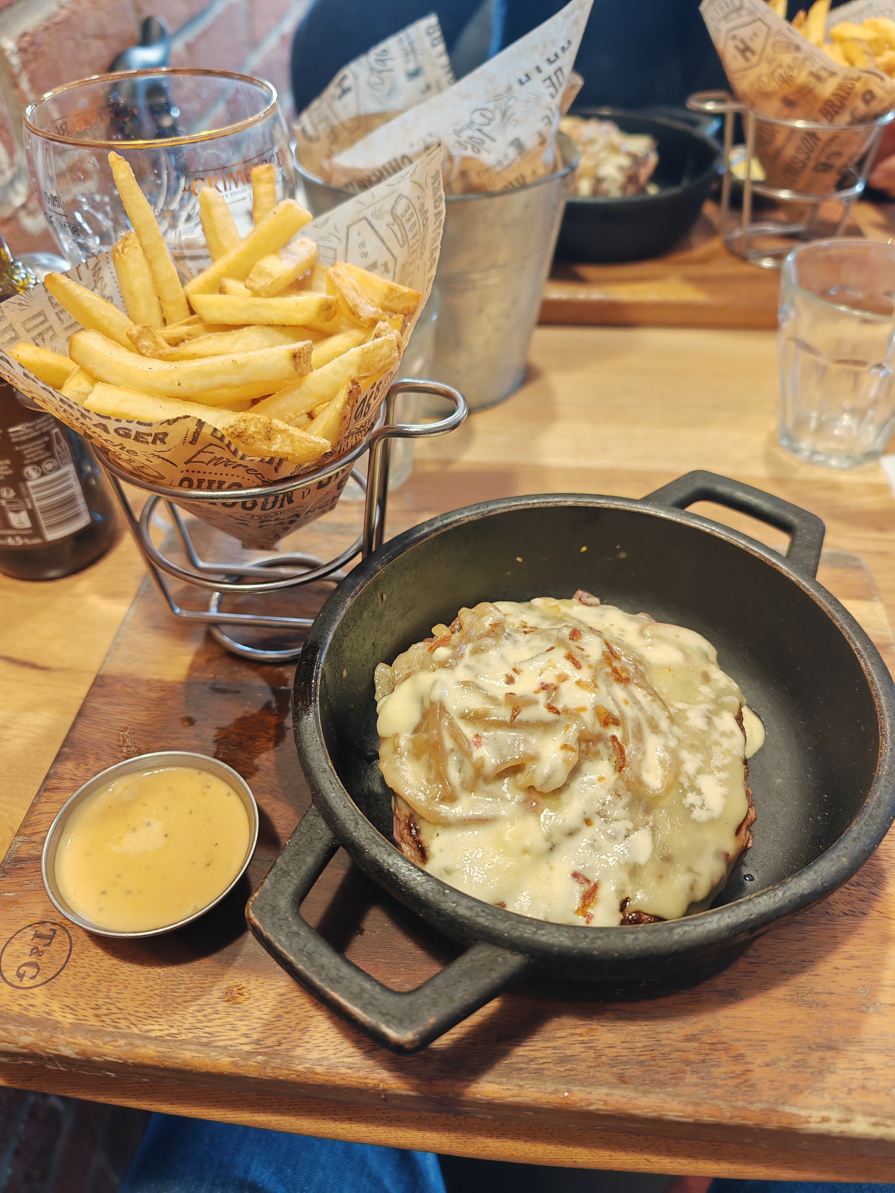 Pas top, le service est plutôt sympas l’ambiance un peu bruyante et musique à changer, j’ai souvent manger ici en 2016 mais là je suis retournée 8 ans après c’est de la rigolade, les chips ont un goût chimique, bas croustillant mais très peu pâteux, j’ai commander viande non saignante, c’était au final saignant j’ai demander 2 fois pour recuire la viande, mon mari a commander fish and chips, j’ai goûter et le poisson étais cru et a l’extérieur la panure ainsi, frites surgelée pas étonnant, le prix m’a coûter 118 euros, un conseil la prochaine fois regarder en cuisine j’aurai bien aimer voir si le chef était t’il pris en tant que stagiaire ?