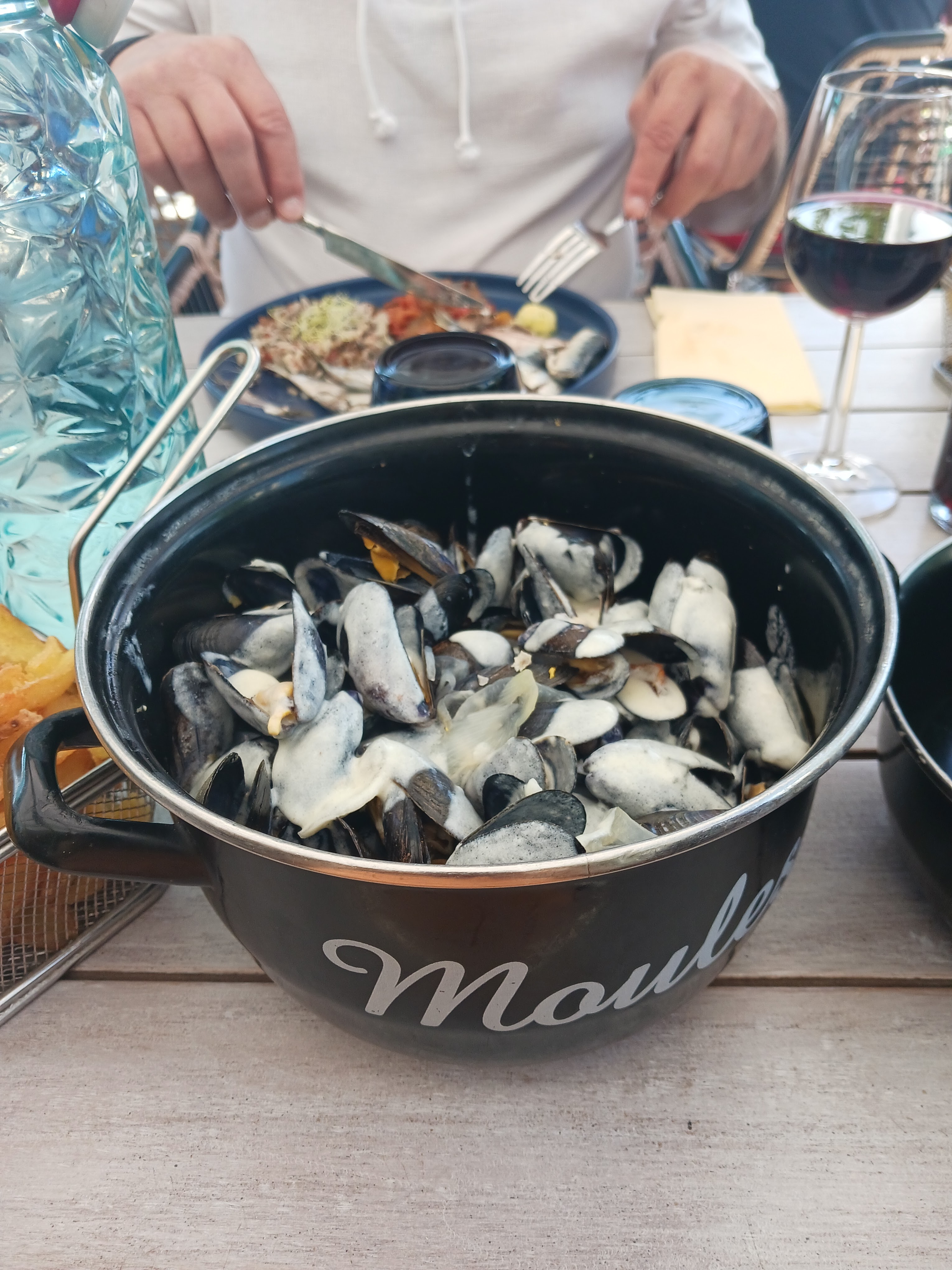 Nous pris une salade qui était plus que parfaite crottin de chèvre et cassolette puis par la suite de délicieuse moules à la crème ou il y a rien à dire et de bon fétou bien copieu. Je recommande largement pour des bon mangeur de moule 👌👌👌