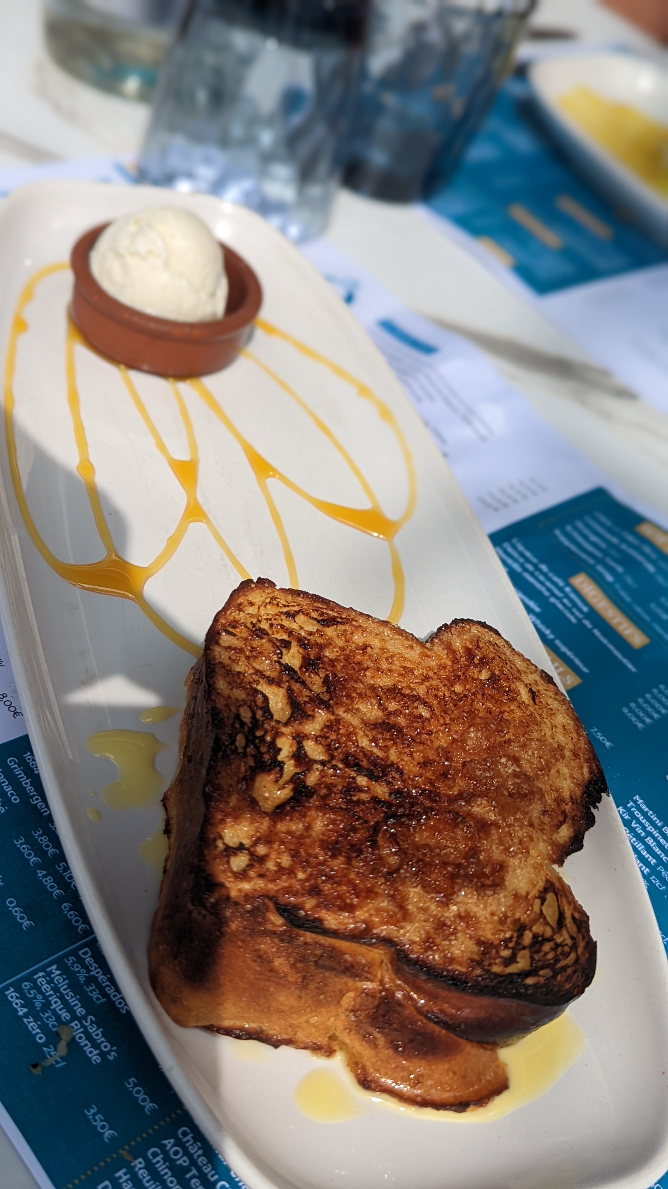 Venue au restaurant Hissez Ô pour un dessert plus locale. 4 sortes de Brioche façon pain perdu ! Chocolat chaud et boule vanille pour ma part. Miam