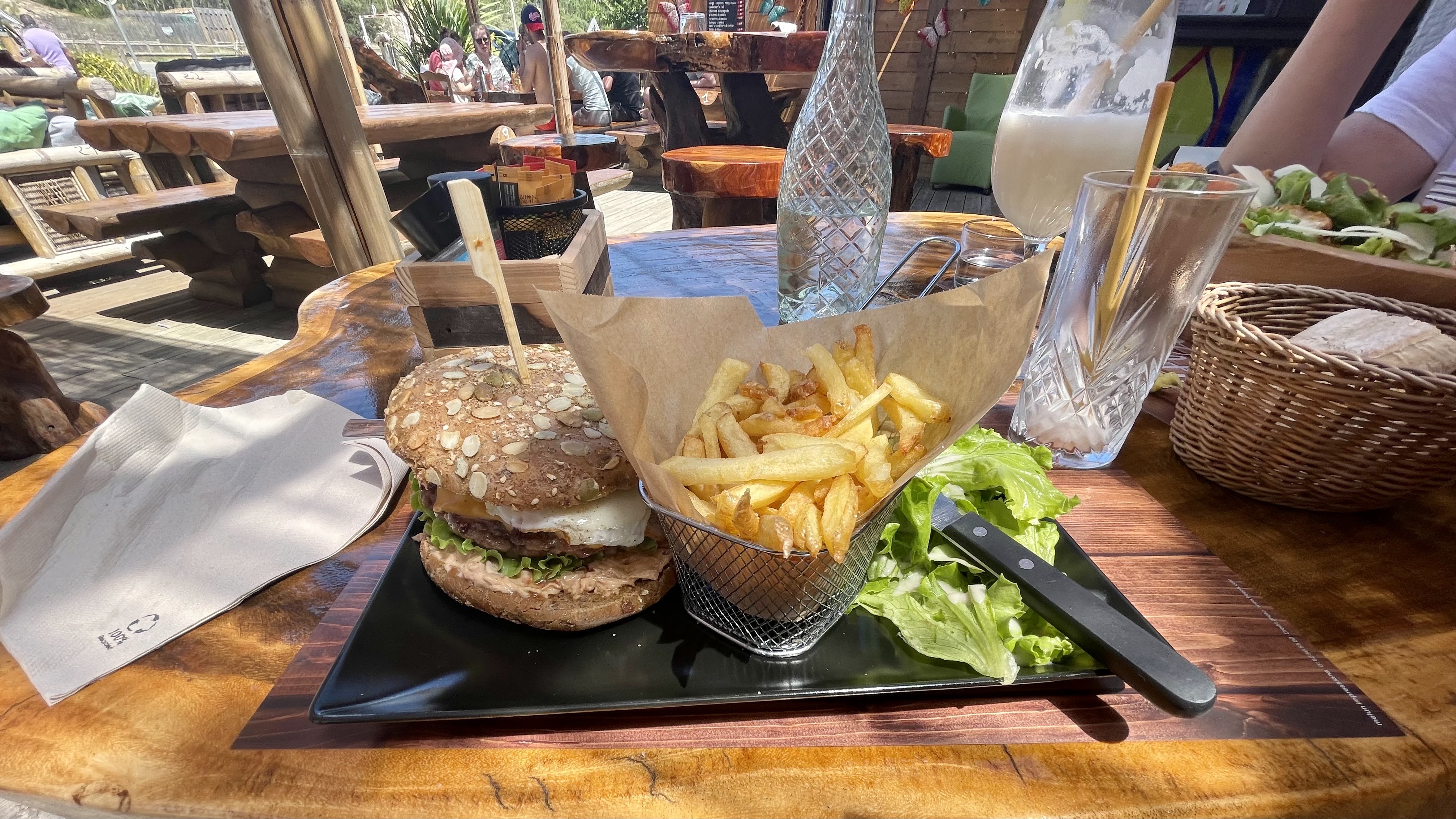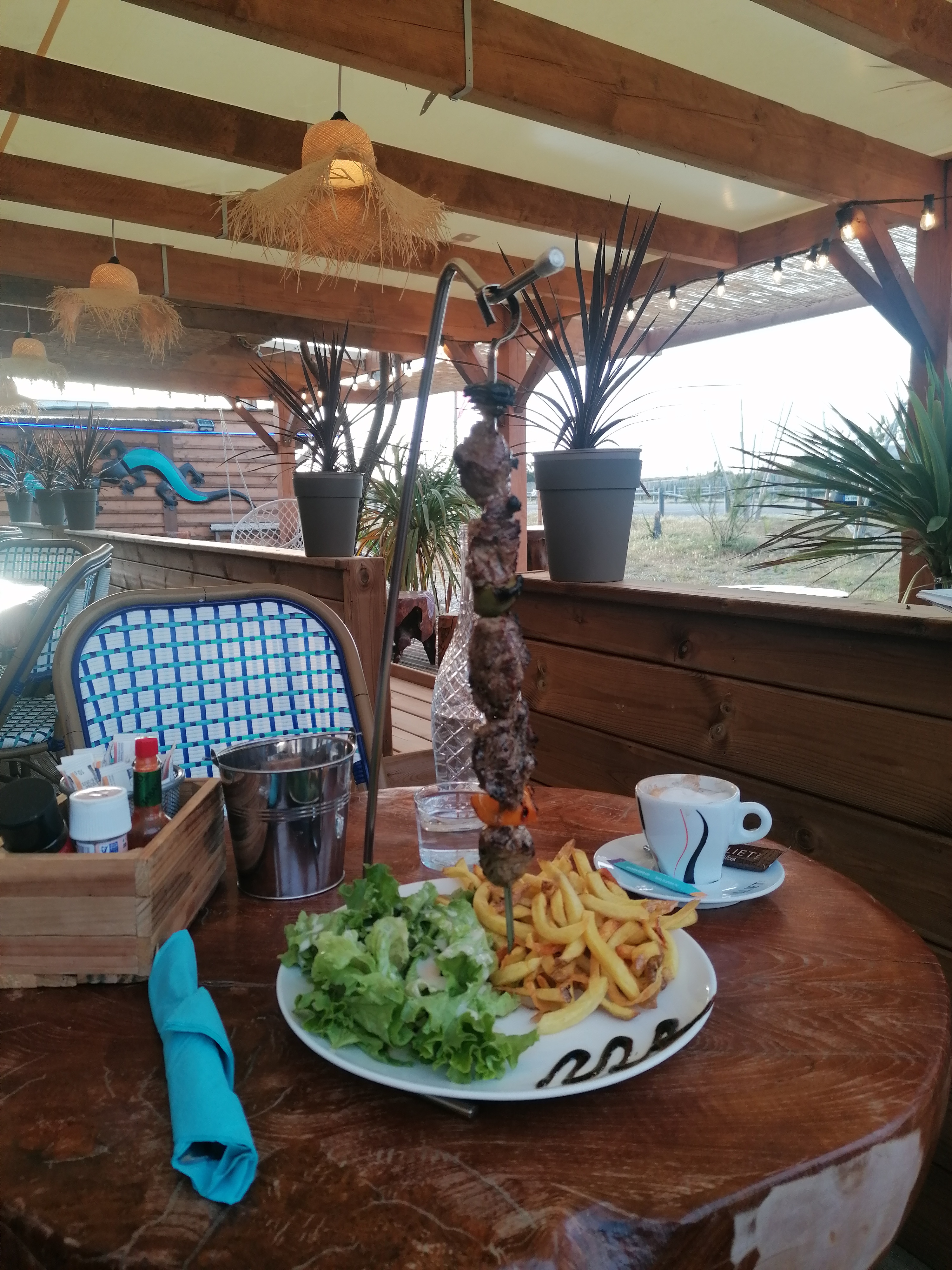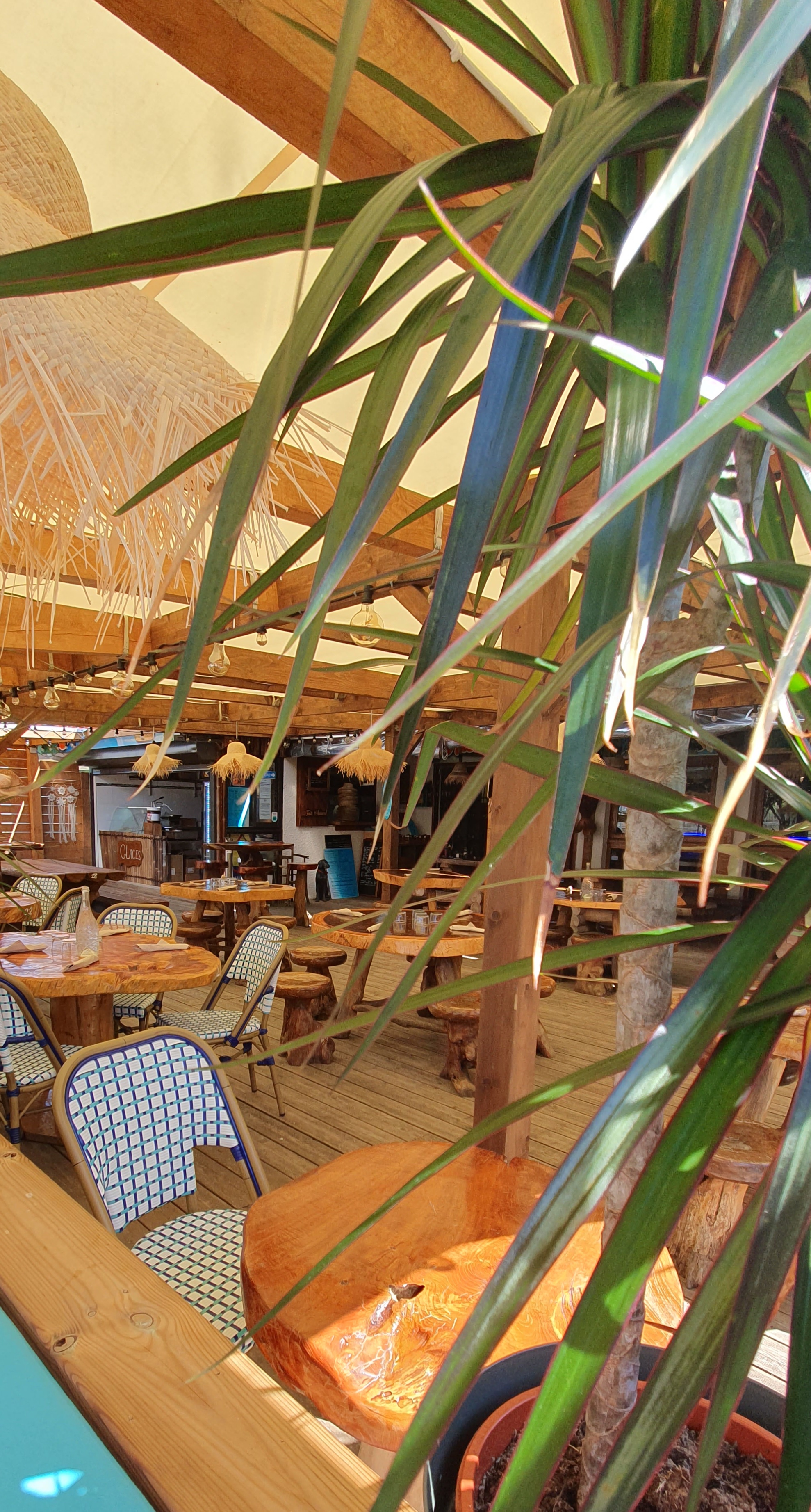 Un endroit très sympa entre plage et pinède pour un repas dans une jolie ambiance exotique, décontractée et chaleureuse. Les plats sont bons avec certaines propositions « maison » (mention spéciale pour les frites maison super bonnes). Nous avions choisi le Burger maison -très bon avec sa sauce bien relevée- et les chiperons au piment d’espelette -globalement bons, mais ce ne sera pas mon best one, car un peu « en eau » et trop juste en quantité- et pour finir, un tiramisu maison, le tradi à l’amaretto, vraiment excellent ! Bon accueil et toute l’Équipe de service est très sympa. Merci à notre petite serveuse qui a porté une attention particulière à mon café que j’aime « court un peu allongé » 🙃 Au final, une belle découverte et nous reviendrons avec plaisir. bon à savoir, la « paillote » reste ouverte jusqu’à fin septembre et le reste de l’année, pour les week-ends (petits chauffages installés sous la terrasse couverte)