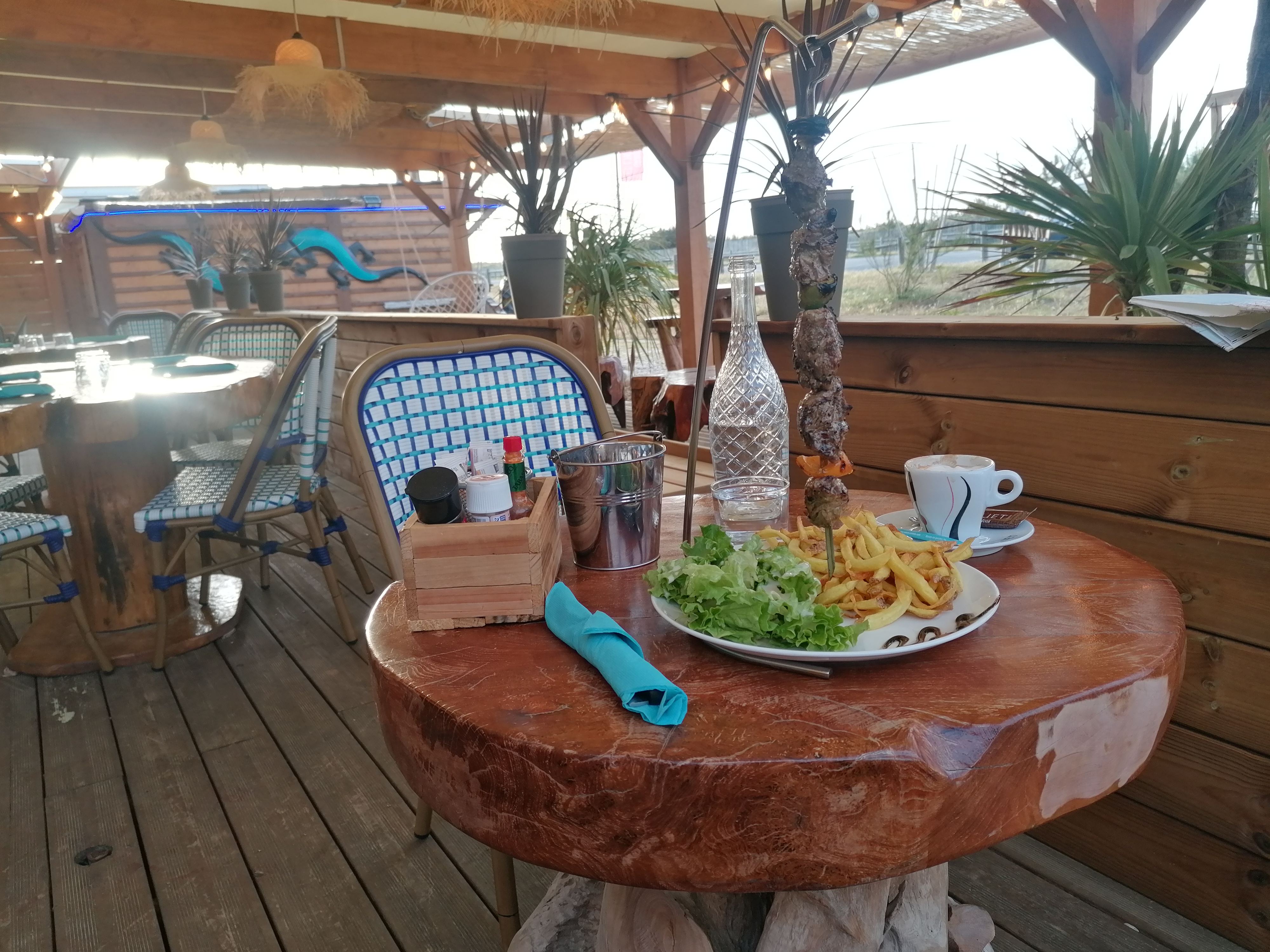 Restaurant à 100m de la plage du Gurp près de Soulac. Tables et chaises très originales. Nourriture de qualité. A essayer