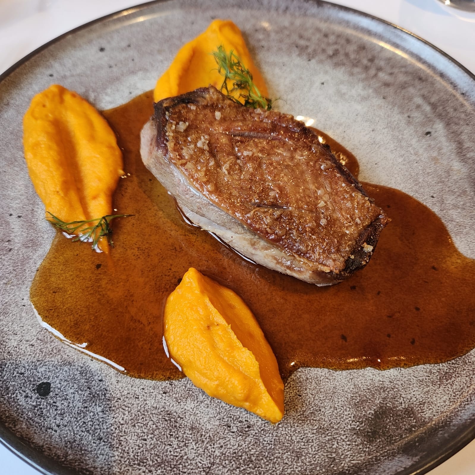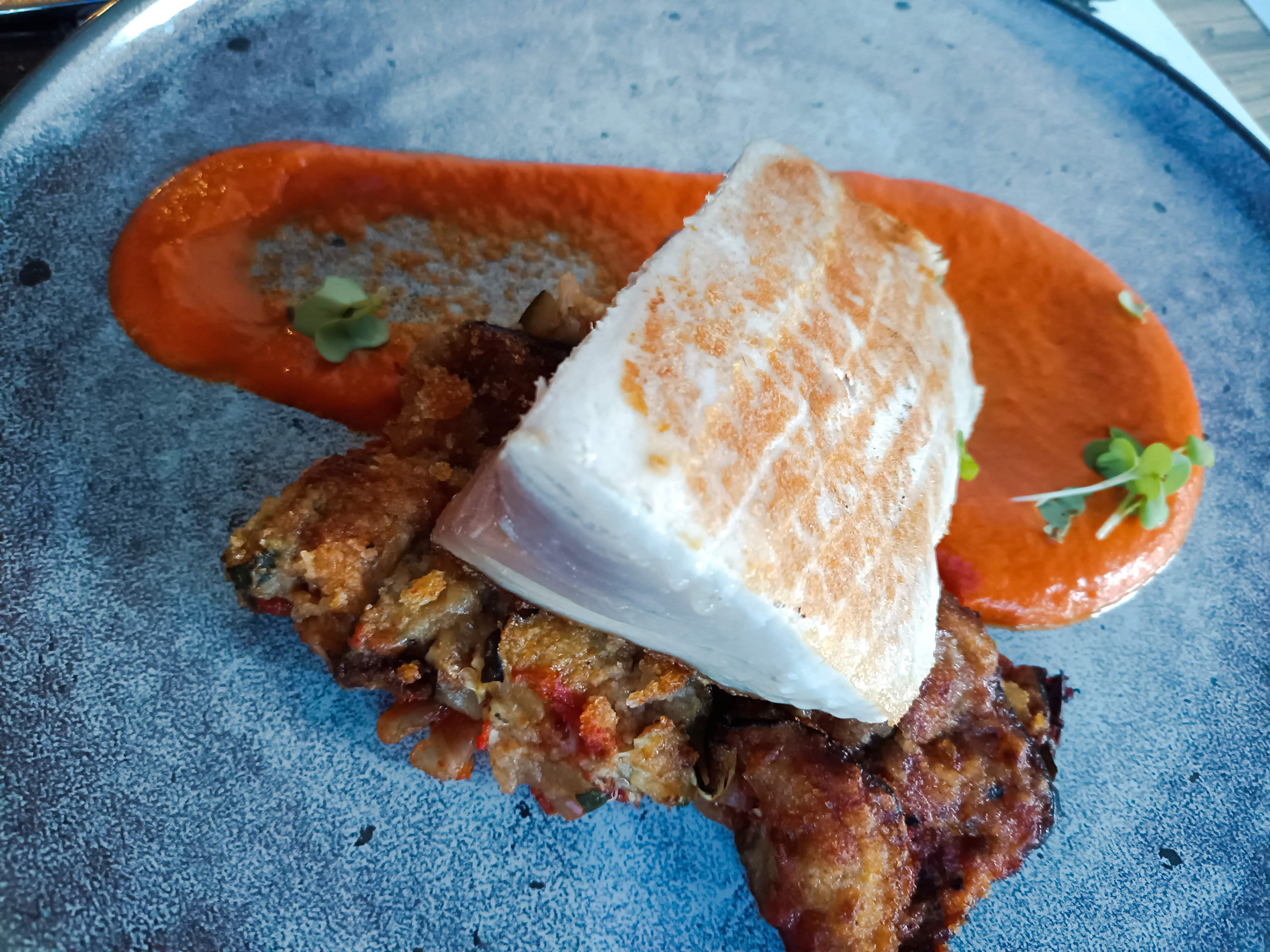 Un réel plaisir. La terrasse est grande et agréable. Petit bémol; les chaises sont à revoir car absolument pas confortable ! Heureusement que nous avons vu nos voisins demander des coussins :) Coté service: le personnel est agréable et efficace, rien à redire. Côté cuisine: Nous avons prix deux menus que nous avons partagés pour découvrir plus de plats. Les entrées étaient simples mais totalement maîtrisées. Une belle entrée en matière. Pour ce qui est des plats nous sommes plus tranchées; le maigre était très bon mais le bouillon de poissons bien trop fort à notre gout, dommage, c'est la seule fausse note de notre expérience. En revanche, la pluma ibérique, un régal, la sauce est à tomber, nous avons tout saucé :o). Pour les desserts: c’est juste la quantité qui a fait défaut et non le goût. La crème brulée recouvrait à peine 2/3 mm du ramequin, dommage car elle était sympa. Le dôme chocolat caramel était excellent ! Merci pour ce repas fort agréable.