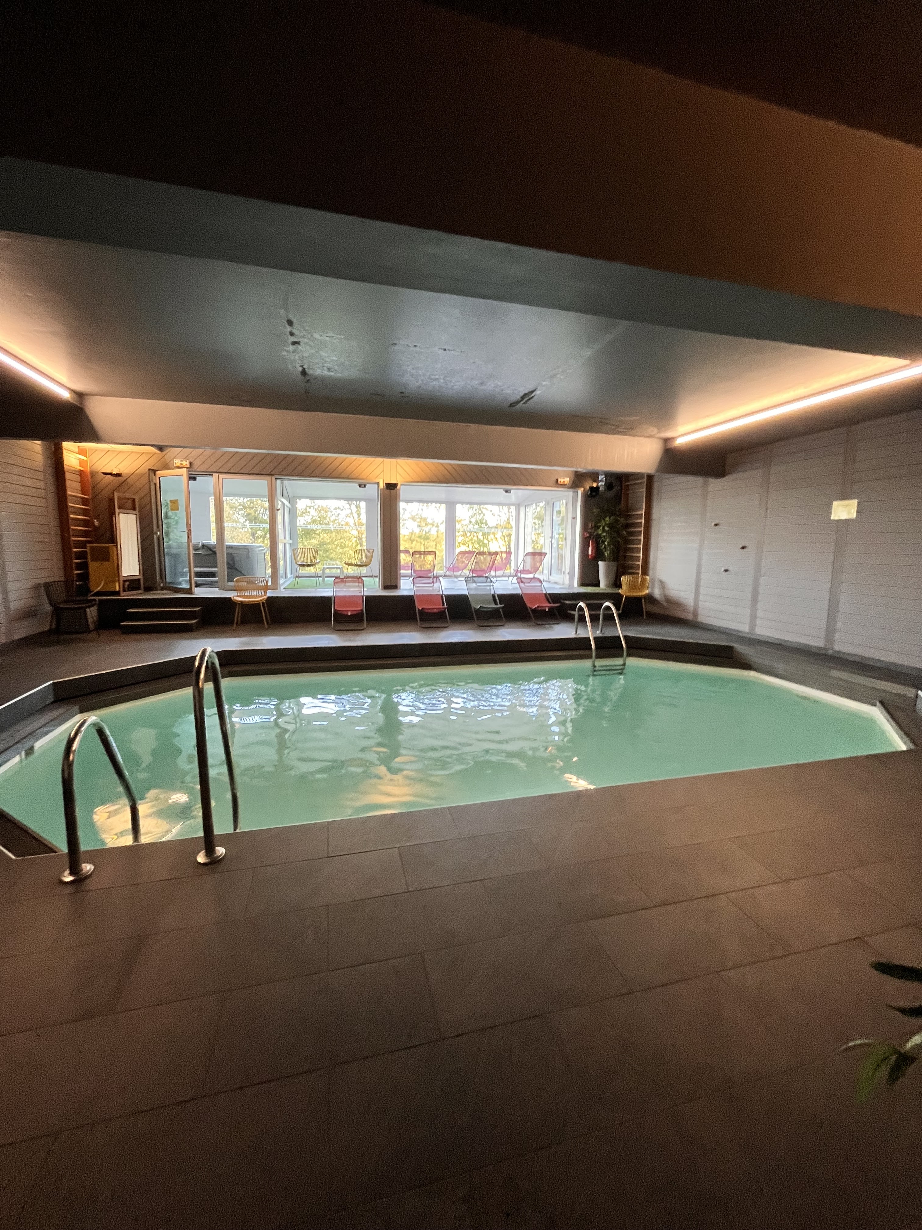 L'espace bien être : il manque 1 horloge, le coin Sauna séparé du reste et non indiqué par 1 pancarte Sauna sur la porte, pas de peignoirs ni chaussures pour circuler de la chambre à l'espace bien être. Chambre : Pas de chauffage disponible ni de clim alors que l'on sort d'un lieu humide ( et qu on est en Octobre ) ce qui provoque beaucoup de buée sur les vitres et la porte coulissante dure à manipuler. Pas assez de massages disponible malgré la demande 1 0 jours avant.