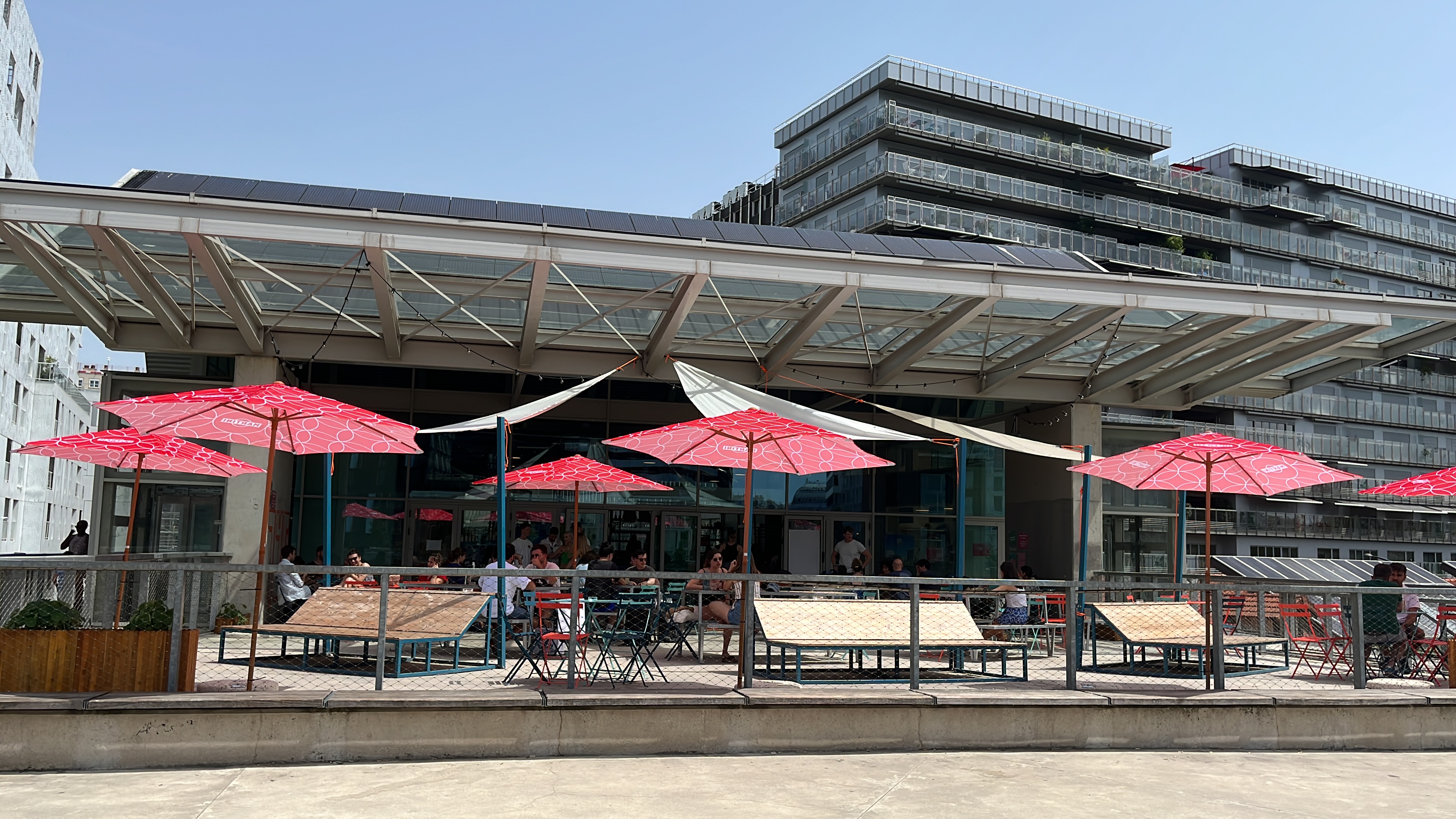 Terrasse éphémère avec une belle vue sur le parc et le nouveau quartier. Toilettes dont la propreté laisse à désirer.