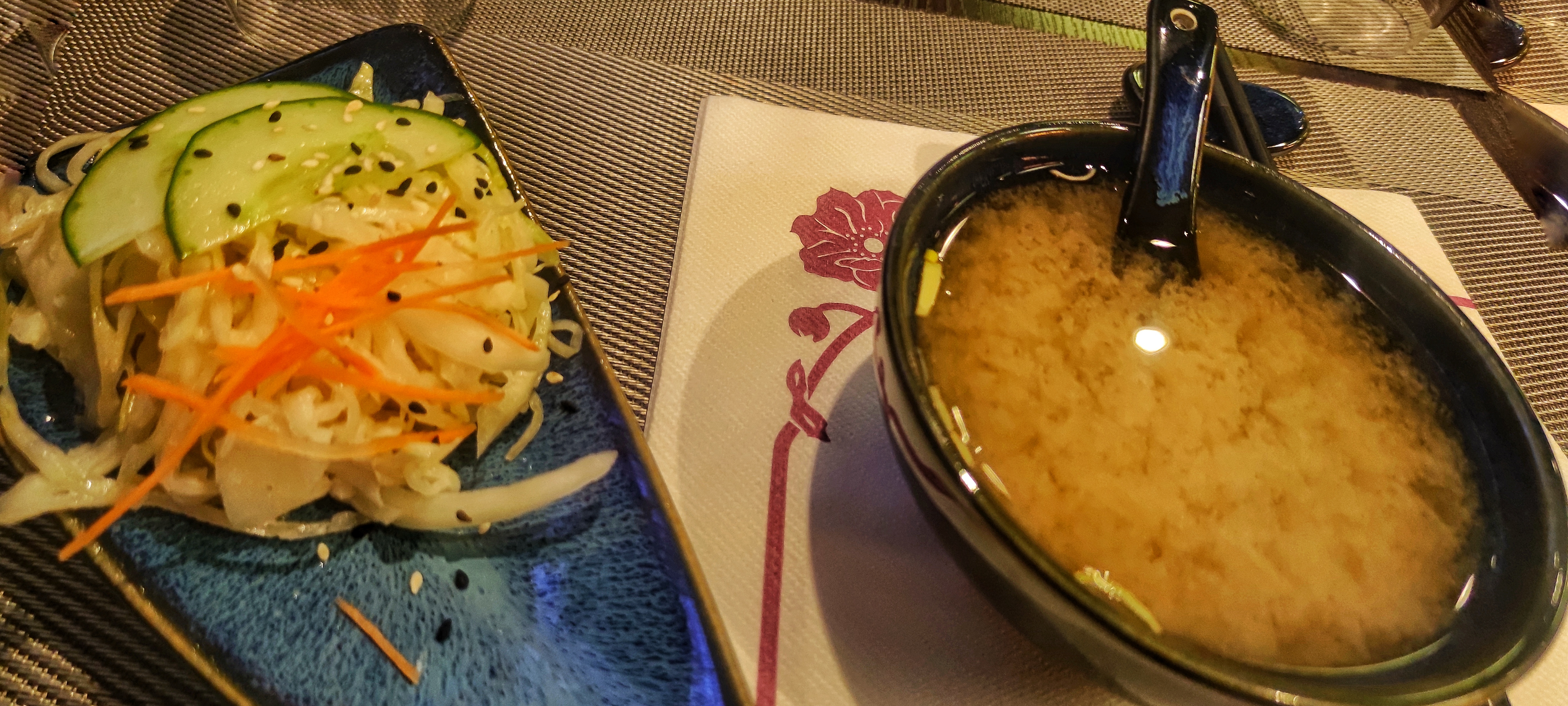 Menu japonais a 13 euros bon et diversifié (soupe, salade, brochettes, nouilles et suchis)