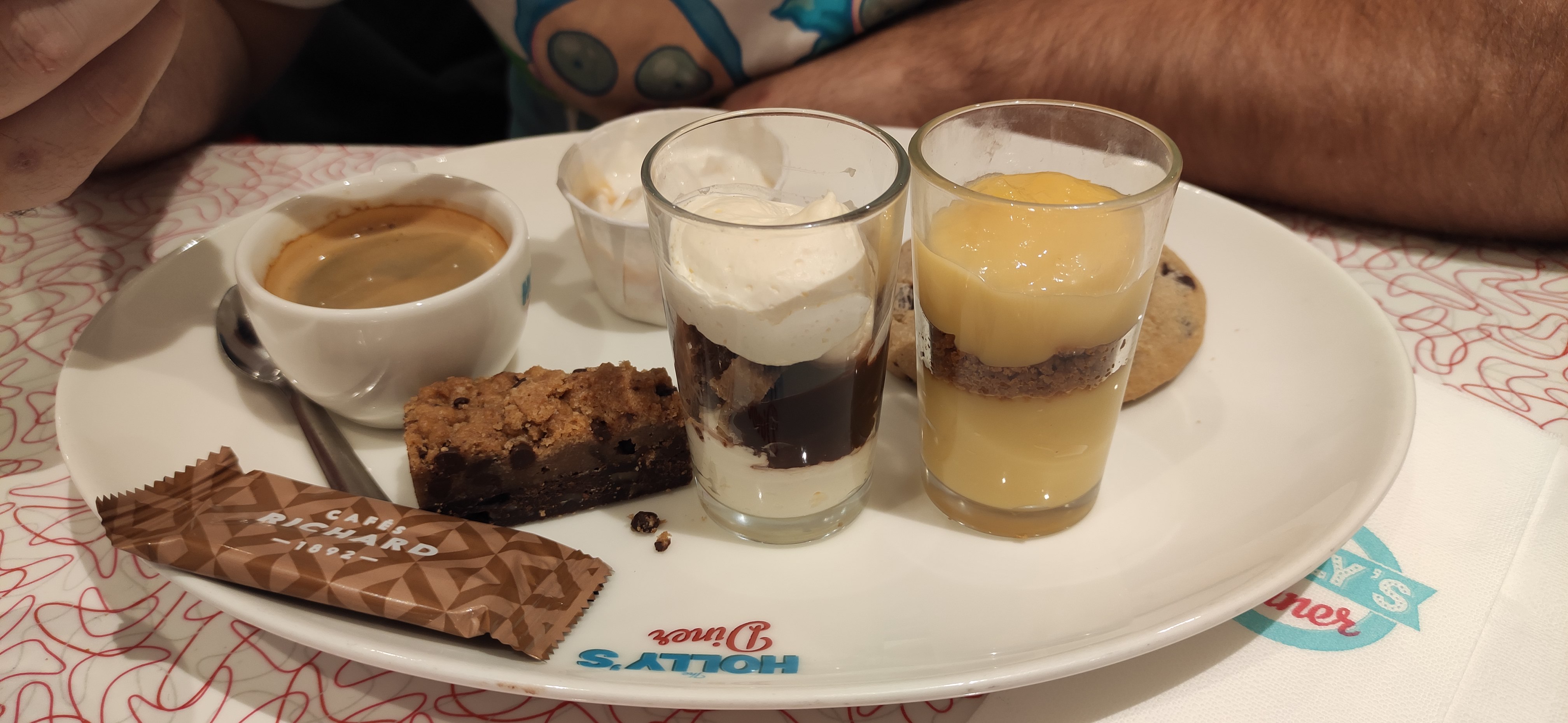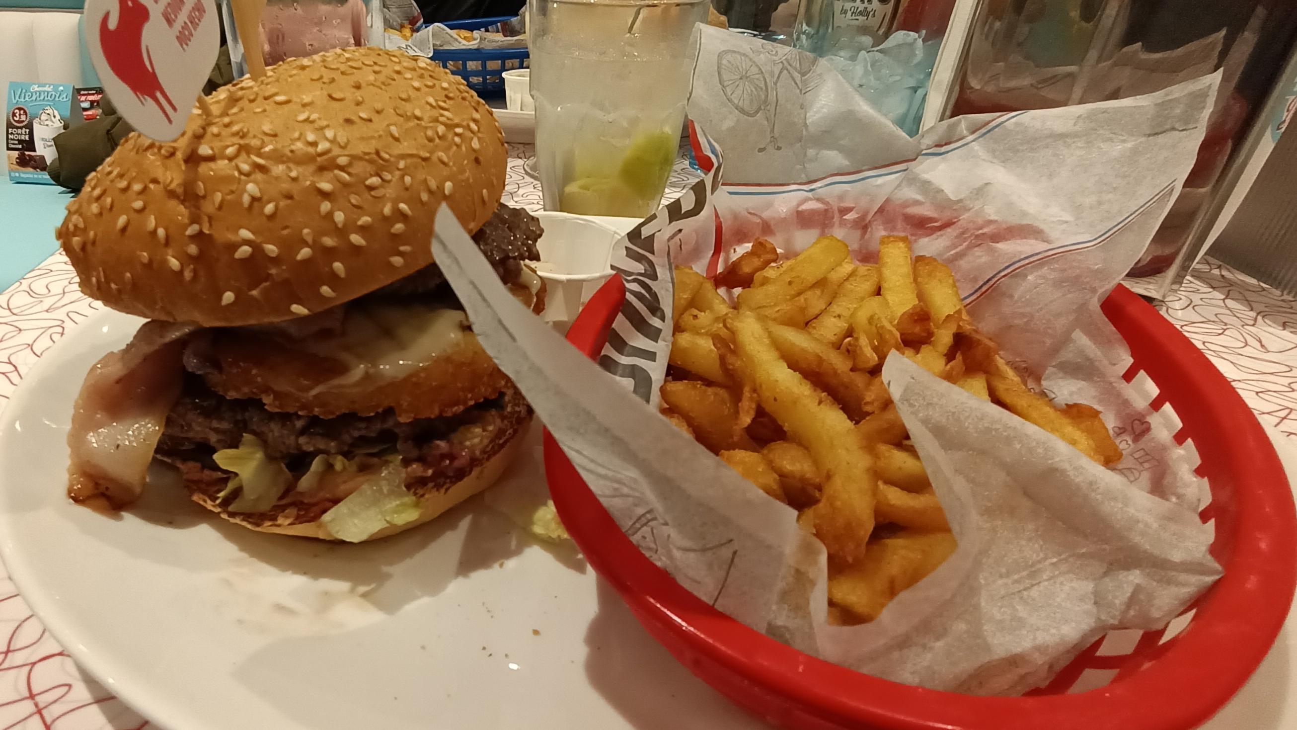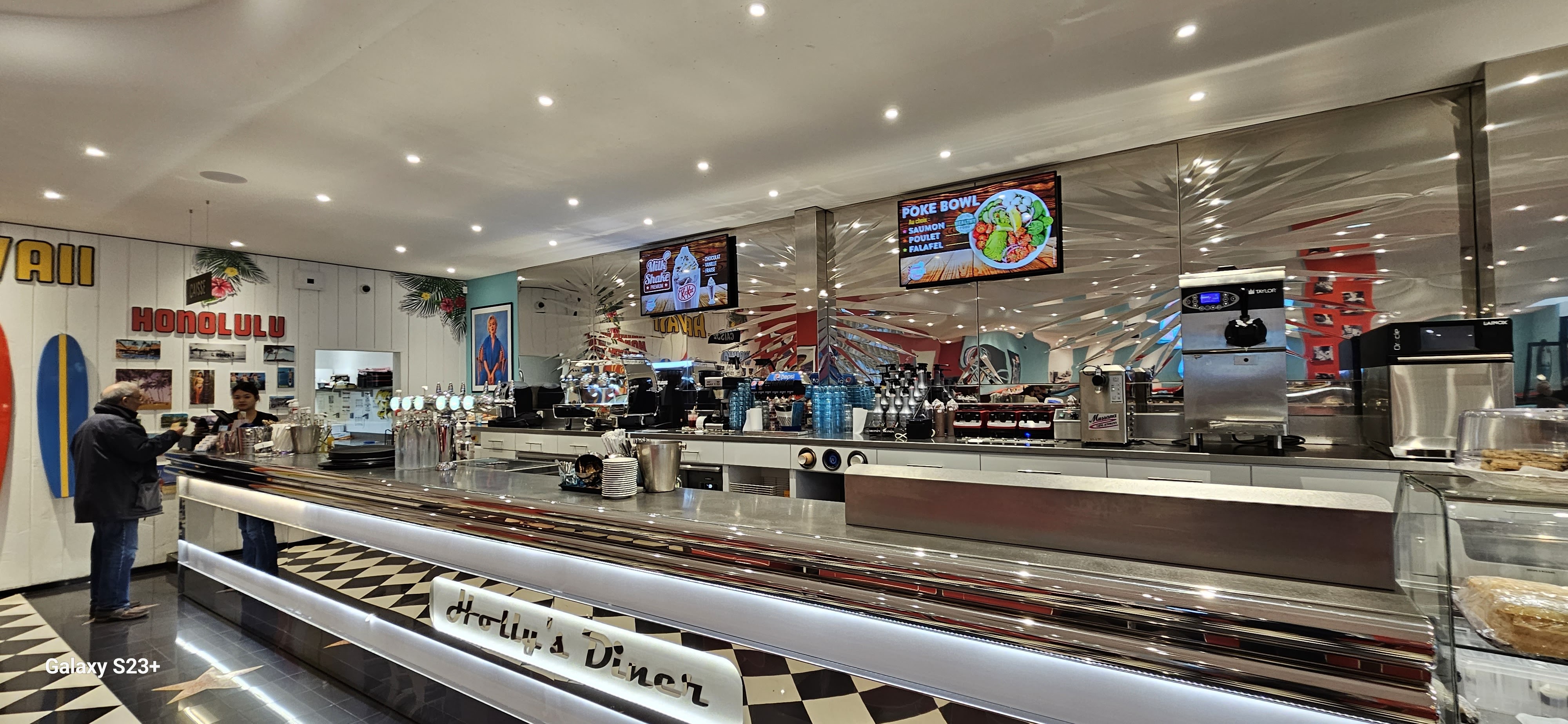 Nous avons choisi Holly’s Diner pour notre pause déjeuner. 2 menus entrée plat dessert pour un total de 37€. Nous avons le choix pour chacun des plats, pas grand chose en choix mais les propositions nous ont convenues. Cependant, la portion de frites était un peu légère, nous avons dû demander une deuxième portion. Je regrette le manque d’attention des serveurs, nous avons dû nous réitérer 2 fois notre demande de frites car le premier serveur avait oublié. Et la deuxième serveuse aussi 😅
