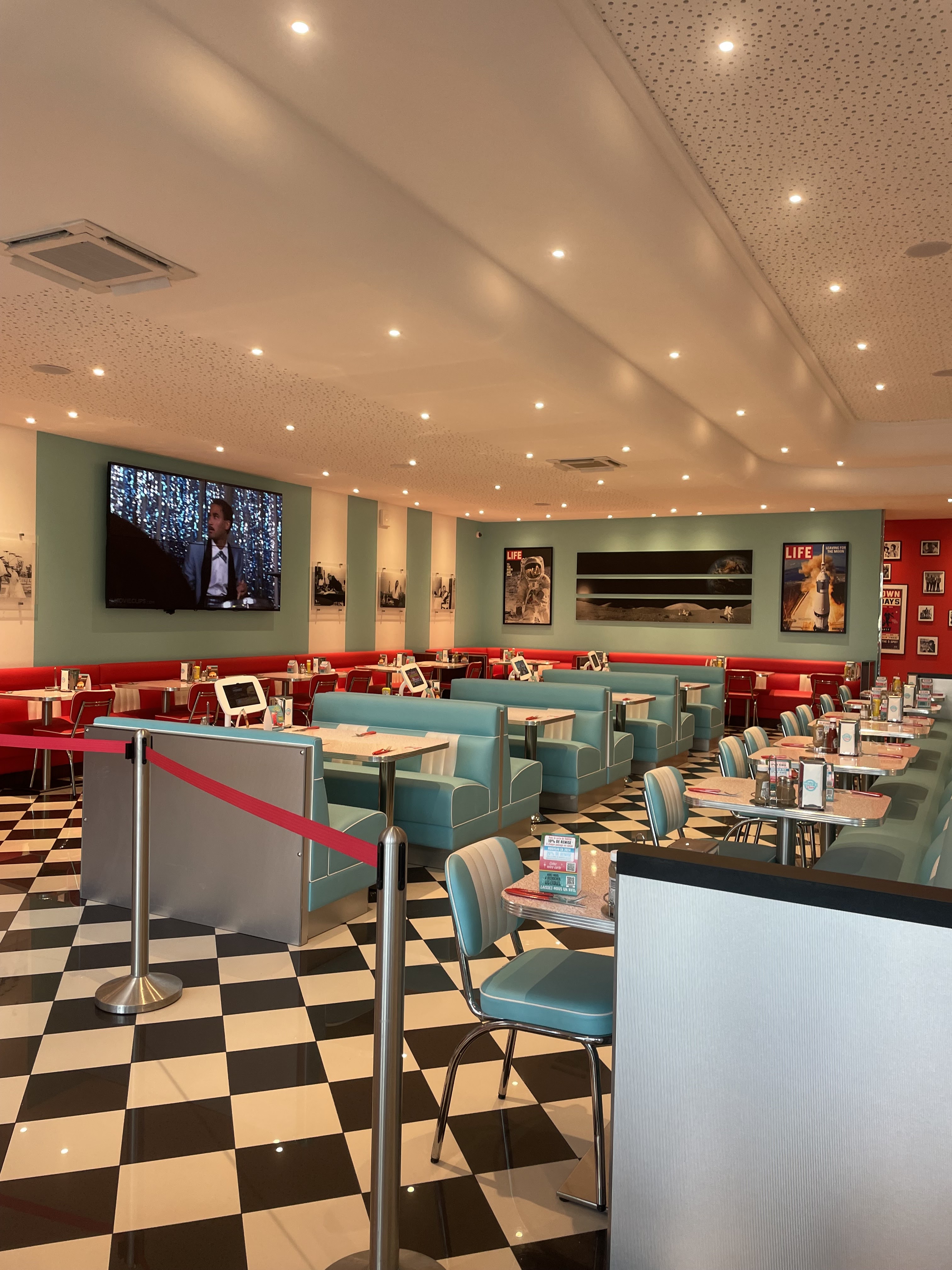 Cadre original sur le thème des coffee shop américain des année 50/60. Possibilité de régler par qrcode sans passer par la caisse. On y trouve également sur certaines table des tablette pour les enfants (après être d'accord ou pas c'est une autre histoire) Personnel sympathique et rapide. Les burgers sont très bon et on y trouve un large choix mais également des viandes et salade. Tarifs peut être un peu élevés.