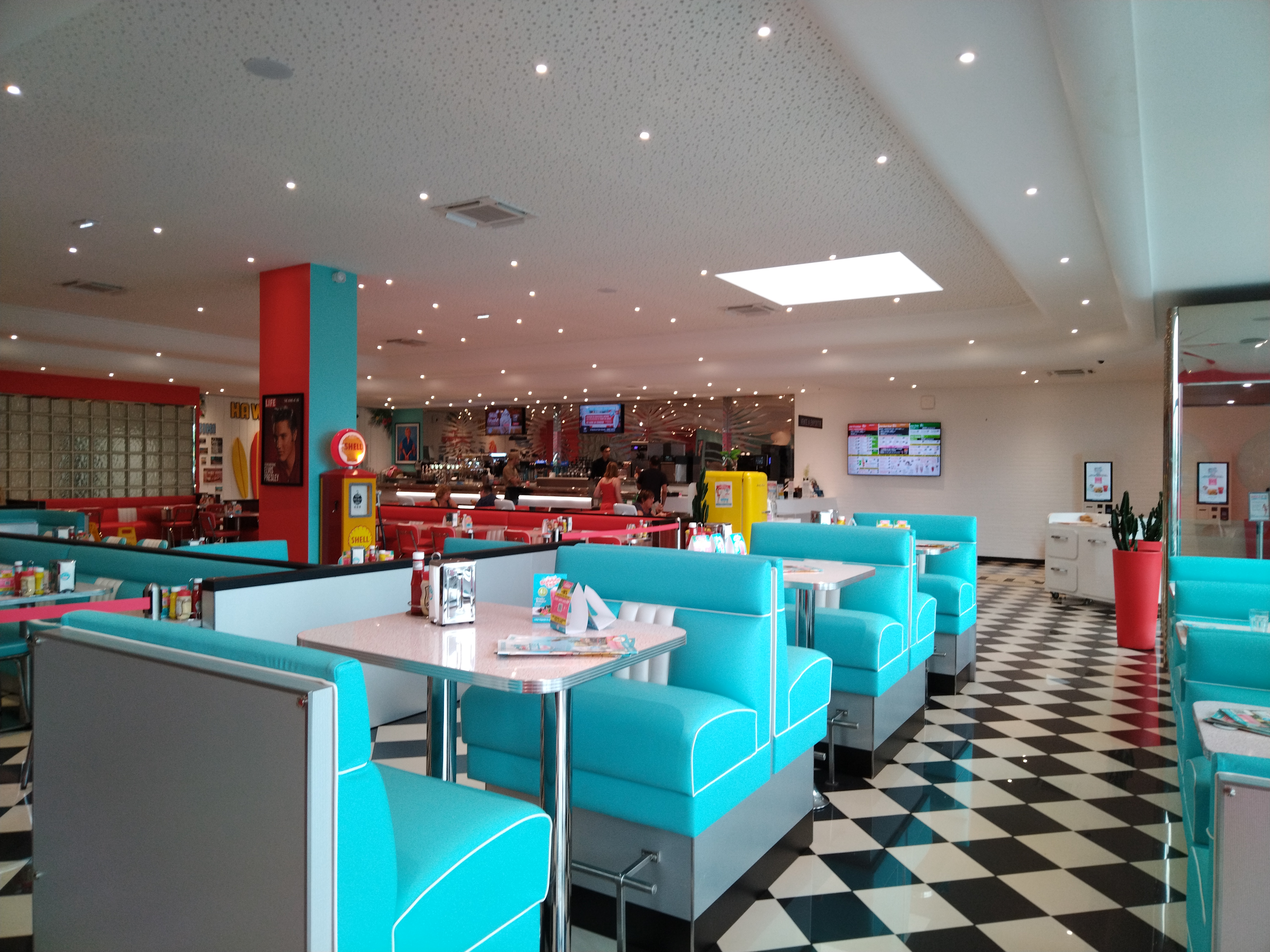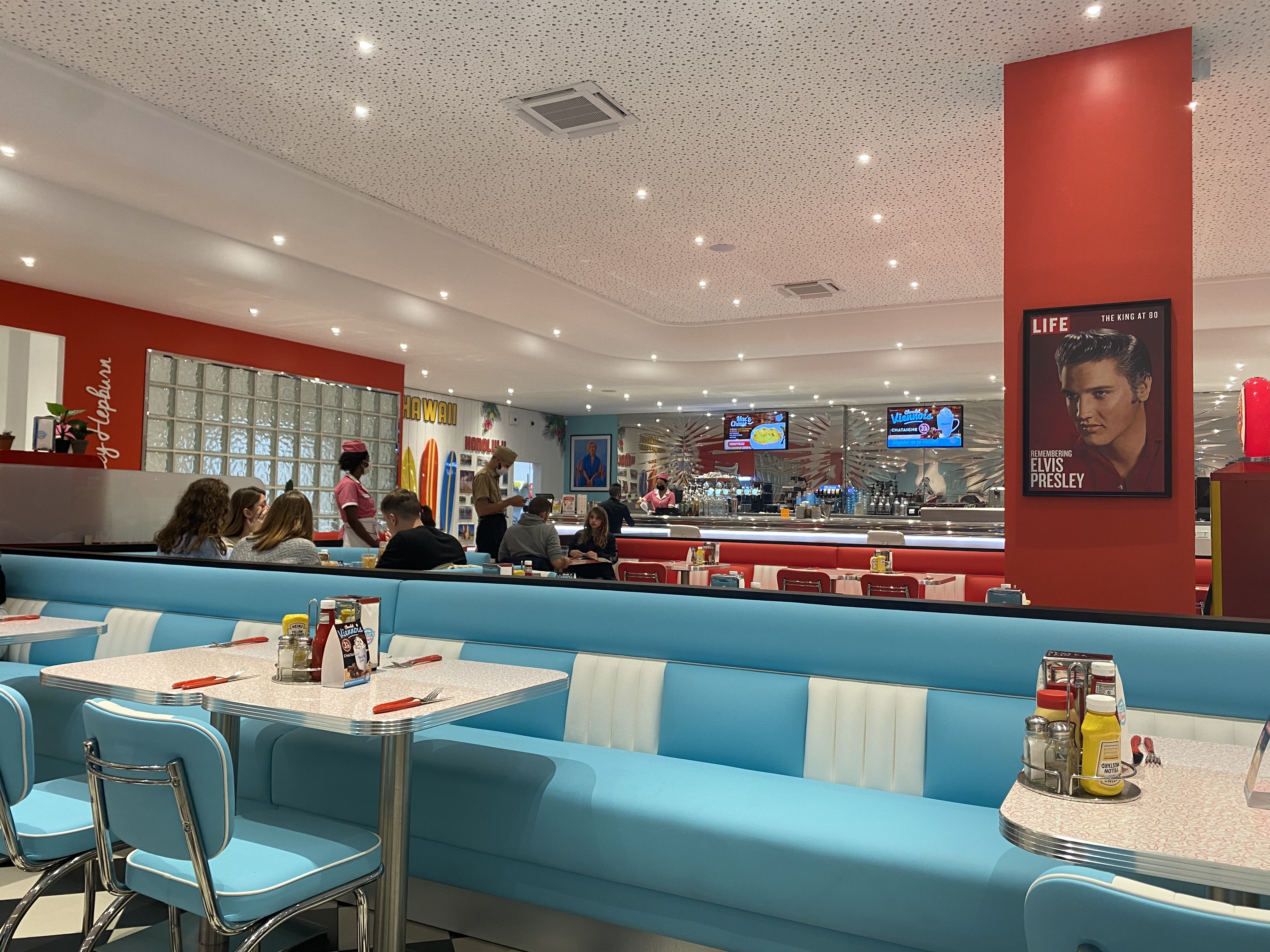 Les serveuses sont très jolies dans leur blouse rose. Le concept est sympa, ambiance Amérique des années 50. Les plats sont bons : burgers, viandes, salade et poke bawls. Variété de cocktails avec ou sans alcool. Desserts variés. Service rapide malgré le monde. Un peu trop bruyant à mon goût mais c'est le concept. Très bien pour un repas entre amis ou en famille. Il y a aussi un espace de jeux pour les enfants.