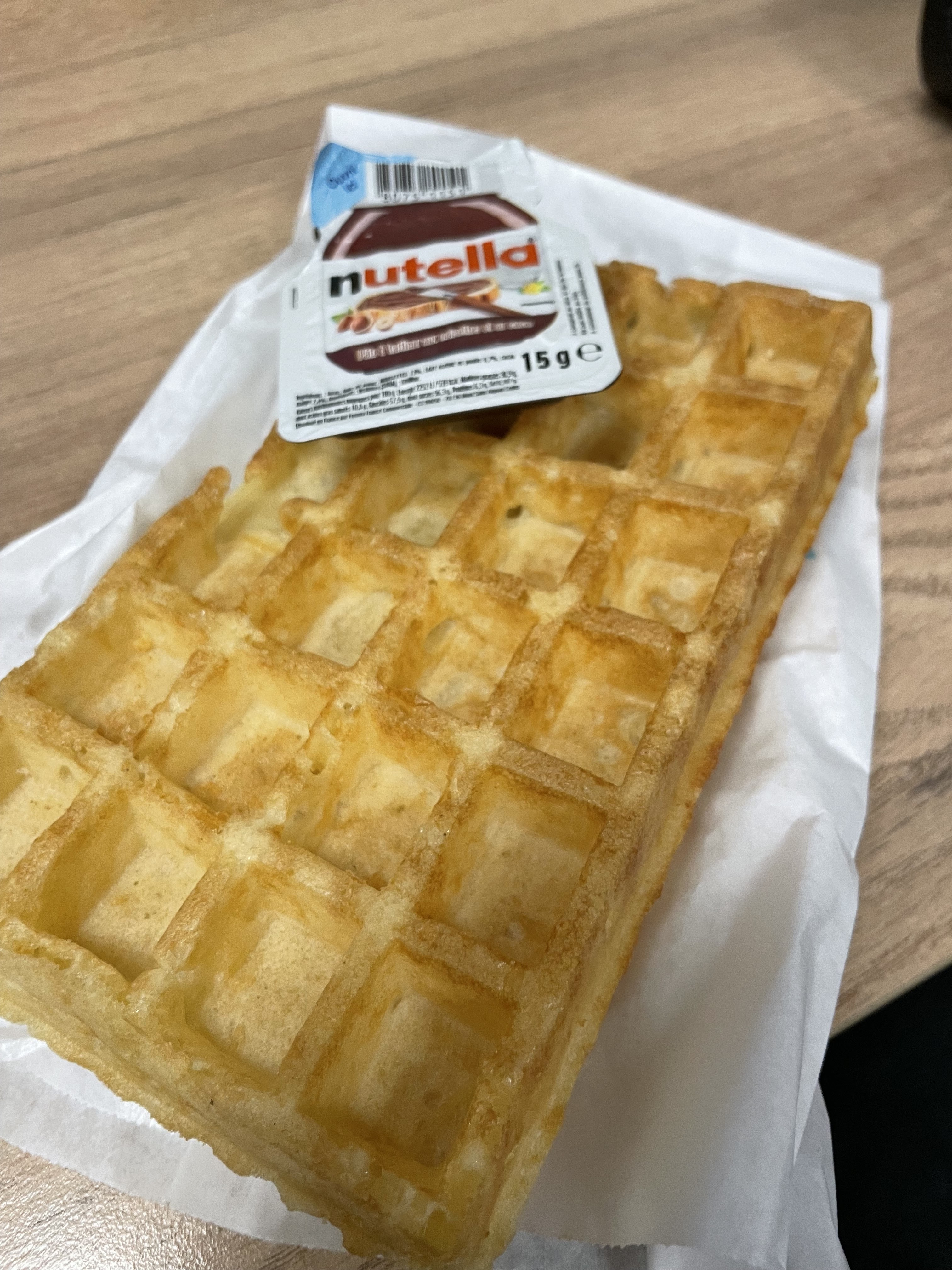 Voilà ce que vous recevez lorsque vous commandez une gaufre au nutella à 4€60 Une honte. Gaufre froide, surgelée évidemment avec du nutella emballé et seulement 15g, soit rien du tout. Attente de 35m pour 5 misérables gaufres comme celles ci, à fuir.