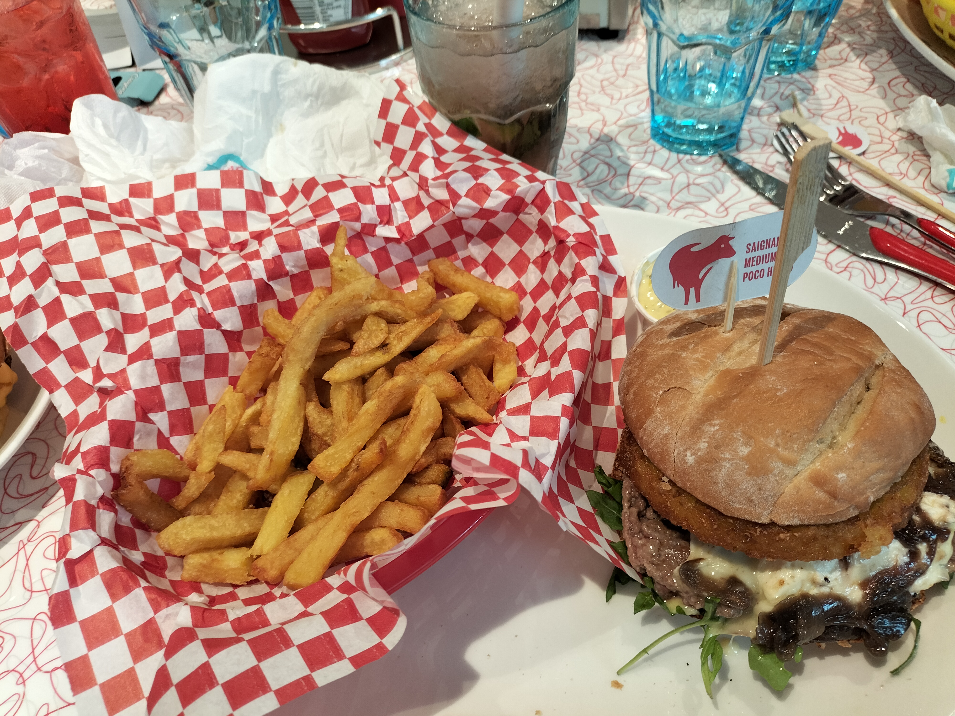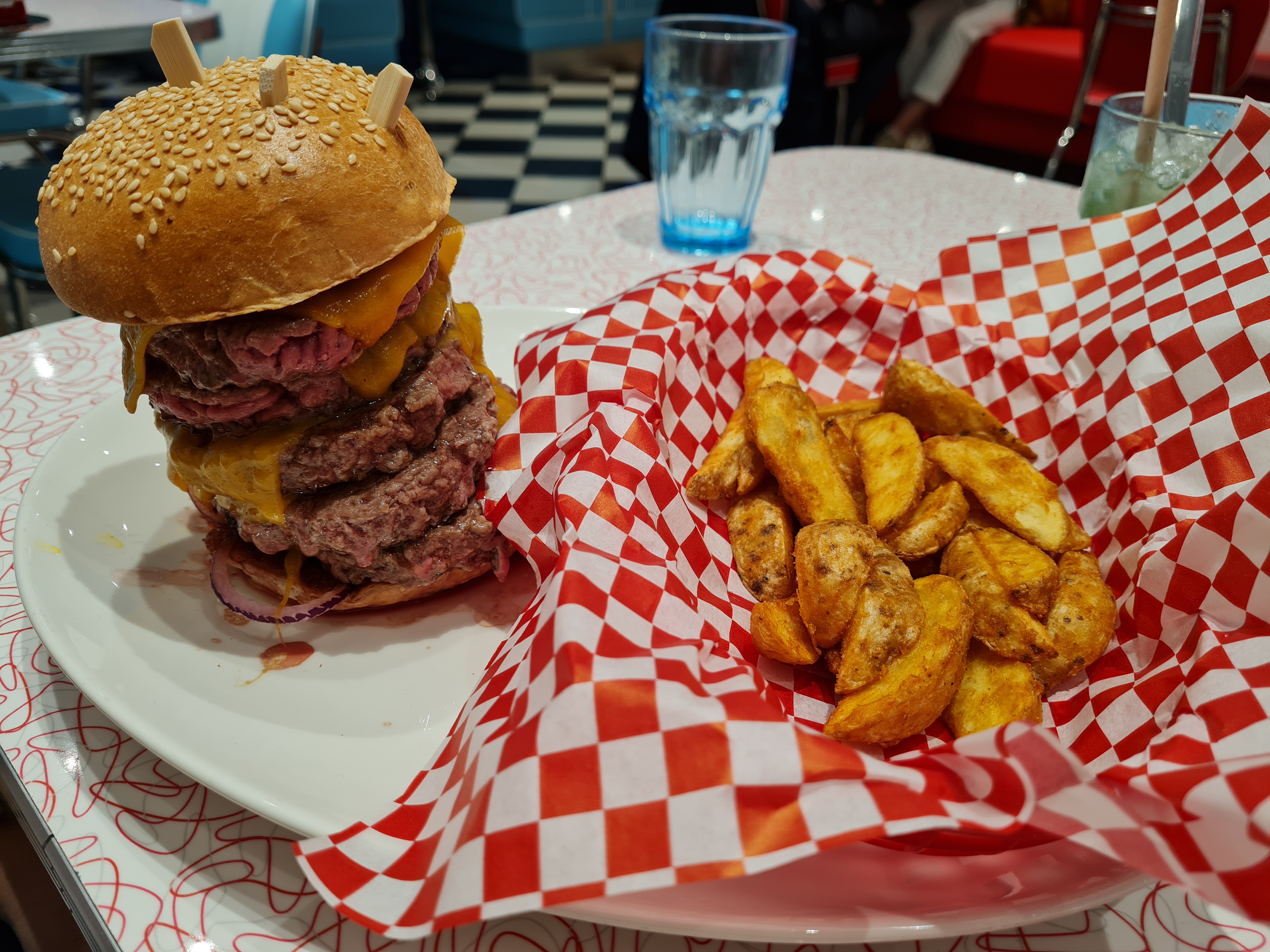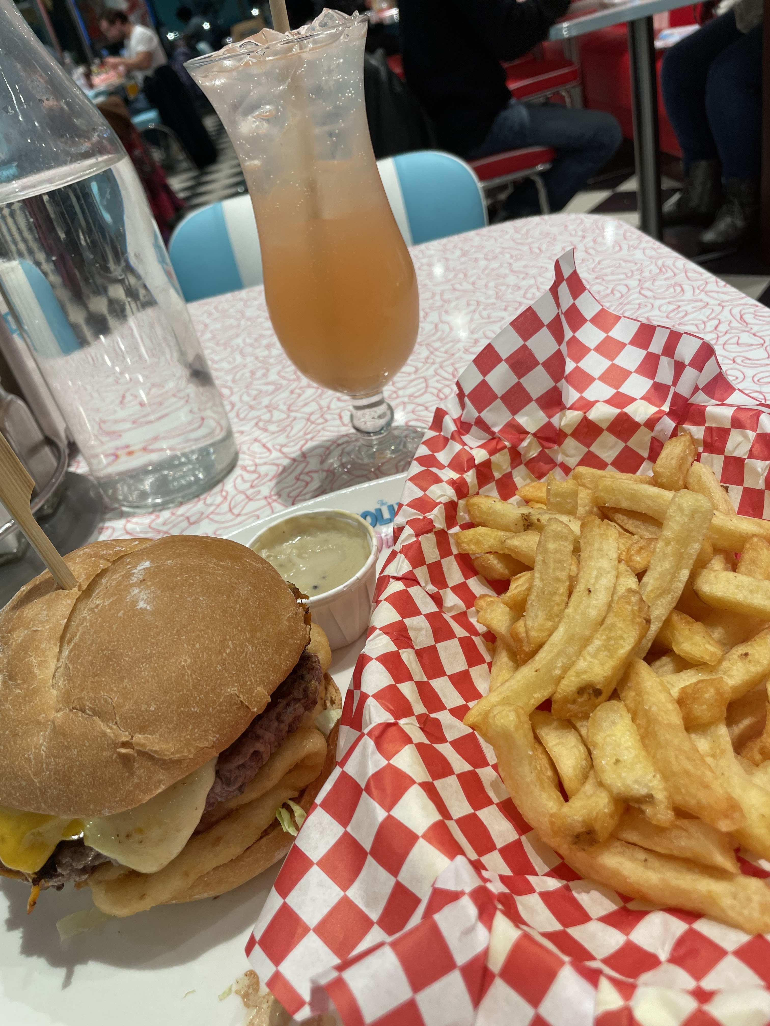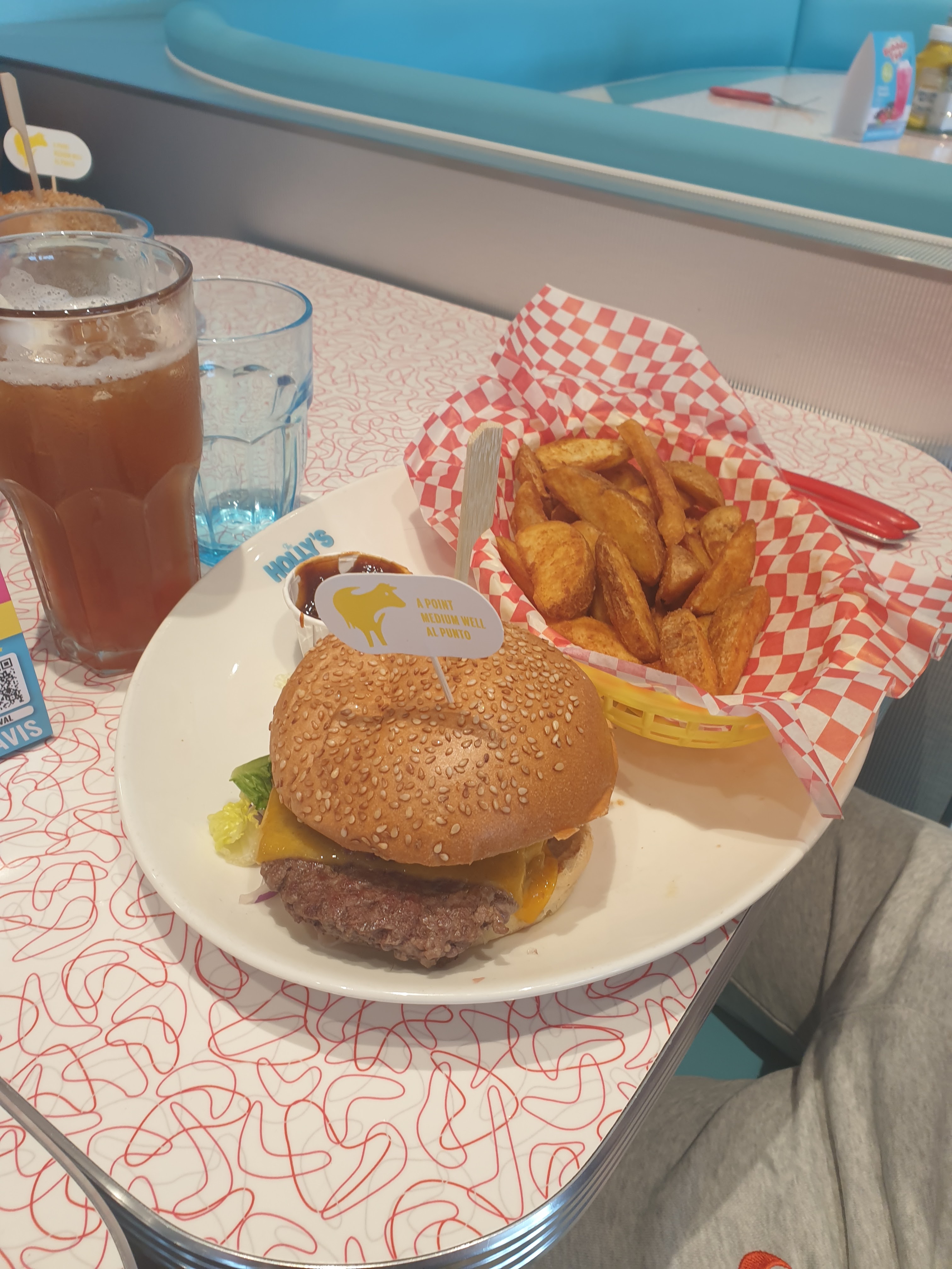 Je pense ne pas être bon client pour ce genre de restaurant. Pour moi c'est un burger de plus mais avec le charme des années sixties americano. Lieu agréable pour l'ambiance générale. Pour la cuisine carte compliquée à déchiffrer. Les frites maison sèches et froides,dommage. Cheeseburger classique, steak mini. Les nuggets sont corrects pour un menu kid. Service très long pour un midi. Il y a du personnel mais peut-être organisation à revoir.