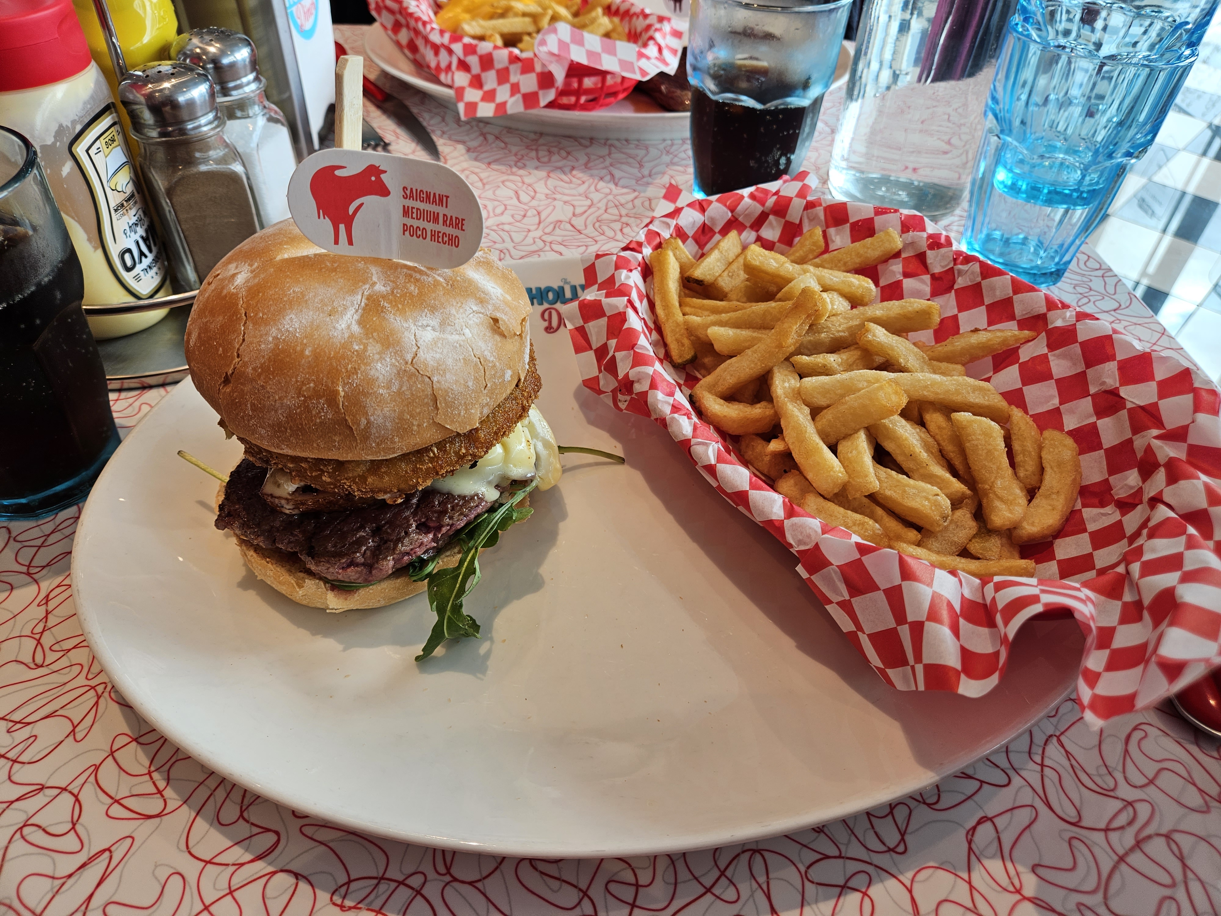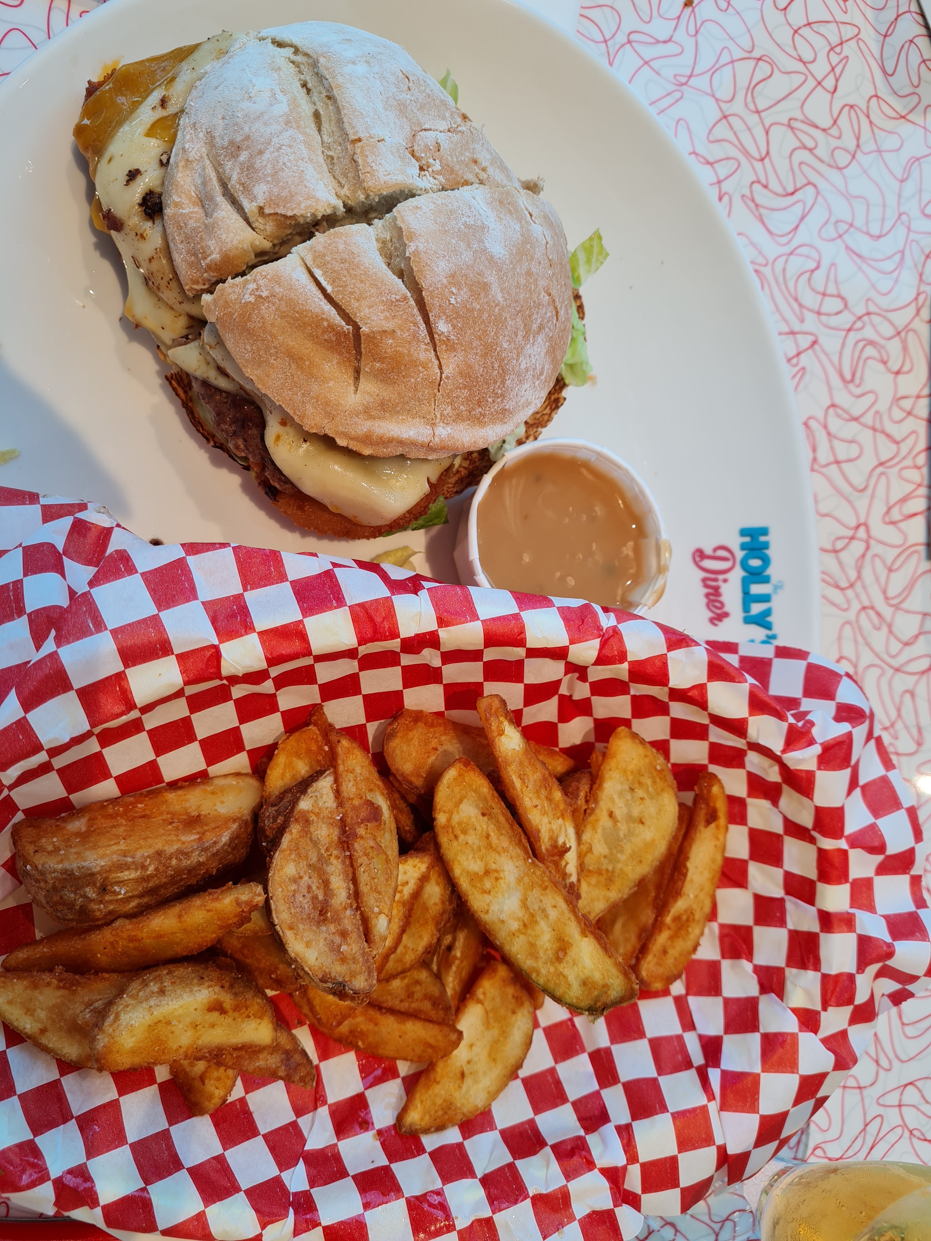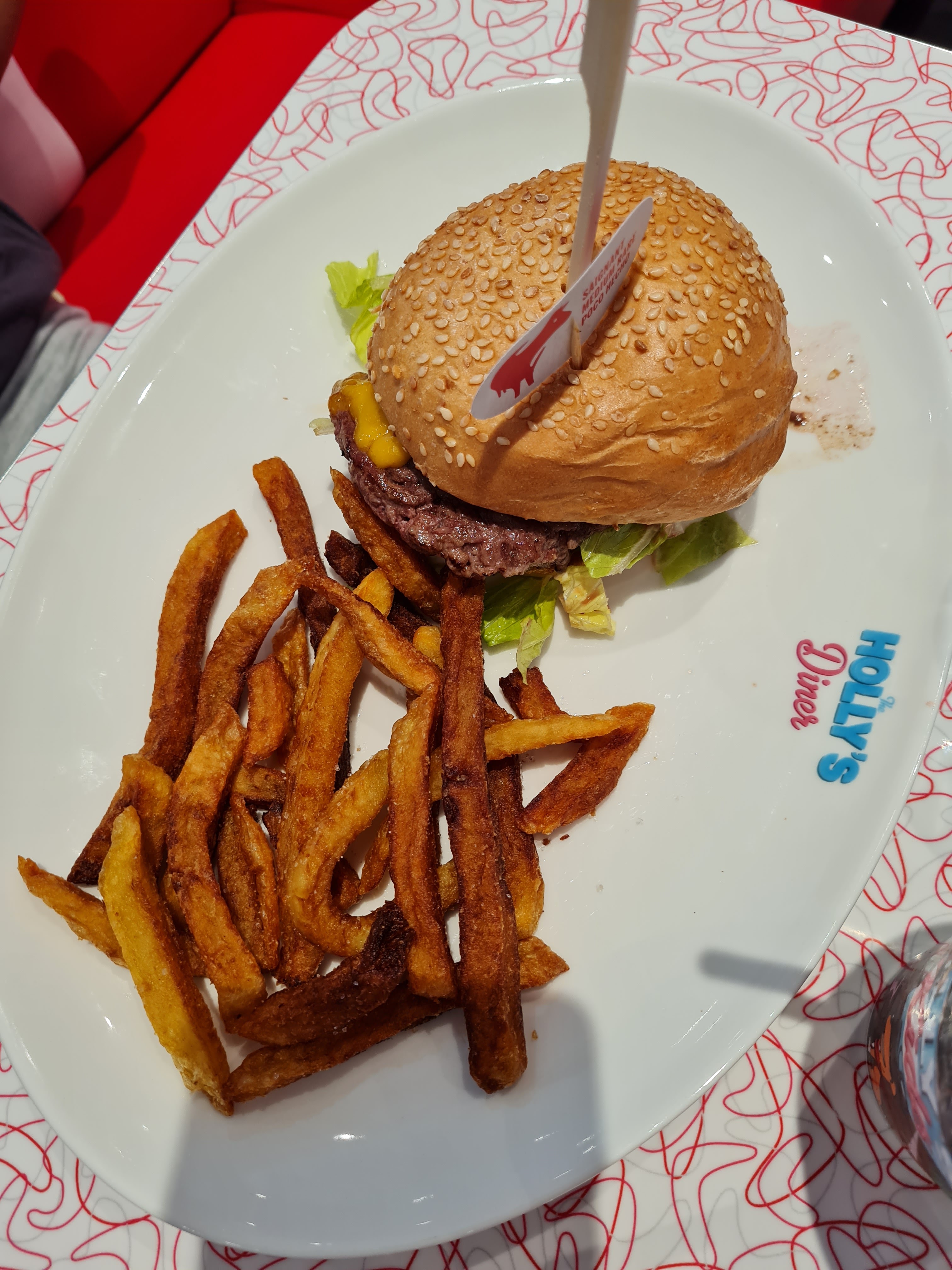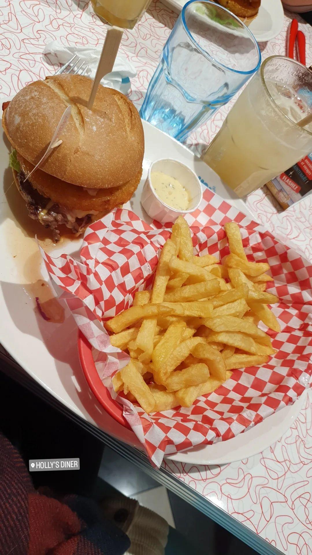 Mon expérience au restaurant Holly’s Diner a débuté avec une arrivée glaciale, le serveur nous a amené à notre table sans un bonsoir ni un regard, ce qui était décevant. Cependant, l'entrée classique était très généreuse. Le burger et les frites étaient bons, bien que la composition du burger ne corresponde pas entièrement à mes goûts personnels. Cependant, je suis convaincu que cela plaira à d'autres. Heureusement, un deuxième serveur est intervenu par la suite, beaucoup plus jovial et sympathique, ce qui a amélioré notre expérience. En fin de compte, la fin du repas s'est bien déroulée.