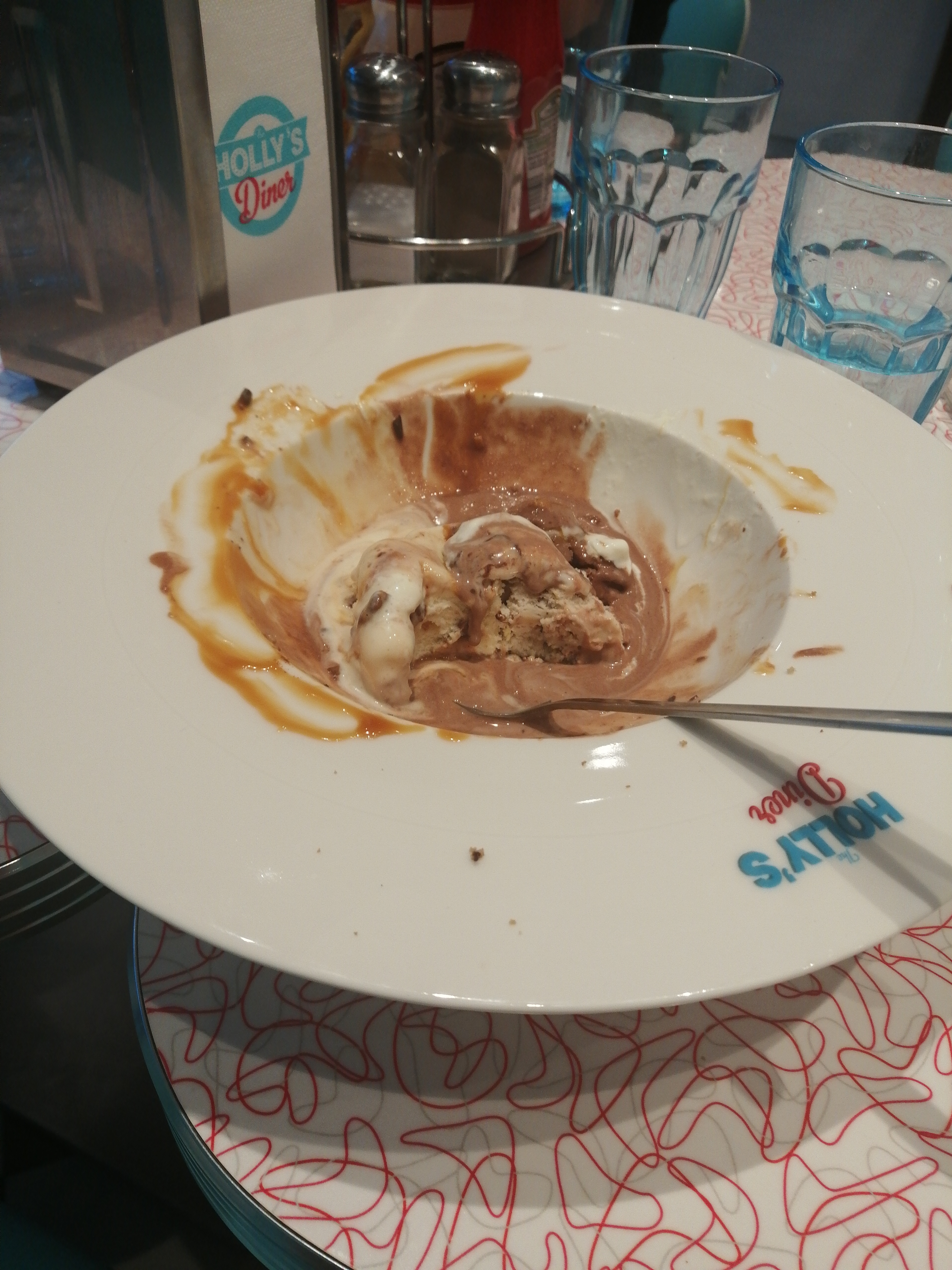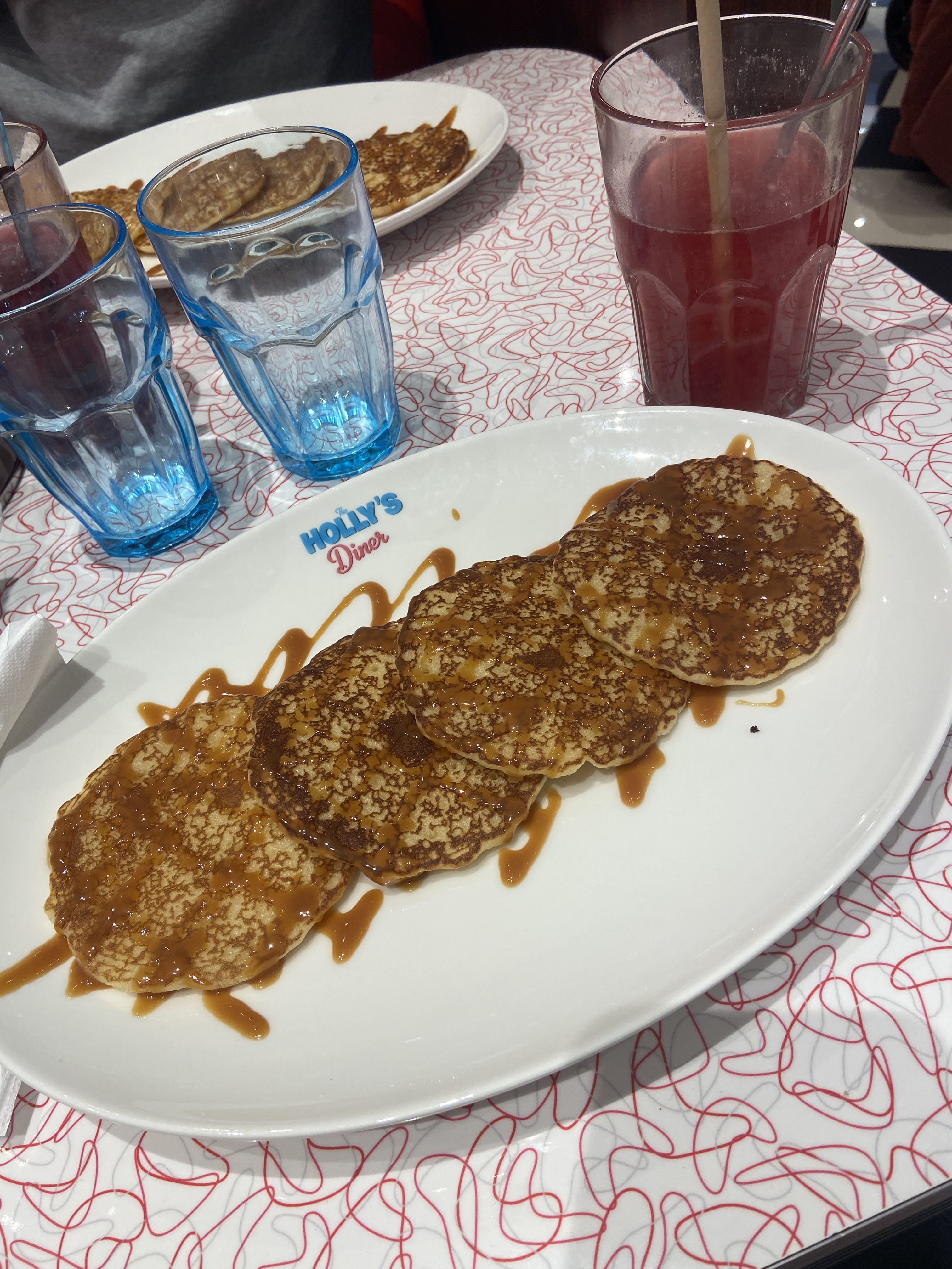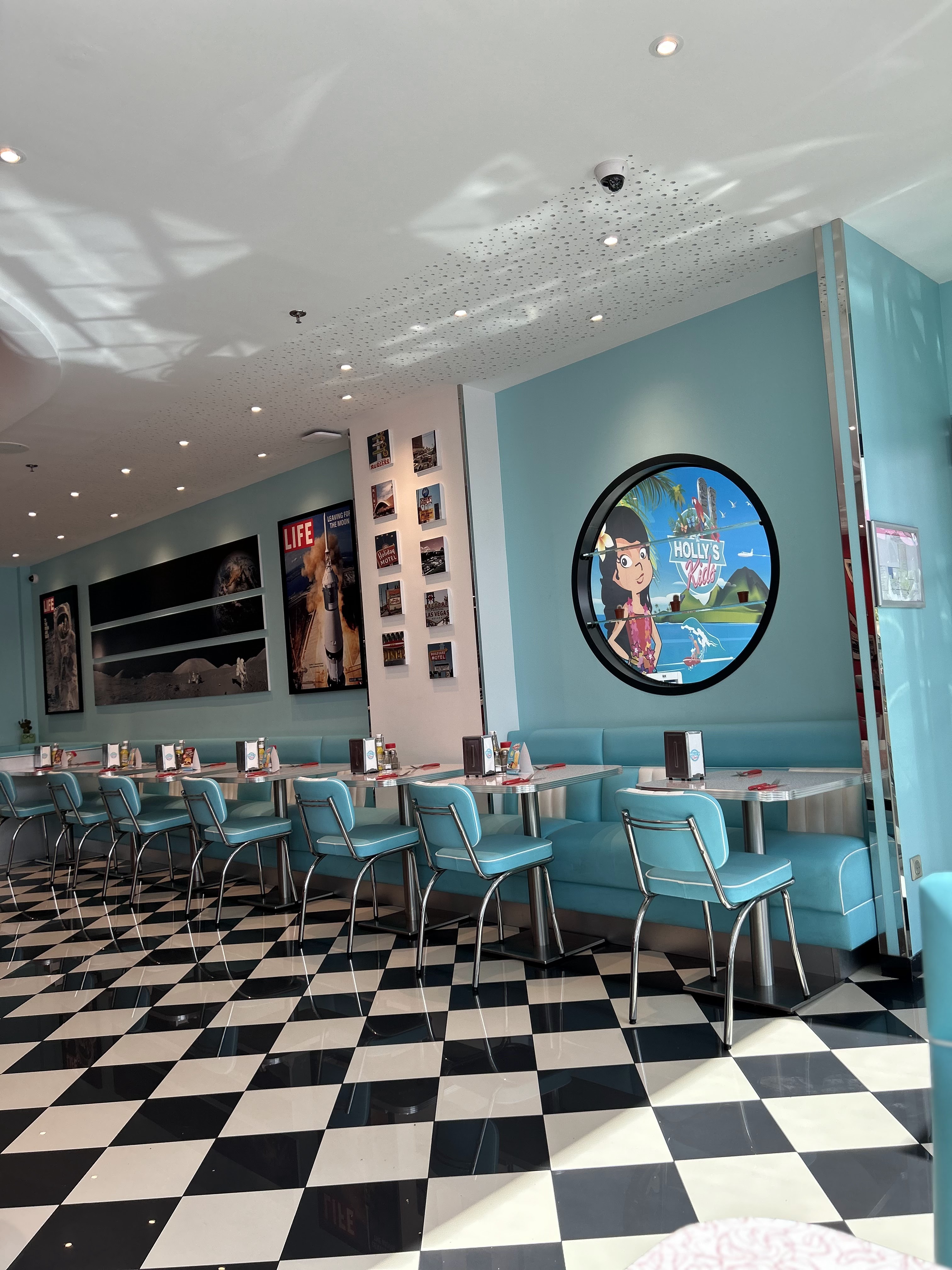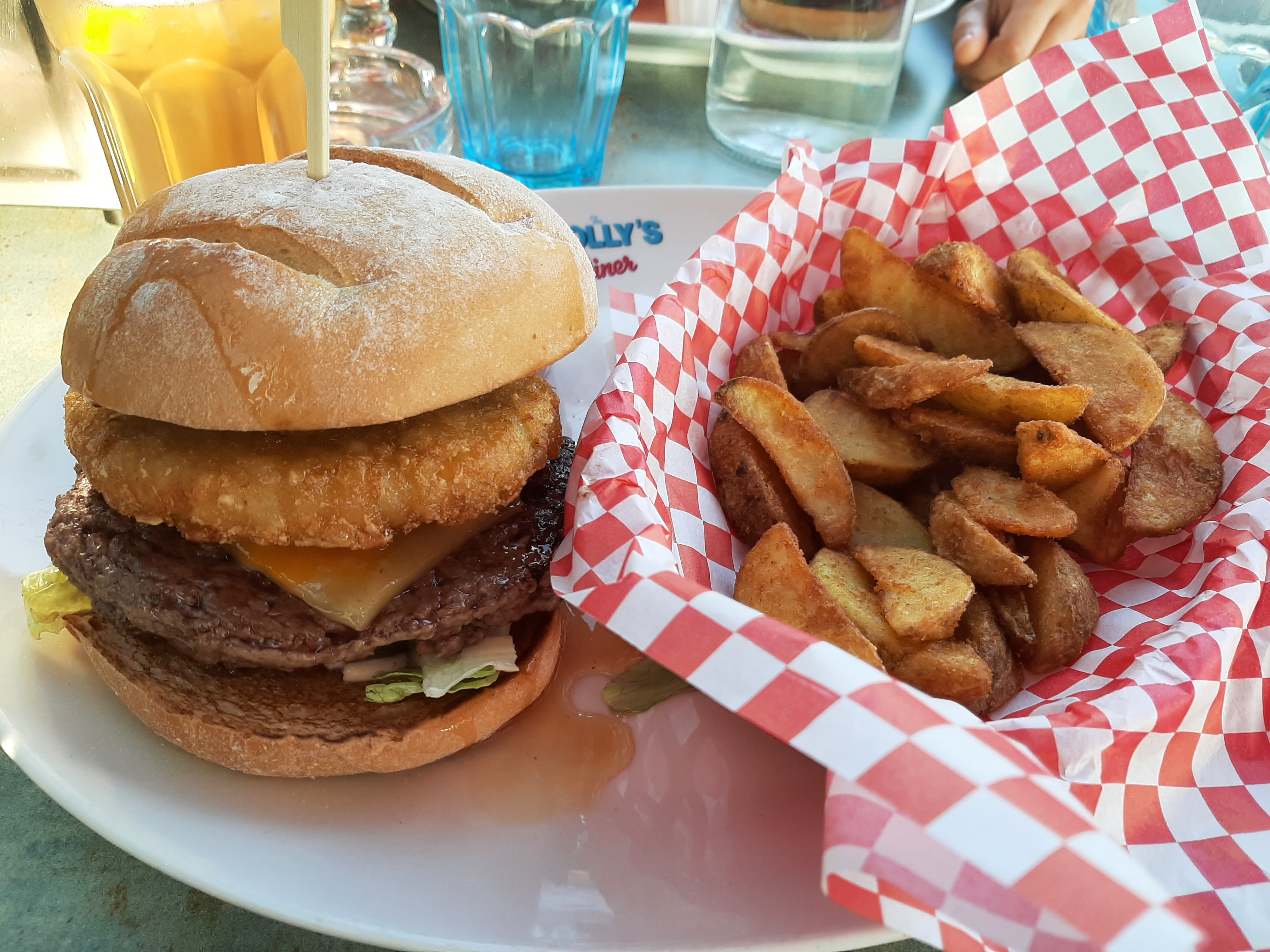 Mon expérience au restaurant Holly’s Diner a débuté avec une arrivée glaciale, le serveur nous a amené à notre table sans un bonsoir ni un regard, ce qui était décevant. Cependant, l'entrée classique était très généreuse. Le burger et les frites étaient bons, bien que la composition du burger ne corresponde pas entièrement à mes goûts personnels. Cependant, je suis convaincu que cela plaira à d'autres. Heureusement, un deuxième serveur est intervenu par la suite, beaucoup plus jovial et sympathique, ce qui a amélioré notre expérience. En fin de compte, la fin du repas s'est bien déroulée.