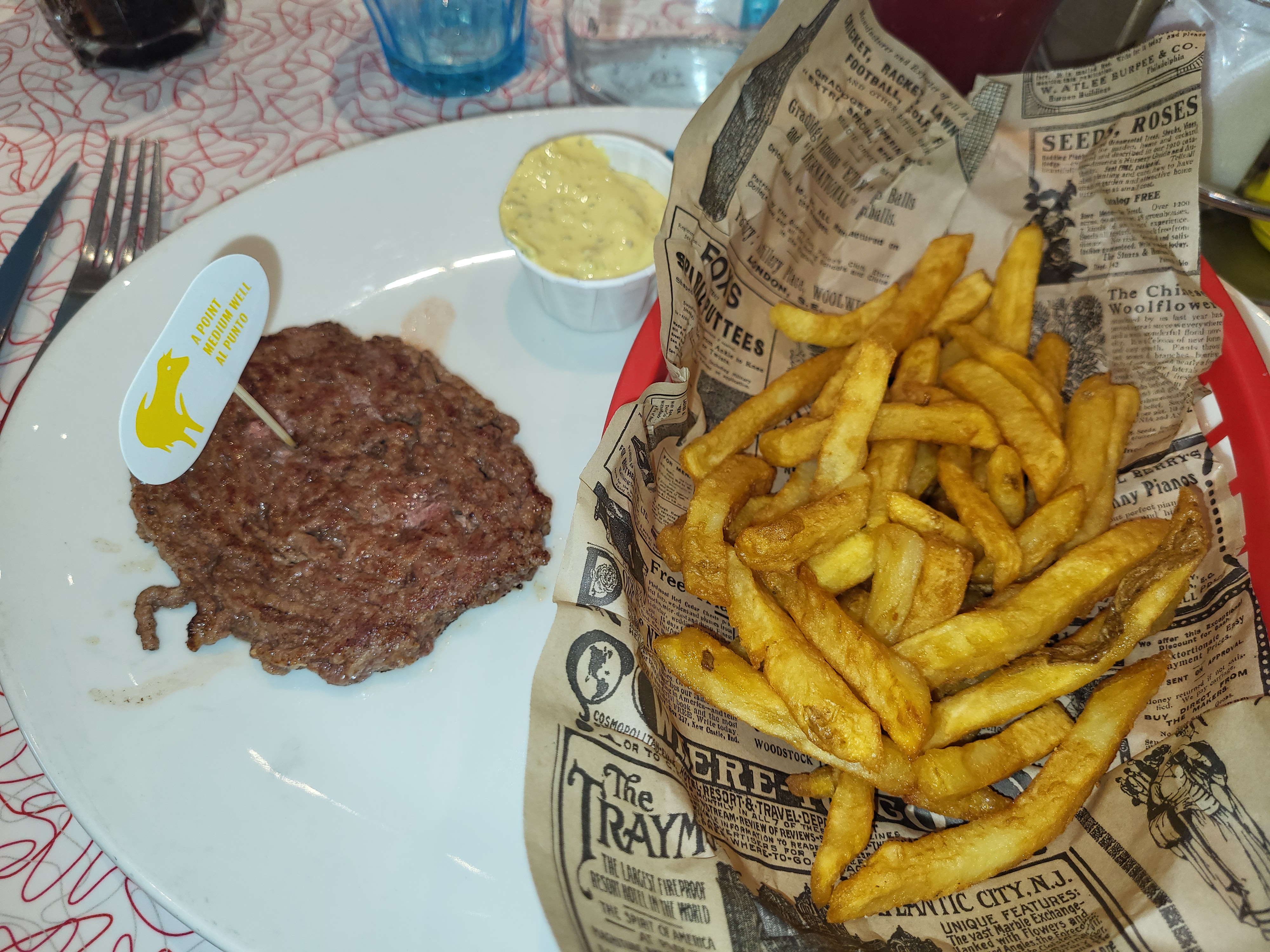 Je peux dire sans mal que les plats sont très copieux mais très bons. Malheureusement je n'arrive pas à terminer l'assiette. La salle et les uniformes en font un lieu pleins de charme. Ils respectent la cuisson de la viande dans le burger. Je recommande.