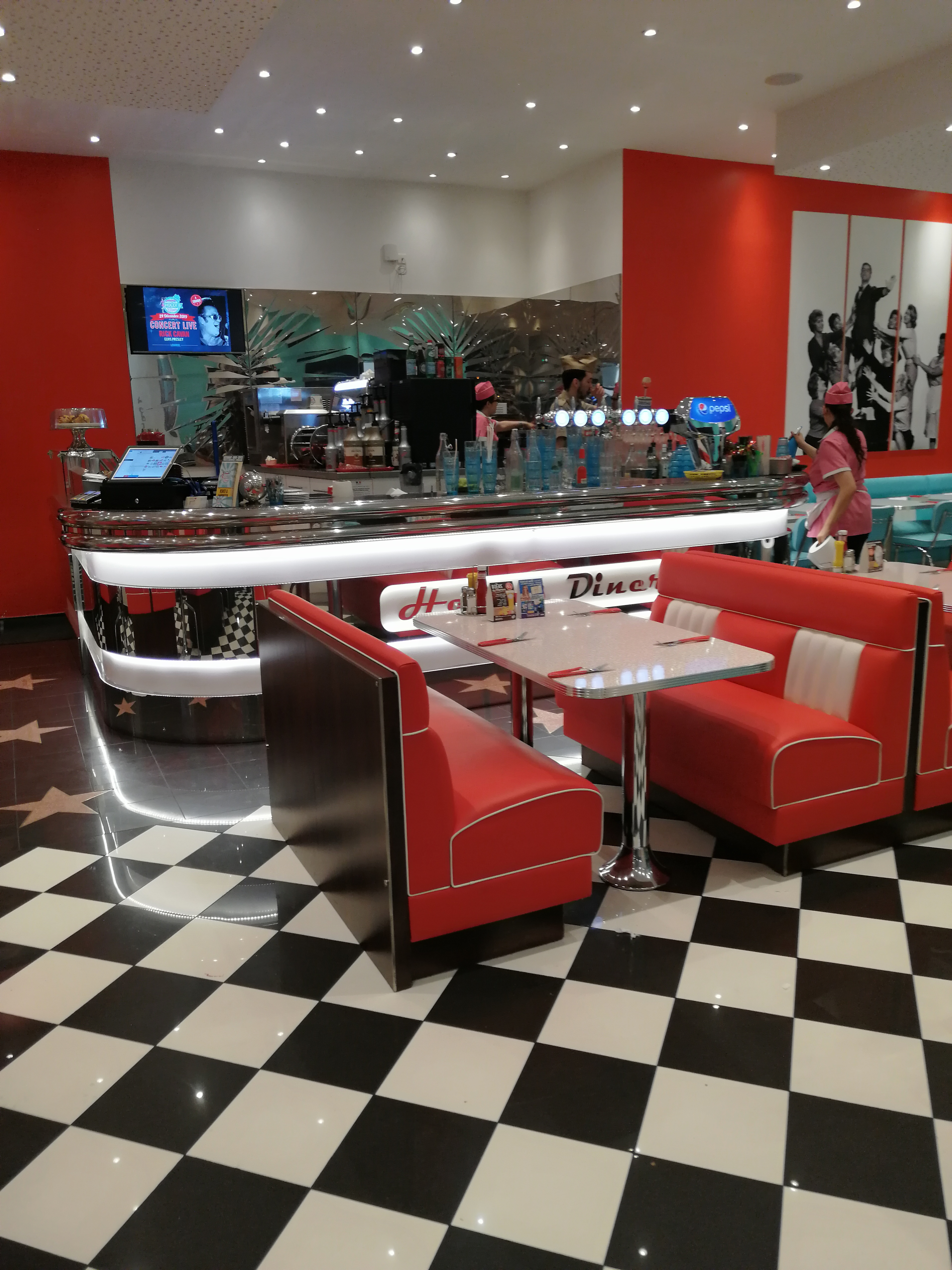 Quelle atmosphère incroyable. Bon restaurant rétro américain. Lorsque vous entrez, vous remontez le temps. C'est juste wow. Quand j'étais là pour dîner le soir, ce n'était pas complet. Seulement 2 tiers. Il y a de très belles places pour les célibataires, les couples et les groupes. Le service est bon et ils font vraiment de leur mieux. Les prix sont normaux et la nourriture est bonne. Et j’ai adoré la musique qu’ils jouaient à l’époque. Quand je serai dans le quartier, j'adorerais y revenir.