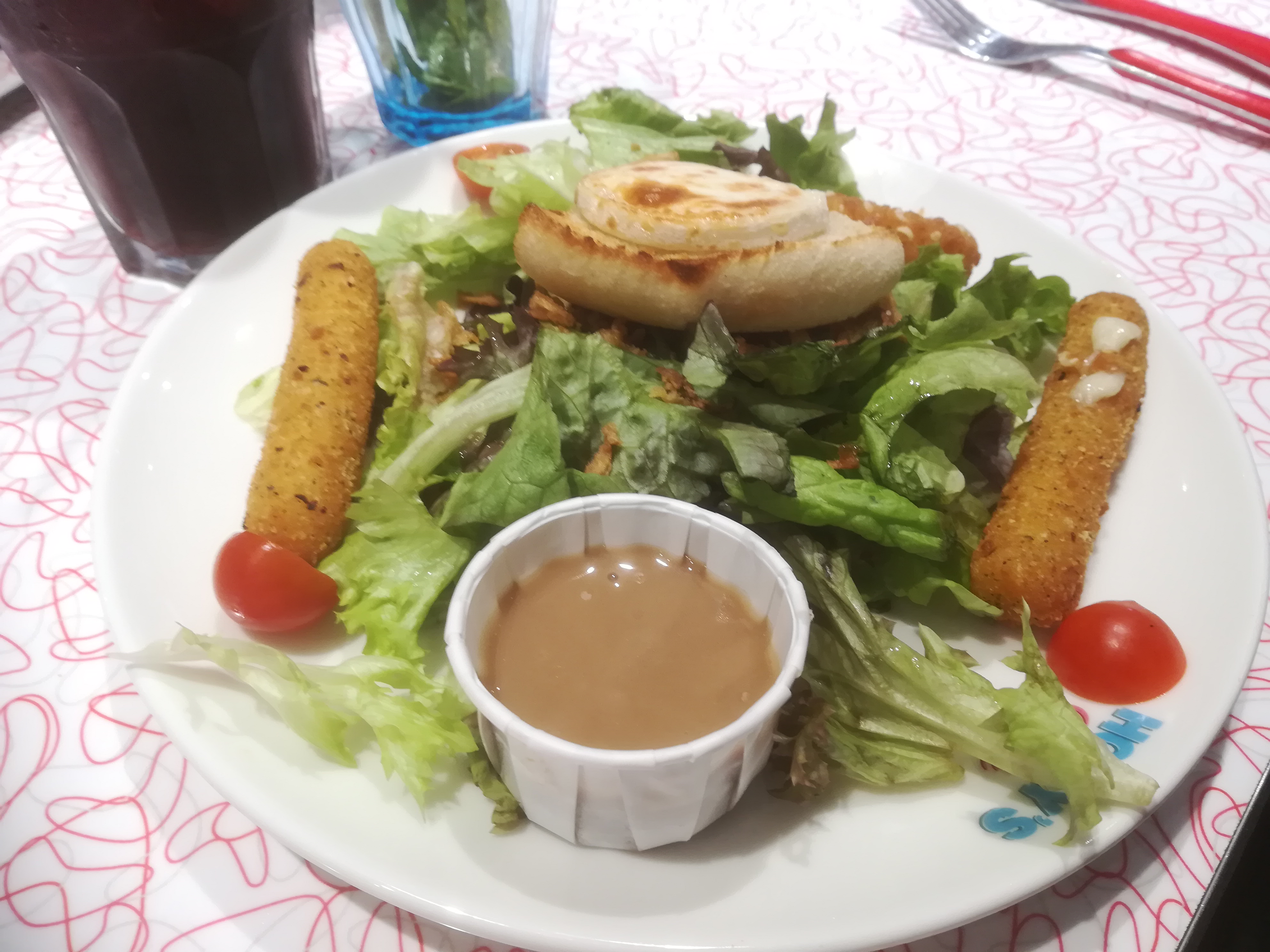 1h30 avant de pouvoir être servis ! 45 minutes d’attente (entre 15 et 30 annoncées à notre arrivée) et 45 autres minutes entre l’installation et le service. Pour une petite salade qui ne valait pas 9,50€ à mon sens… Très bruyant et nous sentions le froid…