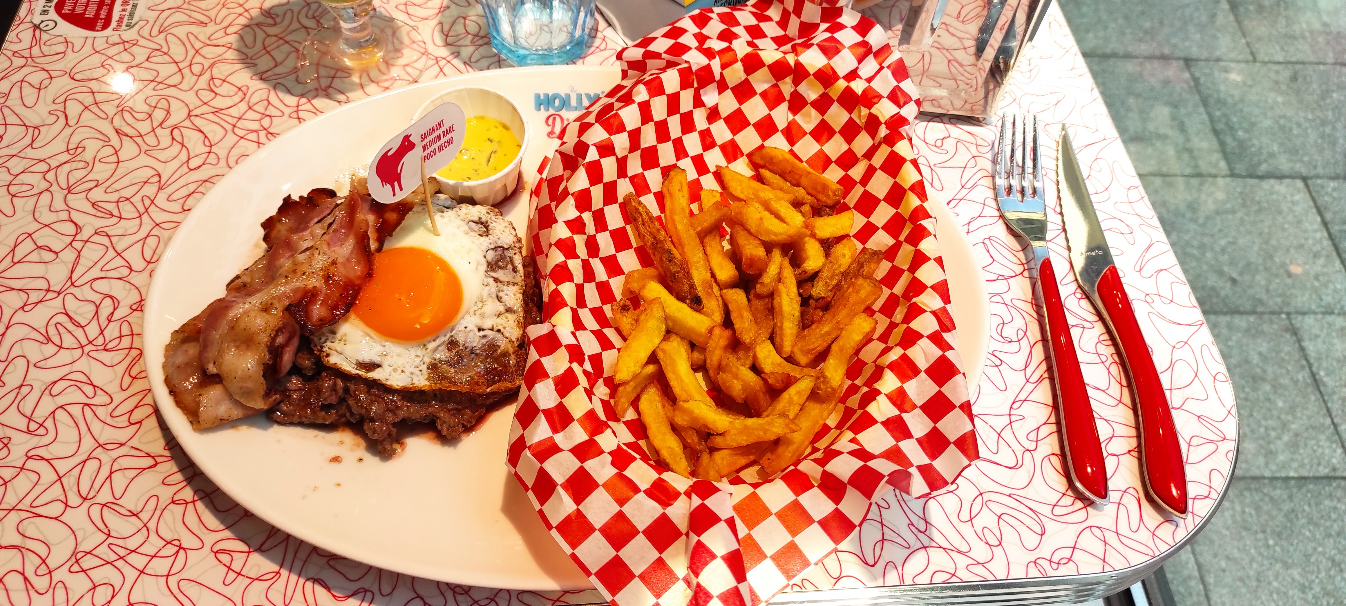 Je vais commencer par le positif : bon burger et bonnes frites et les serveurs sont sympathiques. Le monsieur à la caisse (le patron ?) n'est pas très agréable. La musique est trop forte. On n'est pas très bien assis et trop près les uns des autres alors qu'il y a pleins de tables inoccupées. Mon steak était à point alors que j'avais demandé bien cuit. Les desserts sont fades (pancakes farineux) et trop lourds (café gourmand). Les toilettes étaient très sales également. Nous avons essayé mais nous ne reviendrons pas. PS: c'est une faute de mettre the devant Holly's Diner.